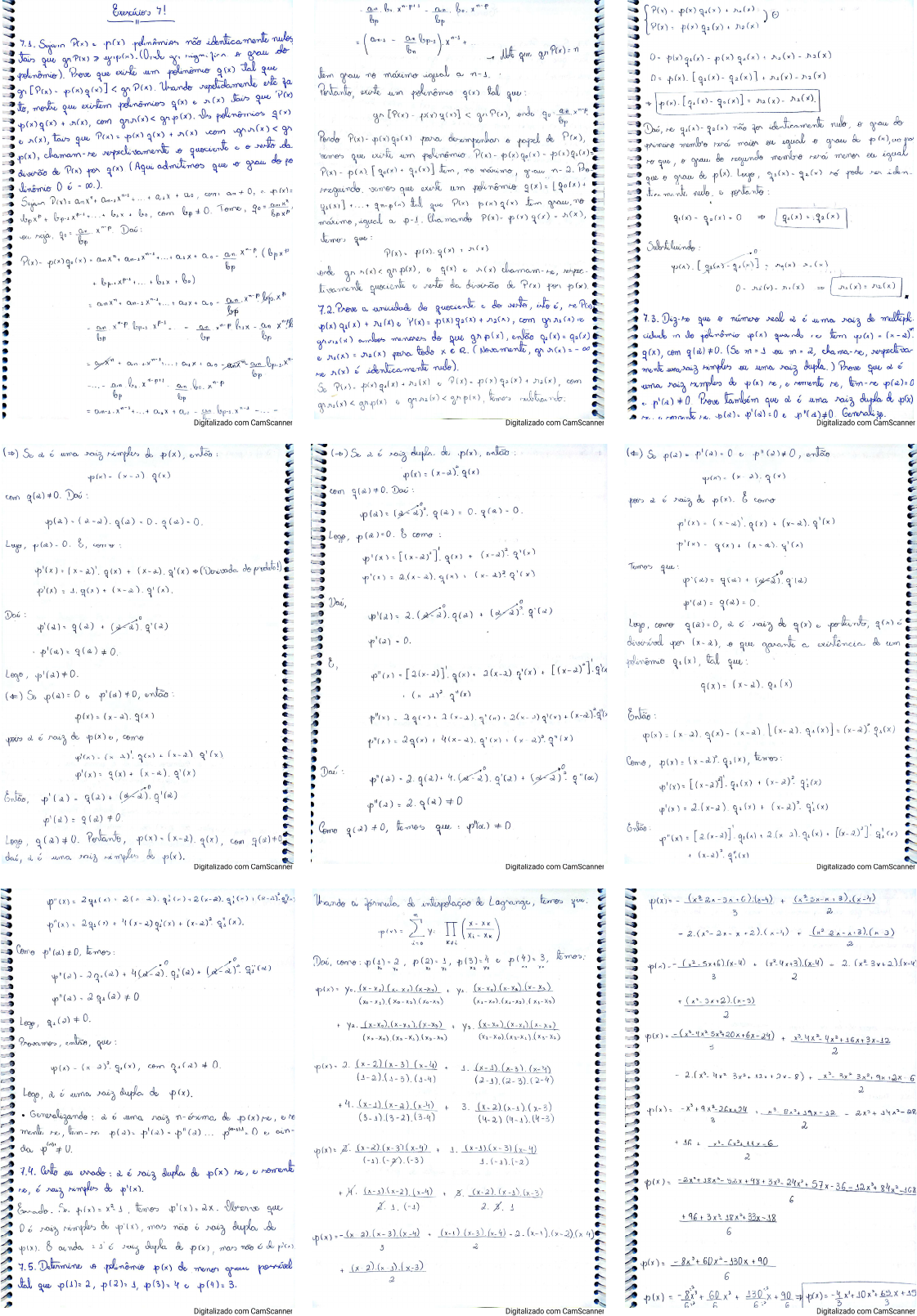 7! 7.1. Sejam p(x) não identicamente nulos do tais que grp(x) of significa grau Note que Prove que existe um tal que tem no máximo igual a P(x). Usando repetidamente este P(x) fa to, mostre que existem polinomios r(x) tais que Portanto, existe um q(x) tal + r(x), com Dr gr onde tais que P(x)= p(x) r(x) com gr Dai, não for identicamente nub do p(x), chamam-re o quociente e o resto da para desempenhar papel de membro maior o de divisão de P(x) por (Aqui admitimos que o do po que existe um polinomio tem, no 2. Bo grow do regunds membro menor igual que de p(x). pode linômio Sejam P(x)= anx"+ com 0, p(x)= vemos que existe um e com Tome, (x) tal que tem graw, no máximo igual a Chamando P(x)- r(x), P(x)- bp r(x)p(x) cujo graw n é um número im- 7.7. Mostre que me n um número par, então polinômio De fato, par. Mostre que existem números Xs, X2 tais p(x) p(x)= não raiz real. Conclua que todo polinômio d or de temos uma P.G: =D X 1 " =D par admite pelo menos uma real. Seja p(x)= ao, com p(x)= Como =D Como n tem grow impar, vamos n= e n+1 1 o número de uma ao, com não existem raizes reais Rodemos da ra p(x). =D 7.8. Tomando use a relação de recorrência roma dos termos de p(x). Sn. Xn Para >0, para calcular com algarismos decimais lim lim (Per exemplo, que 1,414 é uma aproximação de lim lim Note para que tenha devemos J2 com this algarismos decimais exatos porque 2