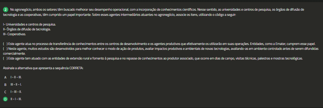 No ambos setores têm buscado melhorar seu desempenho operacional, com a incorporação de conhecimentos Nesse sentido, as universidades e centros de pesquisa, orgãos de difusão de tecnologia e as cooperativas, têm cumprido um papel importante. Sobre esses agentes intermediários atuantes no agronegócio, associe itens, utilizando 0 código a seguir: Universidades e centros de pesquisa. II- Orgãos de difusão de tecnologia. III- ( ) Este agente atua no processo de transferência de conhecimentos entre centros de desenvolvimento e agentes produtivos que efetivamente utilizarão em suas operações. Entidades, como a Emater, cumprem esse papel. Neste agente, muitos estudos são desenvolvidos para melhor conhecer 0 modo de ação de produtos, avaliar impactos produtivos e ambientais de novas tecnologias, avaliando-as em ambiente controlado antes de serem difundidas comercialmente. Este agente tem atuado com as entidades de extensão rural e fomento pesquisa e no repasse de conhecimentos ao produtor associado, que ocorre em dias de campo, visitas palestras e mostras Assinale a alternativa que apresenta a sequência CORRETA: A III. III III II.