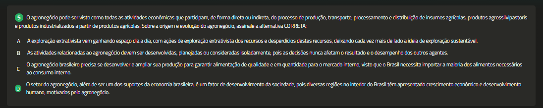 0 agronegócio pode ser visto como todas as atividades econômicas que participam, de forma direta ou indireta, do processo de produção, transporte, processamento e distribuição de insumos agricolas, produtos agrossilvipastoris e produtos industrializados a partir de produtos Sobre a origem e evolução do agronegócio, assinale a alternativa A A exploração extrativista vem ganhando espaço dia a dia, com ações de exploração extrativista dos recursos e destes recursos, deixando cada vez mais de lado a ideia de exploração sustentável. B As atividades relacionadas ao devem ser desenvolvidas, planejadas ou consideradas isoladamente, pois as decisões nunca afetam 0 resultado e 0 desempenho dos outros agentes. 0 brasileiro precisa se desenvolver e ampliar sua produção para garantir alimentação de qualidade e em quantidade para 0 mercado interno, visto que 0 Brasil necessita importar a maioria dos alimentos necessários C ao consumo interno. 0 setor do além de ser um dos suportes da economia brasileira, é um fator de desenvolvimento da sociedade, pois diversas regiões no interior do Brasil têm apresentado crescimento econômico e desenvolvimento humano, motivados pelo