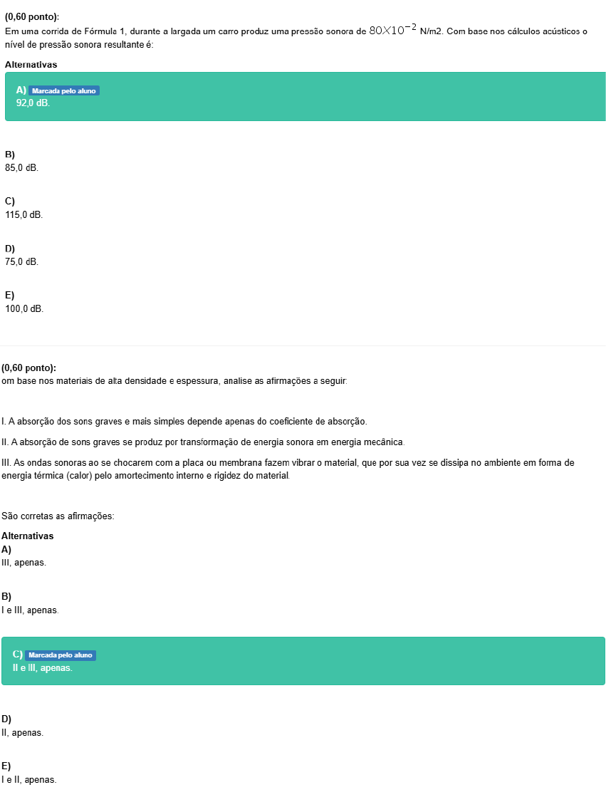 (0,60 ponto): Em uma corrida de Fórmula 1, durante a largada um carro produz uma pressão sonora de 80X10⁻² N/m2. Com base nos cálculos acústicos 0 nível de pressão sonora resultante é: Alternativas A) Marcada pelo aluno 92,0 dB. B) 85,0 dB. C) 115,0 dB. D) 75,0 dB. E) 100,0 dB. (0,60 ponto): om base nos materiais de alta densidade e espessura, analise as afirmações a seguir: I.A absorção dos sons graves e mais simples depende apenas do coeficiente de absorção. II. A absorção de sons graves se produz por transformação de energia sonora em energia mecânica. III. As ondas sonoras ao se chocarem com a placa ou membrana fazem vibrar 0 material, que por sua vez se dissipa no ambiente em forma de energia térmica (calor) pelo amortecimento interno e rigidez do material. São corretas as afirmações: Alternativas A) III, apenas. B) e III, apenas. C) Marcada pelo aluno II e III, apenas. D) II, apenas. E) le II, apenas.(0,60 ponto): conforto térmico relaciona as variáveis ambientais e humanas afim de desenvolver um espaço que traga satisfação ao usuário. De maneira a compreender melhor as variáveis humanas que influenciam na obtenção conforto é essencial 0 entendimento acerca do funcionamento do corpo humano. Com base nisto é possível afirmar que: Alternativas A) limite de aquecimento suportado pelo nosso organismo é de 40°C B) Abaixo de 32°C, nosso corpo começa a entrar em estado de hipotermia. C) Marcada pelo aluno metabolismo interno é responsável por produzir a energia interna em nosso organismo. D) Os seres humanos são animais homeotérmicos, isto é, sua temperatura interna é E) A nossa temperatura interna, possui uma amplitude térmica de apenas 5°C (0,60 ponto): Para um projeto de conforto acústico é relevante que se saiba sobre as características dos materiais. A eficácia do isolamento acústico pode ser obtida através da associação de materiais densos e porosos. A respeito de materiais densos são feitas as seguintes afirmações: isolamento acústico ou isolamento sonoro pode ser propiciado através da utilização de materiais densos e pesados que possuem a característica de amortecer e dissipar a energia sonora. isolamento acústico ou isolamento sonoro pode ser obtido através da aplicação de materiais porosos que possuem a característica de amortecer e dissipar a energia sonora. III A energia sonora é convertida em energia mecânica, ou seja, pode ser interceptada e ter sua trajetória alterada pela intervenção de materiais sólidos. IV São exemplos de materiais densos: Vidro, Concreto e Aço. V Os materiais densos são vantajosos para absorção de sons graves, ou seja, baixas frequências. São corretas as afirmações: Alternativas A) II, III e V, apenas. B) Marcada pelo aluno I, III, IV e V, apenas. C)(0,60 ponto): As ondas sonoras, como qualquer outro tipo de onda, são refletidas ao atingirem um obstáculo fixo, como uma parede. A reflexão do som ocorre com inversão de fase, porém com a manutenção da velocidade de propagação, com a mesma frequência e comprimento de onda do som incidente. exemplo mais comum da reflexão do som é 0 eco e 0 outro fenômeno é a reverberação. A cerca da reverberação são feitas as seguintes afirmações: A reverberação é quando 0 som refletido retorna à fonte antes do som original terminar. A energia de reverberação de um som é resultante da intensidade sonora não absorvida. III Os seres humanos conseguem distinguir 0 som refletido apenas quando retorna ao ouvido humano em um intervalo de tempo igual ou superior a 0,1 segundo. IV eco é um fenômeno ligado a absorção de um material. São corretas as afirmações: Alternativas A) e IV, apenas. B) e II, apenas. C) IV, apenas. D) Marcada pelo aluno III, apenas. (0,60 ponto): timbre é uma característica única de cada fonte sonora. Podemos chamá-la de identidade sonora do indivíduo. Com base neste conceito são feitas as seguintes afirmações: timbre permite que se faça a distinção entre dois sons de mesma altura e intensidade, mas produzidos por fontes diferentes. timbre também pode ser chamado de espectro III o timbre de um som gerado pela humana é composto por frequências sonoras distintas. IV - timbre sonoro da humana masculina possui a frequência sonora de 50Hz. São considerados mecanismos de ventilação artificial seguintes elementos: Alternativas A) I, apenas. B) le II, apenas. C) I, III e IV, apenas. D) Marcada pelo aluno I, II e III, apenas. E) II, apenas.(0,60 ponto): Em uma parede de 15cm de espessura de concreto normal qual será a transmitância térmica resultante do sistema Alternativas A) 1,41 B) 2,04 C) 0,75 D) Marcada pelo aluno 3,92 w/m2K E) 0,63 w/m2K (0,60 ponto): Um conceito essencial para um conforto acústico bem-sucedido é a noção de que nem sempre 0 profissional precisará usar produtos acústicos para controlar 0 som do ambiente. som é um fenômeno transmitido por vibrações propagadas no espaço em um meio elástico que pode ser sólido, líquido ou gasoso. É um fenômeno físico de ondas - vibrações formadas pela rarefação e compressão das moléculas no ar. A respeito das ondas sonoras são feitas as seguintes afirmações: As ondas sonoras auditáveis aos seres humanos está compreendida entre as frequências de 20Hz e 20000 Hz. As ondas sonoras com frequências abaixo de 20Hz, são chamadas de ondas ultrassônicas. III As ondas sonoras com frequências acima de 20000 Hz são chamadas de ondas IV A velocidade de propagação do som não depende do meio de propagação. V comprimento das ondas sonoras está diretamente ligado com 0 meio e a frequência em que ela se encontra. São corretas as afirmações: Alternativas A) Marcada pelo aluno le apenas. B) I. e III. apenas.(0,60 ponto): tratamento acústico interno é essencial para atingir 0 conforto acústico. projetista deve entender e aplicar os cálculos com base no tempo ótimo de reverberação. A respeito das def