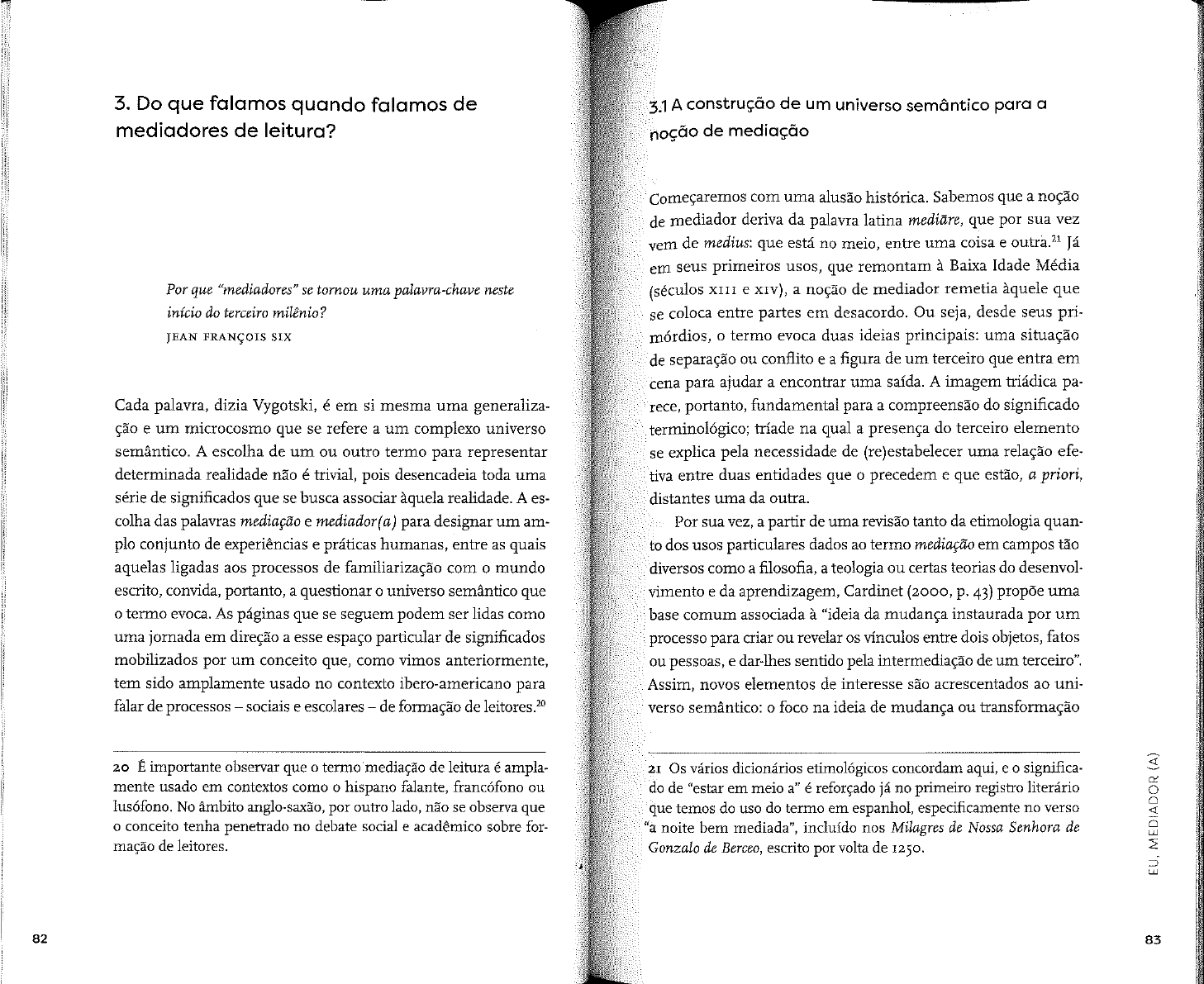 3. Do que falamos quando falamos de 3.1 construção de um universo semântico para a mediadores de leitura? noção de mediação Começaremos com uma alusão histórica. Sabemos que a noção de mediador deriva da palavra latina que por sua vez vem de medius: que está no meio, entre uma coisa e Já em seus primeiros usos, que remontam à Baixa Idade Média Por que "mediadores" se tornou uma palavra-chave neste (séculos XIII e XIV), a noção de mediador remetia àquele que início do terceiro milênio? se coloca entre partes em desacordo. Ou seja, desde seus pri- JEAN FRANÇOIS SIX mórdios, termo evoca duas ideias principais: uma situação de separação ou conflito e a figura de um terceiro que entra em cena para ajudar a encontrar uma saída. A imagem triádica pa- Cada palavra, dizia Vygotski, é em si mesma uma generaliza- rece, portanto, fundamental para a compreensão do significado ção e um microcosmo que se refere a um complexo universo terminológico; tríade na qual a presença do terceiro elemento semântico. A escolha de um ou outro termo para representar se explica pela necessidade de (re)estabelecer uma relação efe- determinada realidade não é trivial, pois desencadeia toda uma tiva entre duas entidades que precedem e que estão, a priori, série de significados que se busca associar àquela realidade. A es- distantes uma da outra. colha das palavras mediação e mediador(a) para designar um am- Por sua vez, a partir de uma revisão tanto da etimologia quan- plo conjunto de experiências e práticas humanas, entre as quais to dos usos particulares dados ao termo mediação em campos tão aquelas ligadas aos processos de familiarização com mundo diversos como a filosofia, a teologia ou certas teorias do desenvol- escrito, convida, portanto, a questionar universo semântico que vimento e da aprendizagem, Cardinet (2000, p. 43) propõe uma termo evoca. As páginas que se seguem podem ser lidas como base comum associada à "ideia da mudança instaurada por um uma jornada em direção a esse espaço particular de significados processo para criar ou revelar os vínculos entre dois objetos, fatos mobilizados por um conceito que, como vimos anteriormente, ou pessoas, e dar-lhes sentido pela intermediação de um terceiro". tem sido amplamente usado no contexto ibero-americano para Assim, novos elementos de interesse são acrescentados ao uni- falar de processos sociais e escolares de formação de leitores.²⁰ verso semântico: foco na ideia de mudança ou transformação 20 É importante observar que termo mediação de leitura é ampla- Os vários dicionários etimológicos concordam aqui, e significa- mente usado em contextos como hispano falante, francófono ou do de "estar em meio a" é reforçado já no primeiro registro literário lusófono. No âmbito anglo-saxão, por outro lado, não se observa que que temos do uso do termo em espanhol, especificamente no verso conceito tenha penetrado no debate social e acadêmico sobre for- "a noite bem mediada", incluído nos Milagres de Nossa Senhora de mação de leitores. Gonzalo de Berceo, escrito por volta de 1250. EU, MEDIADOR (A) 82 83da realidade que toda atividade mediadora pressupõe, por um diante da qual essa pessoa provavelmente não encontra motivos LEITURA E MEDIAÇÃO lado, e propósito de construir sentido pelo restabelecimento para incorporá-la às suas práticas cotidianas. de vínculos entre duas entidades, por outro. Com tudo isso, seja em situações de conflito ou em situa- Cabe salientar que a família semântica evocada (conflito, tría- ções de familiarização com uma nova atividade ou experiência, de, mudança, sentido) é continuamente atualizada nos múltiplos papel relacional parece ser um fator-chave na definição do me- e diversificados campos em que hoje se utiliza termo mediação: diador, cuja tarefa, nas palavras de Cardinet, "sempre leva a dois desde a sociologia (ou a psicologia) até a educação, as ciências pontos essenciais: vincular e dar sentido" (2000, p. 43). Para al- econômicas e empresariais, a comunicação social, a museologia cançar esse propósito, hoje é evidente que perfil de um media- e, no âmbito jurídico, do direito internacional ao direito penal dor não pode se restringir apenas a certas habilidades "técnicas" ou de família. relacionadas ao conhecimento do problema ou da situação, mas Com base no uso do conceito em muitos desses campos, também deve incluir habilidades pessoais como a criatividade, poderíamos falar de certos consensos sobre as formas de atuação a capacidade de comunicação, a assertividade ou a flexibilidade. do mediador. Primeiro: suas ações visam oferecer sugestões e E isso nos leva a assumir que a mediação, longe de ser neutra, é vias de diálogo mais do que impor soluções definitivas sobre sempre portadora de uma determinada visão de mundo (posi- conflito que leva a constatar que na mediação processo de ções ideológicas, sistemas de valores) que é mobilizada e acaba mudança passa, em última instância, pelo nível de engajamento aparecendo. dos sujeitos em disputa. Segundo: a mediação propicia novos Tudo que foi dito apoia a construção de um universo se- processos de compreensão e interpretação da realidade, com mântico fortemente enraizado em aspectos afetivos, emocionais convergência de posturas antes discordantes. Terceiro: papel e motivacionais. Isso explica dois aspectos-chave de toda media- do mediador consiste em oferecer ajuda em duplo sentido: tanto ção cultural: a empatia e a hospitalidade. A primeira consiste na em relação aos objetivos últimos da mediação (alcançar acordos, compreensão do ponto de vista dos outros, permitindo a constru- melhorar a comunicação, etc.) como em relação ao processo pelo ção de relações positivas entre OS interlocutores. A segunda, con- qual as partes interagem, que demanda um clima de confiança, forme sugere Michèle Petit (2009), supõe 