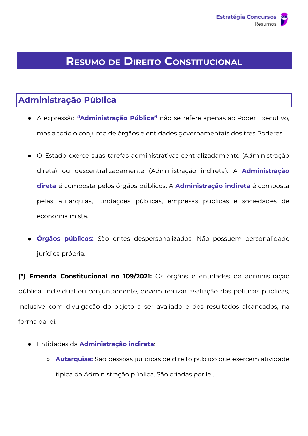 RESUMO DE DIREITO CONSTITUCIONAL Administração Pública ● A expressão “Administração Pública” não se refere apenas ao Poder Executivo, mas a todo o conjunto de órgãos e entidades governamentais dos três Poderes. ● O Estado exerce suas tarefas administrativas centralizadamente (Administração direta) ou descentralizadamente (Administração indireta). A Administração direta é composta pelos órgãos públicos. A Administração indireta é composta pelas autarquias, fundações públicas, empresas públicas e sociedades de economia mista. ● Órgãos públicos: São entes despersonalizados. Não possuem personalidade jurídica própria. (*) Emenda Constitucional no 109/2021: Os órgãos e entidades da administração pública, individual ou conjuntamente, devem realizar avaliação das políticas públicas, inclusive com divulgação do objeto a ser avaliado e dos resultados alcançados, na forma da lei. ● Entidades da Administração indireta: ○ Autarquias: São pessoas jurídicas de direito público que exercem atividade típica da Administração pública. São criadas por lei. 13275547470 - Wylk nerys da silva ○ Fundações públicas: Existem fundações públicas de direito público (criadas por lei) e fundações públicas de direito privado (autorizadas por lei). ○ Empresas públicas: São pessoas jurídicas de direito privado. Em regra, exploram atividades econômicas. Podem também prestar serviços públicos. O capital social é 100% público. Sua criação é autorizada por lei. ○ Sociedades de economia mista: São pessoas jurídicas de direito privado. Em regra, exploram atividades econômicas, mas também podem prestar serviços públicos. São constituídas sob a forma de sociedade anônima. A maioria das ações é do Estado. Sua criação é autorizada por lei. Art. 37 (...) XIX - somente por lei específica poderá ser criada autarquia e autorizada a instituição de empresa pública, de sociedade de economia mista e de fundação, cabendo à lei complementar, neste último caso, definir as áreas de sua atuação; XX - depende de autorização legislativa, em cada caso, a criação de subsidiárias das entidades mencionadas no inciso anterior, assim como a participação de qualquer delas em empresa privada; Os órgãos e entidades da administração pública, individual ou conjuntamente, devem realizar avaliação das políticas públicas, inclusive com divulgação do objeto a ser avaliado e dos resultados alcançados, na forma da lei (art. 37, § 16). ● Regime jurídico da Administração x Regime jurídico administrativo: 13275547470 - Wylk nerys da silva ○ O regime jurídico da Administração é o conjunto de normas às quais se submete à Administração, o que engloba o regime de direito público e o regime de direito privado. ○ O regime jurídico-administrativo, por sua vez, é o regime de direito público ao qual se submete a Administração Pública. Há 2 (dois) princípios que fundamentam o regime jurídico-administrativo: i) a supremacia do interesse público e; ii) a indisponibilidade do interesse público. ● Princípios explícitos da Administração Pública: Segundo o art. 37, CF/88, são princípios da Administração Pública os seguintes: legalidade, impessoalidade, moralidade, publicidade e eficiência. ○ Legalidade: A Administração Pública somente pode fazer o que está expressamente previsto em normas jurídicas. Os particulares podem fazer tudo o que a lei não lhes proíbe. ○ Impessoalidade: Possui 4 (quatro) acepções diferentes. A primeira acepção (finalidade) determina que toda a atuação administrativa deve buscar a satisfação do interesse público. A segunda acepção veda que o agente público utilize as realizações da Administração para sua promoção pessoal. Na terceira acepção, a impessoalidade se revela como uma obrigação de tratamento isonômico (ex: exigência de concurso público; pagamento dos precatórios na ordem cronológica). Por último, a quarta acepção da impessoalidade é a que considera que os atos praticados pelo agente público não são imputáveis a ele, mas ao órgão ou entidade em nome do qual ele age. 13275547470 - Wylk nerys da silva ○ Moralidade: A moralidade administrativa é princípio que impõe aos agentes públicos a atuação ética e honesta na gestão da coisa pública. A ação popular é instrumento de controle popular da Administração Pública, sendo cabível para anular atos lesivos à moralidade administrativa. ○ Publicidade: A publicidade é um requisito de eficácia dos atos administrativos gerais e de efeitos externos ou, ainda, daqueles que onerem o patrimônio público. O princípio da publicidade também exige que a Administração dê conhecimento aos administrados (cidadãos) da conduta interna de seus agentes. Segundo o art. 5o, XXXIII, “todos os cidadãos têm o direito de receber dos órgãos públicos informações de seu interesse particular, ou de interesse coletivo ou geral”. ○ Eficiência: É a base de um novo modelo para a Administração Pública: a administração gerencial. Impõe dever de eficiência à Administração Pública, buscando garantir a melhoria da qualidade dos serviços públicos e a racionalidade dos gastos públicos. O princípio da eficiência se manifesta em diversos dispositivos constitucionais, tais como a avaliação especial de desempenho como requisito para a estabilidade (art. 41, § 4o), a possibilidade de perda do cargo pelo servidor público estável em virtude de avaliação periódica de desempenho (art. 41, § 1º, III) e os contratos de gestão. ● Acesso a cargos, empregos e funções públicas: ○ Os cargos públicos são acessíveis aos brasileiros (natos e naturalizados) e aos estrangeiros. Estrangeiros podem ocupar cargo público, mas não 13275547470 - Wylk nerys da silva podem exercer mandato político (são inelegíveis). Por exemplo, segundo o art. 207, § 1º, d
