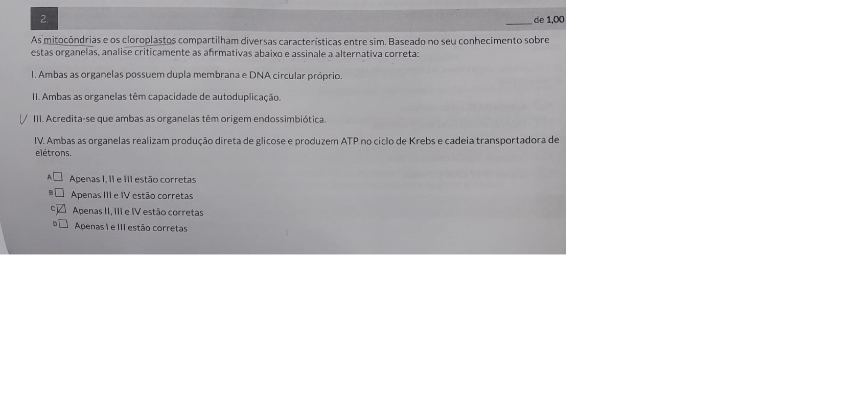 2. de 1,00 As mitocôndrias e cloroplastos compartilham diversas características entre sim. Baseado no seu conhecimento sobre estas organelas, analise criticamente as afirmativas abaixo e assinale a alternativa correta: Ambas as organelas possuem dupla membrana e DNA circular próprio. Ambas as organelas têm capacidade de autoduplicação. Acredita-se que ambas as organelas têm origem endossimbiótica. IV. Ambas as organelas realizam produção direta de glicose e produzem ATP no ciclo de Krebs e cadeia transportadora de elétrons. A Apenas 1, e estão corretas B Apenas e IV estão corretas Apenas 11, e IV estão corretas D Apenas e III estão corretas