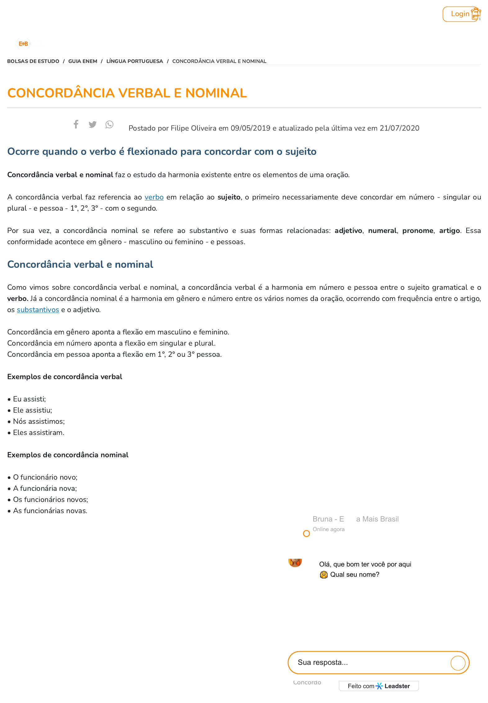 CONCORDÂNCIA VERBAL E NOMINAL Postado por Filipe Oliveira em 09/05/2019 e atualizado pela última vez em 21/07/2020 Ocorre quando o verbo é flexionado para concordar com o sujeito Concordância verbal e nominal faz o estudo da harmonia existente entre os elementos de uma oração. A concordância verbal faz referencia ao verbo em relação ao sujeito, o primeiro necessariamente deve concordar em número - singular ou plural - e pessoa - 1°, 2°, 3° - com o segundo. Por sua vez, a concordância nominal se refere ao substantivo e suas formas relacionadas: adjetivo, numeral, pronome, artigo. Essa conformidade acontece em gênero - masculino ou feminino - e pessoas. Concordância verbal e nominal Como vimos sobre concordância verbal e nominal, a concordância verbal é a harmonia em número e pessoa entre o sujeito gramatical e o verbo. Já a concordância nominal é a harmonia em gênero e número entre os vários nomes da oração, ocorrendo com frequência entre o artigo, os substantivos e o adjetivo. Concordância em gênero aponta a flexão em masculino e feminino. Concordância em número aponta a flexão em singular e plural. Concordância em pessoa aponta a flexão em 1°, 2° ou 3° pessoa. Exemplos de concordância verbal • Eu assisti; • Ele assistiu; • Nós assistimos; • Eles assistiram. Exemplos de concordância nominal • O funcionário novo; • A funcionária nova; • Os funcionários novos; • As funcionárias novas. 1 Login BOLSAS DE ESTUDO / GUIA ENEM / LÍNGUA PORTUGUESA / CONCORDÂNCIA VERBAL E NOMINAL Concordo Feito com Leadster Bruna - Educa Mais Brasil Online agora Olá, que bom ter você por aqui 🤗 Qual seu nome? Sua resposta... https://www.educamaisbrasil.com.br/enem/guia-enem https://www.facebook.com/dialog/share?app_id=170333606374874&display=popup&href=https%3A%2F%2Fwww.educamaisbrasil.com.br/lingua-portuguesa/concordancia-verbal-e-nominal https://twitter.com/intent/tweet?text=Concord%C3%A2ncia%20Verbal%20e%20Nominal%20-%20Educa%20Mais%20Brasil%0D%0Ahttps%3A//www.educamaisbrasil.com.br/lingua-portuguesa/concordancia-verbal-e-nominal https://api.whatsapp.com/send?text=Concord%C3%A2ncia%20Verbal%20e%20Nominal%20|%20Educa%20Mais%20Brasil%20https://www.educamaisbrasil.com.br/lingua-portuguesa/concordancia-verbal-e-nominal https://www.educamaisbrasil.com.br/enem/lingua-portuguesa/verbo https://www.educamaisbrasil.com.br/enem/lingua-portuguesa/substantivos https://www.educamaisbrasil.com.br/ https://www.educamaisbrasil.com.br/ https://www.educamaisbrasil.com.br/ https://www.educamaisbrasil.com.br/enem/guia-enem https://www.educamaisbrasil.com.br/enem/lingua-portuguesa https://leadster.com.br/chatbot-leadster?utm_campaign=www.educamaisbrasil.com.br&utm_source=clientes&utm_medium=referral Concordância verbal e nominal estuda a sintonia entre os componentes de uma oração. (Foto: Freepik) Concordância Verbal A regra geral da concordância verbal é que o verbo ficará de acordo com o sujeito em pessoa e número. Casos específicos de concordância verbal Existem diversos casos de concordância verbal e nominal. Agora, vamos conhecer os principais casos de concordância verbal: Concordância verbal com verbos impessoais O verbo sempre ficará de acordo com a 3° pessoa do singular, uma vez que não existe um sujeito: havia pessoas, houve problemas, faz dois dias, já amanheceu. • Havia três pessoas esperando na fila. (verbo haver com sentido de existir) • Faz dez anos que não te vejo. (verbo fazer indicando tempo decorrido) • Aqui onde trabalho, chove todos os dias. (verbos que indicam fenômenos da natureza) Concordância com o elemento apassivador se O verbo cria concordância com o objeto direto, que exerce a função de sujeito paciente. Ele pode aparecer no singular ou no plural: • Vende-se apartamento. • Vendem-se apartamentos. Concordância verbal com a partícula de indeterminação do sujeito se O verbo sempre vai concordar com a 3° pessoa do singular quando a frase for formada por verbos intransitivos ou por verbos transitivos indiretos: • Precisa-se de funcionário • Precisa-se de funcionários. Concordância verbal com a maioria, a maior parte, a metade... Preferentemente, o verbo vai concordar com a 3° pessoa do singular. Entretanto, a 3° pessoa do plural também pode ser usada: • A maioria dos trabalhadores vai… • A maior parte dos trabalhadores vai… • A maioria dos trabalhadores vão… • A maior parte dos trabalhadores vão… Concordância verbal com pronome relativo que O verbo cria concordância com o termo antecedente do pronome Feito com Leadster Bruna - Educa Mais Brasil Online agora Olá, que bom ter você por aqui 🤗 Qual seu nome? https://leadster.com.br/chatbot-leadster?utm_campaign=www.educamaisbrasil.com.br&utm_source=clientes&utm_medium=referral • Fui eu que pedi… • Foi ela que pediu… • Fomos nós que pedimos… Concordância verbal com pronome relativo quem O verbo estabelece concordância com o antecedente do pronome ou fica na 3° pessoa do singular: • Fui eu quem solicitou… • Fomos nós quem solicitamos… • Fui eu quem solicitou… • Fomos nós quem solicitou… Concordância verbal com o infinitivo pessoal O verbo no infinitivo é flexionado sempre que existir um sujeito definido, quando se quiser determinar o sujeito ou quando o sujeito da segunda oração for diferente do da primeira: • Isto é para nós solicitarmos. • Eu pedir para eles solicitarem tudo. Concordância verbal com o infinitivo impessoal O verbo no infinitivo não é flexionado quando não existir um sujeito definido, quando o sujeito da segunda oração for igual ao da primeira oração, em locuções verbais, com verbos preposicionados e com verbos imperativos: • As mães conseguiram entender a verdade. • Foram obrigadas a entender a verdade. • Foram barradas de entender a verdade. Concordância verbal com o verbo ser O verbo cria uma concordância com o predicativo do sujeito, podendo 