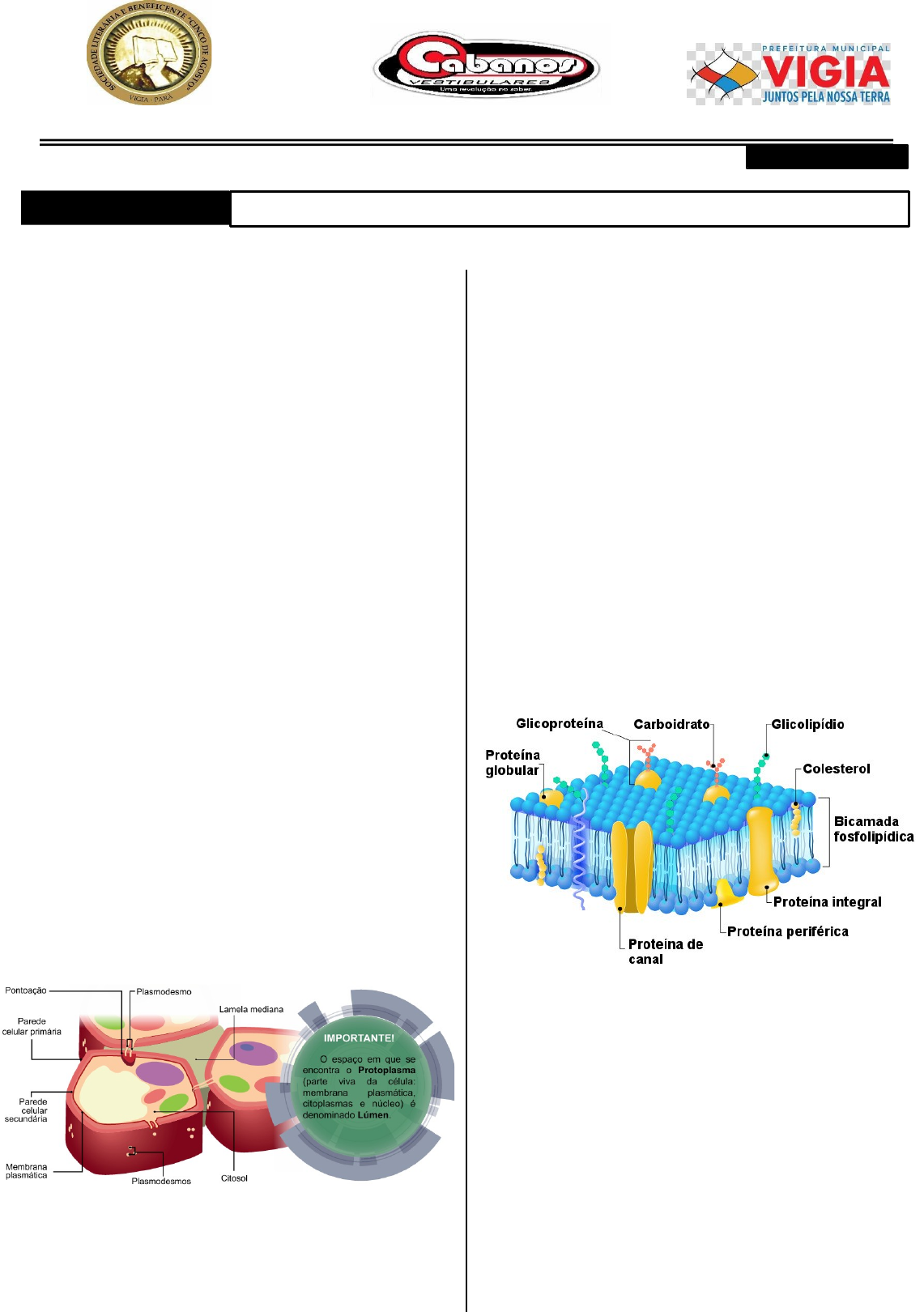 Professor: José Matheus Data: 19/05/2025 BIOLOGIA MATERIAL 06 BIOLOGIA CELULAR II – MEMBRANAS CELULARES Considerações iniciais Para Que as células se mantenham individualizadas necessitam estar separadas do seu meio ambiente por envoltórios. Os envoltórios celulares cumprem duas funções básicas: ● Isolar o conteúdo celular do meio externo; ● Possibilitar trocas de substâncias com o meio extracelular 1. PAREDE CELULAR: Está presente nas bactérias (peptídioglicanos), alguns protistas (celulose ou sílica), fungos (quitina e celulose) e plantas (celulose). Apresenta como funções básicas: reforço externo da membrana plasmática, sustentação e revestimento celular. 1.1 Parede celular vegetal: A parede celular vegetal é uma estrutura rígida e inerte, porém, permeável. Apresenta perfurações, as pontuações, que possibilitam o surgimento de canais protéicos, os PLASMODESMOS, através dos quais há comunicação entre os citoplasmas de duas células vegetais vizinhas. Nos animais esse inter câmbio é feito pelas JUNÇÕES COMUNICANTES. 2. MEMBRANA PLASMÁTICA: Em todos os tipos de células encontramos a membrana plasmática, também denominada Plas malema ou Membrana Celular. Sua constituição química principal é Fosfolipoprotéica, sendo forma da de fosfolipídios e proteínas. Ela é viva, elástica e mede cerca de 7,5 nm (75Å) de espessura, sendo visível apenas ao mi croscópio eletrônico. 2.1 Estrutura da membrana: O modelo mais aceito atualmente é o do Mosaico Fluido, proposto por S. J. Singer e G. Nicholson em 1972. Esse modelo propõe que as moléculas de proteínas ficam imersas em uma dupla camada de fosfolipídios(bicamada). As moléculas de proteínas não são fixas, podendo se movimentar livremente de um lado para outro. MODELO DE MOSAICO FLUIDO 2.2 Funções da membrana plasmática: A membrana plasmática tem três funções principais: revestimento, proteção e permeabilidade seletiva, sendo esta última sua função mais comum, onde ela seleciona as substancias que entram e saem através de alguns transportes específicos. 2.3 Especializações da membrana: · Microvilosidades: servem para aumentar a superfície de contato e é encontrada no intestino e rins. · Cílios e flagelos: cílios são encontrados nas vias respiratórias e expulsam impurezas. Os flagelos tem função de transporte, sendo o mais importante encontrado nos espermatozoides. · Junção oclusiva: impede a entrada de microrganismos entre as células, fazendo uma vedação intracelular. · Desmossomos: adesão, une uma célula a outra · Junção comunicante: permite a troca de substancias entre as células 2.4 TRANSPORTE ATRAVES DA MEMBRANA: Sabemos que a membrana plasmática é responsável, entre outras funções, por controlar todas as substâncias que entram e saem da célula. Em virtude dessa capacidade, dizemos que a membrana apresenta permeabilidade seletiva. Essa seleção é importante porque garante a entrada de oxigênio e nutrientes na célula, além de garantir a eliminação dos produtos do metabolismo celular. Podemos classificar o transporte através da membrana analisando-se o gasto de energia que uma célula apresenta ao transportar uma substância. Aquele transporte em que não há gasto de energia é chamado de passivo, e aquele que apresenta gasto de energia é chamado de ativo. 2.4.1 Transporte passivo: · Difusão simples: as partículas movemse de um local mais concentrado (hipertônico) para outro menos concentrado (hipotônico). Dizemos, nesse caso, que o movimento acontece a favor do gradiente de concentração. A substância atravessa a membrana através da própria membrana ou através de canais. Entre as substâncias que podem ser transportadas desse modo, podemos citar o oxigênio e o gás carbônico. · Difusão facilitada: uma substância é transportada por meio da participação de proteínas presentes na membrana. Essas proteínas são conhecidas como proteínas carregadoras e facilitam o movimento espontâneo das moléculas sem que haja nenhum gasto de energia pela célula. Substâncias como aminoácidos e açúcares podem ser transportadas dessa forma para o interior da célula. · Osmose: é um tipo especial de difusão e, nesse caso, a substância que se difunde pela célula é a água. Nas células, a água difunde-se do meio menos concentrado para o mais concentrado. Se uma célula é colocada, por exemplo, em um meio em que a concentração de soluto (substância dissolvida) é muito maior que a do interior da célula, a tendência da célula é perder água por osmose. Se o contrário ocorre, a célula enche-se de água. 2.4.2 Transporte ativo · Bomba de sódio e potássio: É um mecanismo onde durante a passagem do impulso nervoso no neurônio (célula nervosa), íons sódio (Na+) são transportados para o interior celular e íons potássio (K+) são retirados para o exterior da célula por carregadores especiais, com gasto de energia. · Transporte em bloco: consiste no englobamento de particulas, atraves de dois processos – Endocitose e exocitose. - Endocitose: englobamento de particulas para dentro da célula. Quando particulas sólidas são englobadas, chama-se fagocitose. Quando particulas líquidas são englobadas, chama-se pinocitose. - Exocitose: as secreções são eliminadas do interior da celular para o meio externo. 1. (UFMG-MG) O esquema abaixo representa a concentração de íons dentro e fora dos glóbulos vermelhos. A entrada de K+ e a saída de Na+ dos glóbulos vermelhos pode ocorrer por: a) transporte passivo. b) difusão. c) plasmólise. d) transporte ativo. e) osmose 2. (ENEM 2017) Uma das estratégias para conservação de alimentos é o salgamento, adição de cloreto de sódio (NaCl), historicamente utilizado por tropeiros, vaqueiros e sertanejos para conservar carnes de boi, porco e peixe. O que ocorre com as células presentes nos alimentos preservados com essa técnica? A) O sal adicionado dimin