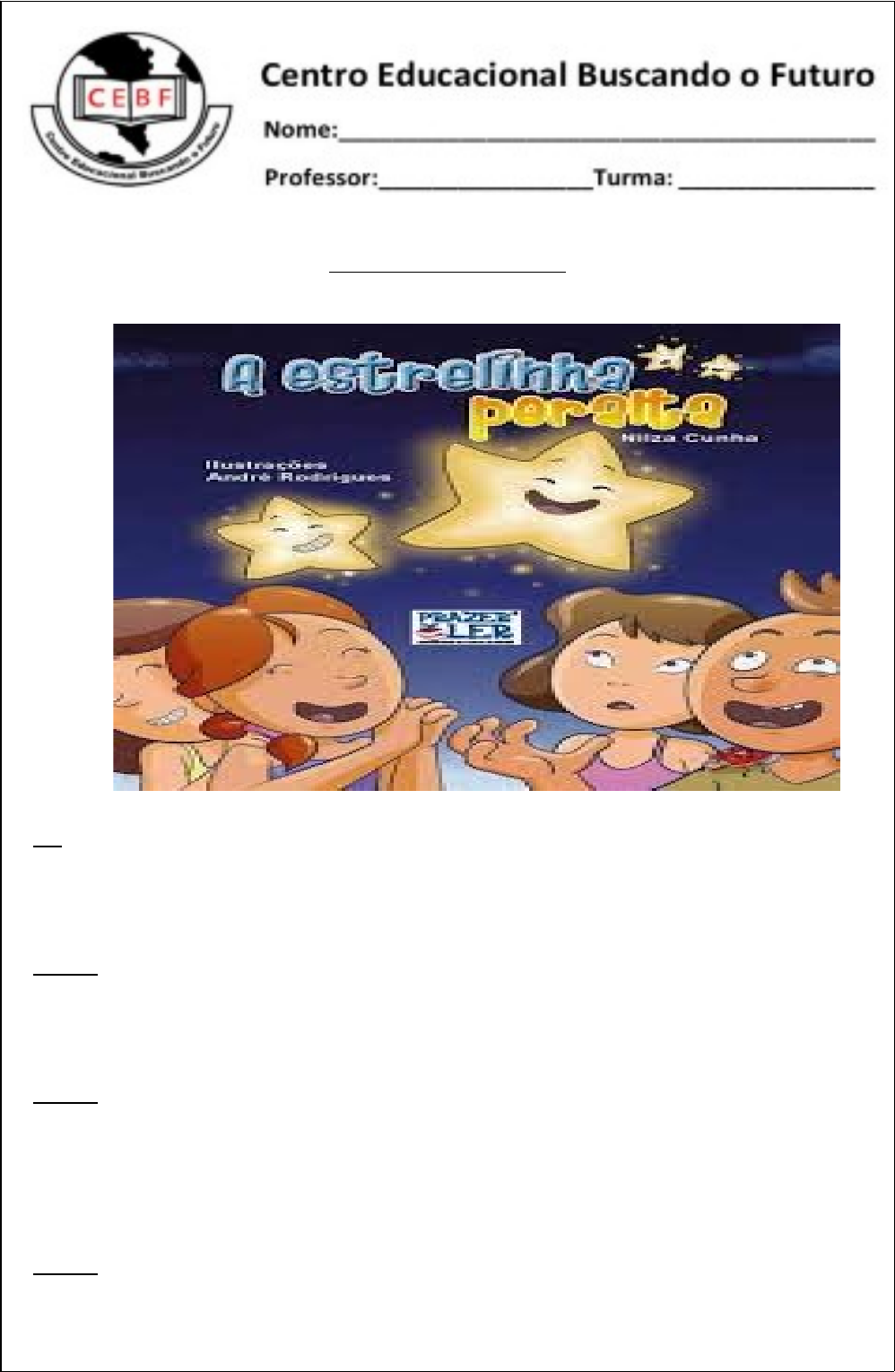 Avaliação de Literatura 1) Qual o título do livro? ____________________________________________________________________________________________________________________________________________________ 2) Qual o autor ? ____________________________________________________________________________________________________________________________________________________ 3) Qual a editora? ____________________________________________________________________________________________________________________________________________________ 4) Quem é o ilustrador? ____________________________________________________________________________________________________________________________________________________ 5) Qual o personagem principal? ____________________________________________________________________________________________________________________________________________________ 6) Quais são os outros personagens? ____________________________________________________________________________________________________________________________________________________ 7) Quem era Lita? ____________________________________________________________________________________________________________________________________________________ 8) O que Idinha e Lita pediram a amiga lua? ______________________________________________________________________________________________________________________________________________________________________________________________________________________________ 9) O que você aprendeu para sua vida com a leitura desse livro? ______________________________________________________________________________________________________________________________________________________________________________________________________________________________ 10) Agora é com você ! Você é o ilustrador do livro, crie uma nova capa para ele. Capriche e não se esqueça de colorir e escrever um novo título. Boa Prova! Avaliação de Interpretação de texto 1) Leitura e interpretação. Bolo formigueiro Paula e Andrea acordaram felizes naquele dia. Afinal era sexta-feira e toda sexta-feira tinha bolo gostoso na casa deles. Parecia realmente que seria mais uma Sexta como todas as outras, até que Souberam que o bolo que sua mãe faria chamava-se Formigueiro. Os dois ficaram pensando que tal bolo seria aquele. Então decidiram observar sua mãe para que pudessem descobrir se no bolo iam Formigas de verdade . Quando a mãe de Paula e Andréa começou a fazer o bolo, os dois foram a espiar e perceberam que junto dos ingredientes haviam pote cheinho de coisinhas pretas e acharam que era formigas. O bolo ficou pronto mas quem Disse que eles queriam comer? A mãe ficou preocupada, Depois sabia que eles a dará adoravam um bolo e foi logo perguntando por que não comiam. Depois da explicação a mãe riu muito e mostrou a eles o que é o que viram não eram formigas no pote mas sim chocolate granulado. Compreensão do texto e gramática. 1) Qual é o título do texto? ____________________________________________________________________________________________________________________________________________________ 2)Qual o tema do texto ? 3)Quais são os personagens principais? ____________________________________________________________________________________________________________________________________________________ 4) Qual foi a confusão que ocorreu na história? ____________________________________________________________________________________________________________________________________________________ 5) Quem e como foi resolvida essa confusão? ________________________________________________________________________________________________________________________________________________________________________________________________________________________________________________________________________________________________________ 6) Retire do texto três adjetivos. ____________________________________________________________________________________________________________________________________________________ 7) Encontre no texto e registre o que se pede. a) Dois substantivos comuns _______________________________________________ b) Dois substantivos próprios _______________________________________________ 8) Encontre o texto e sublinhe palavras com os dígrafo CH e SS. 9) Retire do texto a) Uma palavra monossílaba ______________________________________ b) Uma palavra Dissílaba__________________________________________ c) Uma palavra trissílaba __________________________________________ d) Uma palavra Polissílaba ________________________________________ 10)Circule três palavras com encontro vocálicos Boa Prova! Avaliação de Língua Portuguesa 1) Marque o quadrinho onde aparecem os ingredientes em ordem alfabética. a) limão – banana – canela – açúcar – cravo b) açúcar – banana – limão - canela – cravo c) canela – cravo – limão - açúcar – banana d) açúcar – banana – canela – cravo – limão 2) Reescreva as frases no plural. a) O rapaz e o mar. __________________________________________________________________________ b)O português e a flor. _________________________________________________________________________ c) O cantor e o professor. __________________________________________________________________________ 3) Passe as frases para o feminino. a)Meu filho foi testemunha do casamento. ____________________________________________________________________________________________________________________________________________________ b)O ator atuou no filme. ____________________________________________________________________________________________________________________________________________________ d) O costureiro fez uma linda roupa. ____________________________________________________________________________________________________________________________________________________ 4) Leia a poesia e dep