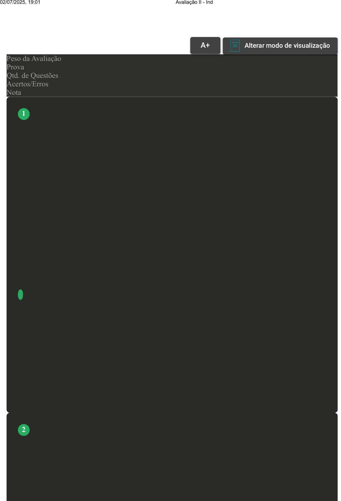 Prova Impressa GABARITO | Avaliação II - Individual (Cod.:1025002) Peso da Avaliação 2,00 Prova 101748168 Qtd. de Questões 10 Acertos/Erros 10/0 Nota 10,00 Dependendo do método de dispensação utilizado no hospital, podemos antecipar com alguma margem de segurança o funcionamento adequado ou não da farmácia e se o paciente está recebendo os seus medicamentos dentro de critérios que possam assegurar a sua qualidade e segurança. Com relação ao Sistema de Dispensação Coletiva, diante do que se sabe, assinale a alternativa CORRETA: Fonte: XAVIER, C. de M. S. Farmácia hospitalar e a descrição dos sistemas de dispensação. Goiás: Pontifícia Universidade Católica de Goiás-PUC, 2012, p. 18. A É o mais moderno de todos, pois não leva em conta a verdadeira função de uma Farmácia Hospitalar. A Farmácia serve, unicamente, como depósito de medicamentos e materiais e, simplesmente, faz o repasse desses produtos para as diversas seções do hospital. B A assistência ao paciente fica prejudicada porque o farmacêutico não revisa e analisa a prescrição médica e também pelo fato de a enfermagem estar mais envolvida com as questões relacionadas aos medicamentos do que a própria farmácia. C É considerado um dos métodos de dispensação de medicamentos mais obsoletos, embora ainda seja utilizado por mais de 70% das Farmácias Hospitalares brasileiras. D A sua principal característica é que os medicamentos são distribuídos por paciente ou procedimento, a solicitação é feita pela enfermagem, implicando a formação de vários estoques nas unidades assistenciais. O processo de realização de inventário na área de farmácia hospitalar deve ser organizado e os profissionais devem ter a consciência de sua importância. Mais importante que a realização do inventário é a análise dos erros de estoque e as ações propostas para diminuição destas divergências. Sobre as principais causas de erros na realização dos inventários, assinale a alternativa CORRETA: VOLTAR A+ Alterar modo de visualização 1 2 02/07/2025, 19:01 Avaliação II - Individual about:blank 1/8 A Duplicidade de cadastro de algum item não identificado antes do inventário. B Equipes de contagem preparadas. C Itens a serem contados organizados nos seus devidos lugares, corretamente identificados. D Planejamento e organização para realização dos inventários. A prescrição dos medicamentos sujeitos ao controle especial, à base de substâncias constantes das listas "A1" e "A2" (entorpecentes), "B1" (psicotrópicas) e "C2" (retinóicas para uso sistêmico), descritos na Portaria nº 344/98 do Ministério da Saúde, são algumas das classes que não é exigida a Notificação de Receita para pacientes internados em ambiente hospitalar. A dispensação destes medicamentos deve ser realizada perante receita ou prescrição diária de medicamento subscrita em papel privativo (prescrição médica). Sobre os medicamentos descritos na Portaria nº 344/98 e constantes das listas A1, A2, B1 e C2, associe os itens, utilizando os códigos a seguir: I- A1. II- A2. III- B1. IV- C2. ( ) Alfentanila, fentanila, metadona, morfina, petidina e ópio. ( ) Bromazepam, fenobarbital, loprazolam, lorazepam, midazolam. ( ) Codeína, diidrocodeína, nalbufina e tramadol. ( ) Adapaleno, isotretinoína e tretinoína. Assinale a alternativa que apresenta a sequência CORRETA: 3 02/07/2025, 19:01 Avaliação II - Individual about:blank 2/8 Fonte: https://bvsms.saude.gov.br/bvs/saudelegis/svs/1998/prt0344_12_05_1998_rep.html. Acesso em: 23 jan. 2023. A I - III - II - IV. B I - II - III - IV. C III - II - IV - I. D I - III - IV - II. Os sistemas de dispensação dispõem sobre o trajeto do medicamento até o paciente e sobre a forma como eles são separados, organizados e dispostos para a administração. A implantação de um sistema racional de dispensação de medicamentos e de outros produtos para a saúde devem ser priorizados pelo estabelecimento de saúde e pelo farmacêutico, de forma a buscar processos que garantam a segurança do paciente. Qual o tipo de dispensação de medicamentos que ocorre a existência de estoques de medicamentos nas unidades de internação e a realização de sua reposição por meio de requisição semanal em nome do centro de custo? Fonte: GIMENEZ, M. Guia de orientação do exercício profissional em farmácia hospitalar. Comissão de Farmácia Hospitalar, p. 8-28. 2012. A Individualizado Indireto. B Coletivo. C Dose Unitária. D Individualizado Direto. A dispensação do medicamento é o ato de disponibilizar um medicamento ao paciente após a prescrição médica, podendo ser direta ou indireta através da equipe de enfermagem. Há atualmente 4 5 02/07/2025, 19:01 Avaliação II - Individual about:blank 3/8 vários sistemas de dispensação de medicamento, por exemplo, sistema coletivo, sistema individualizado e sistema por dose unitária. Com relação às vantagens apresentadas pelo sistema de distribuição de medicamentos por prescrição individualizada, assinale a alternativa INCORRETA: A Facilidade para devoluções à farmácia, aumento da integração do farmacêutico a equipe de saúde. B Promoção do acompanhamento de pacientes e otimização da qualidade assistencial. C Rápida disponibilidade de medicamentos na unidade assistencial e mínima espera na execução das prescrições. D Diminuição do estoque periférico e otimização das devoluções à farmácia. É de responsabilidade do farmacêutico garantir a segurança na guarda e distribuição dos medicamentos sujeitos ao controle especial descritos na Portaria nº 344/98 do Ministério da Saúde. Referente à Portaria nº 344/98, classifique V para as sentenças verdadeiras e F para as falsas: ( ) Devem ser armazenados em local com acesso restrito, exclusivo para este fim e/ou fechado com chave ou outro dispositivo que ofereça segurança, e deve estar sob a responsabilidade do farmacêutico. ( ) O cont