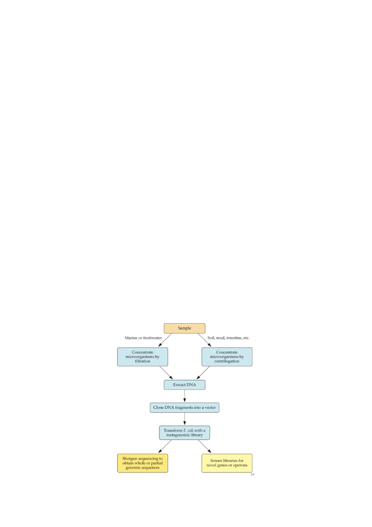 Metagenômica - A metagenômica é um campo da genômica que estuda o material genético coletado de amostras ambientais, como solo, água, sedimentos e até mesmo o microbioma humano. - Objetivo primário: construir uma biblioteca abrangente de DNA de todos os microrganismos presentes em uma amostra de um determinado ecossistema ou local. - Em vez de analisar o genoma de um organismo específico, a metagenômica examina a diversidade genética de comunidades microbianas inteiras, permitindo a compreensão da composição e função dessas comunidades. - Essa é uma abordagem interessante principalmente pela possibilidade de encontrar genes de uso biotecnológico de microrganismos não cultiváveis, já que permite acesso aos genomas presentes nessas amostras. - Possíveis fontes e bibliotecas metagenômicas: minas de metal ou carvão abandonadas, rios e lagos de água fresca, fontes térmicas, comunidades microbianas intestinais, oceanos, sedimentos, solos, esgoto etc. - É mais eficiente quando há comunidades microbianas com poucas espécies. Fluxograma de trabalho - A amostra é coletada: - Líquidos: concentração por filtração. - Sólidos: concentração por centrifugação. - Depois, é feita a extração do DNA, que é clonado em vetores. - Em seguida, é feita a transformação dos vetores em E. coli e amplificação. - Após a clonagem e amplificação do DNA, é possível prosseguir o projeto realizando o sequenciamento dos genomas da amostra ou realizar uma busca na biblioteca por novos genes ou operons – abordagem mais direta para identificar potenciais biotecnológicos. Sequenciamento dos genomas da amostra - Preparo da biblioteca de fragmentos de DNA molde. A fragmentação é realizada por sonicação, nebulização ou passagem por agulha. Além disso, é necessário fazer o reparo das extremidades dos fragmentos para serem inseridos em vetores (DNA polimerase, exonuclese e T4 quinase) - Amplificação biológica ou in vitro (PCR) dos fragmentos. - Sequenciamento dos genomas. - Montagem das sequências. - Nessa técnica, cada sequência do genoma deve ser determinada entre 6 e 10 vezes a partir de fragmentos diferentes. Isso garante uma profundidade de cobertura. Pesquisa direcionada - Exemplo: triagem para genes de lipases. - As células transformadas são crescidas em ágar contendo diferentes triglicerídeos. - Os clones que formam halo, indicando a degradação dos lipídeos são isolados. - É necessário realizar a clonagem de grandes insertos para garantir a presença do operon que contém todas as enzimas da via metabólica. Expressão Gênica Induzida por Substrato (SIGEX) - SIGEX é uma técnica para detecção de clones metagenômicos com funções específicas: clones que contém promotores ativados quando há determinadas substâncias como fonte de carbono disponíveis no meio de cultura. - Os fragmentos de DNA da amostra são clonados em vetores com Proteína Verde Fluorescente (GFP), um gene reporter sob controle do promotor lac (plac). - O sítio de clonagem é localizado entre plac e gfp. - As células transformadas são cultivadas na presença de ampicilina e IPTG. - Os clones que produzem GFP na presença de IPTG podem apresentar três possibilidades: - Não tem o inserto. - Têm o inseto, mas sem terminador de transcrição. - Tem um inserto com promotor constitutivo. - Nessa etapa, as células de interesse não produzem GFP na presença de IPTG porque possuem insertos que não induzem expressão nestas condições. - A partir disso, é feita uma citometria de fluxo para separar e descartar os clones que estão expressando GFP. Os clones que permanecem são os que não possuem um promotor próprio e um promotor que pode ser induzido por substrato. - Em seguida, é adicionado um substrato específico para o promotor desejado e os clones são submetidos a uma nova citometria, que seleciona as células produtoras de GFP e que portanto possuem o promotor que pode ser induzido por substrato. - O clone selecionado pode ter o DNA extraído e analisado para encontrar elementos específicos. Bioinformática - Bancos de dados moleculares - Bancos de dados moleculares são locais onde se armazenam sequências de DNA, RNA e proteínas. - São usados para pesquisa, comparação e análise genética, ajudando a entender genes, evolução e doenças. História dos bancos de dados - Até 1988, as sequências eram publicadas só em papel. - Os primeiros grandes bancos surgiram na Europa e nos Estados Unidos: EMBL (Europa, 1980) e GenBank (EUA, 1982). - Entretanto, na década de 1980, havia apenas cerca de 2.000 sequências publicadas. Avanço com a internet - O surgimento da internet facilitou o acesso aos dados moleculares. - Além disso, a explosão de dados nos anos 90 com o Projeto Genoma Humano e o sequenciamento de genomas bacterianos aumentou muito a quantidade de dados disponíveís. - Atualmente o GenBank dobra de tamanho a cada 18 meses. Em 2020, possuia 2 bilhões de sequências, 9 trilhões de nucleotídeos e dados de mais de 300.000 organismos Bancos de dados e Bioinformática - No ramo da bioinformática, algoritmos são utilizados para analisar as sequências disponíveis em bancos de dados e realizar: - Busca de homologia - Anotação de genes - Comparação de sequências História dos bancos de dados - Até 1988, as sequências eram publicadas só em papel. Avanço com a internet Bancos de dados e Bioinformática