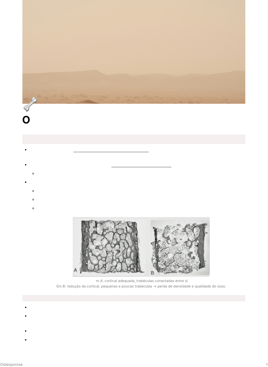 🦴 Osteoporose Considerações iniciais: A osteoporose é uma doença metabólica sistêmica crônica → afeta todos os ossos, com predomínio de algumas regiões. O principal desfecho relacionado são as fraturas por fragilidade óssea: Ocorre mediante energia não intensa → normalmente não apresentaria tal desfecho. A fisiopatologia gira em torno de 3 pontos essenciais para avaliação: Resistência óssea. Densidade óssea. Qualidade. Fatores de risco: Idade → principal, especialmente para indivíduos acima de 55 anos. Sexo feminino → em mulheres na pós-menopausa, há redução da produção de estrogênio e da produção óssea. Disabsorção → doença celíaca ou Chron → má absorção de vit D e cálcio. Cirurgias com grande intervenção gastrointestinal. Em A cortical adequada, trabéculas conectadas entre si. Em B redução da cortical, pequenas e poucas trabéculas → perda de densidade e qualidade do osso. Osteoporose 1 Álcool e cigarro. História familiar. Baixo peso → em especial IMC 17. Menopausa precoce → fator relevante! Diabetes e artrite reumatoide. Clínica: OSTEOPOROSE TEM RASTREIO MAS NÃO TEM SINTOMAS. É evidenciada a partir das fraturas → principalmente de coluna vertebral, quadril e rádio distal. Dor. Deformidades. Incapacidade física. Perda de altura. Diagnóstico: Suspeitar em: Mulheres no período pós-menopausa. Homens 50 anos de idade. Exames de imagem: RADIOGRAFIA DA COLUNA TORÁCICA Múltiplas fraturas: Redução da altura do corpo vertebral. Hipercifose torácica. Classificação → diferença entre a maior altura e menor altura das vértebras analisadas: Grau 1 20 25%. Grau 2 25 40%. Grau 3 40%. DENSITOMETRIA ÓSSEA DMO Geralmente avalia coluna lombar, fêmur e rádio (antebraço). 💡 OBS A osteoartrite (artrose) pode gerar osteófitos - “bico de papagaioˮ (reação de formação de ossos) → falseia exame → o leitor lê as formações ósseas (osteófitos) como densidade óssea → por isso, essas vértebras acometidas não podem entrar no exame. Fraturas por acunhamento também falseia o exame → uma vértebra se junta à outra → quando visto pelo radiologista já estabelece o diagnóstico de osteoporose. TScore: Compara a densidade mineral óssea do paciente com a de um adulto jovem do mesmo sexo. Avalia mulheres na pós menopausa ou pacientes com fator de risco. NORMAL 1 DP Osteoporose 2 OSTEOPENIA entre 1 e 2,5 DP OSTEOPOROSE 2,5 DP OSTEOPOROSE SEVERA 2,5 DP fratura por fragilidade ZScore: Compara a densidade mineral óssea do paciente com a de pessoas da mesma idade e sexo. DENTRO DO ESPERADO PARA IDADE 2 DP ABAIXO DO ESPERADO PARA IDADE 2 DP O ZScore é importante para ver se não há perda de densidade mineral óssea muito grande → ex: causas secundárias: Mieloma múltiplo (lesões líticas). Doença renal crônica com hiperparatireoidismo associado. Uso de anticonvulsivante ou corticoide. SCORE FRAX É feito a partir da DMO É uma calculadora que associa a densidade do colo do fêmur e outros fatores para definir o risco de fraturas, em 10 anos, em determinado indivíduo. https://www.abrasso.org.br/frax-brasil/ Fatores de risco: DM. Alcoolismo. Artrite reumatoide. História familiar. EM QUEM REALIZAR DENSITOMETRIA ÓSSEA? Indivíduos em tratamento. Mulheres: 65 anos. No período de pós-menopausa. Homens: 70 anos. 50 anos, com fatores de risco. Diagnóstico de osteoporose nas populações acima citadas: T Score 2,5 DP. Fratura por fragilidade em quadril, úmero ou fêmur → baixo impacto, como queda da própria altura. Risco elevado pelo FRAX. Osteopenia + fratura por fragilidade em rádio, úmero, pelve, fêmur e vértebras. Adultos com antecedente de fratura por fragilidade, doença ou uso de medicações que podem levar a osteoporose: Doença celíaca ou Chron. Varfarina. Anticonvulsivantes. Osteoporose 3 https://www.abrasso.org.br/frax-brasil/ Exames laboratoriais: Estabelecer diagnóstico diferencial com osteoporose de causa primária: Hemograma. Creatinina. Cálcio. PTH. Urina de 24h. Fósforo → hipofosfatemia se relaciona com déficit de mineralização óssea. Vitamina D hipovitaminose D se relaciona com déficit de mineralização óssea. Função hepática. Fosfatase alcalina. Considerar: Doença celíaca → por mecanismo disabsortivo. TSH. Eletroforese de proteínas séricas → mieloma múltiplo. Sorologias. Provas hormonais → em homens com osteoporose, é necessário investigar hormônios. Investigação de mastocitose. Tratamento: Não medicamentoso: Aumento dos níveis de cálcio na dieta: Consumo de leite e seus derivados. Pode ser necessário o uso de suplementos. Meta: 1.000 1.200 mg/dia. Ingestão adequada de vitamina D e K. Prática de exercícios físicos: OBS Recomenda-se evitar exercícios de hiperflexão ou hiperextensão da coluna lombar. Prevenção de quedas. Medicamentoso: Antirreabsortivos: Moduladores dos receptores de estrogênio SERMs): Orais: Tamoxifeno, Raloxifeno. Inibidores dos osteoclastos Bifosfonatos: Orais: Alendronato (semanal), Risedronato (mensal). Endovenosos: Ácido zoledrônico (anual) → ex: paciente com estenose de esôfago. Inibidor do RANKL Subcutâneo: Denosumabe → imunobiológico → SEGURO PARA INSUFICIÊNCIA RENAL. Anabólicos → promove o crescimento ósseo. Osteoporose 4 Osteoporose grave → em geral, T-score ≤ 3 DP. Intolerância ao uso de bifosfonatos orais. Falha terapêutica → novas fraturas, mesmo com tratamento antirreabsortivo. Subcutâneo: Teriparatida (diário): Ação similar ao do PHT. Apresenta mecanismo formador ósseo. Aplicação por 48 meses. Subcutâneo: Romosozumabe (mensal): → imunobiológico. É uma anti-esclerotina. Possui efeito duplo, isto é, também age como antirreabsortivo. Aplicação por 12 meses. Osteoporose 5