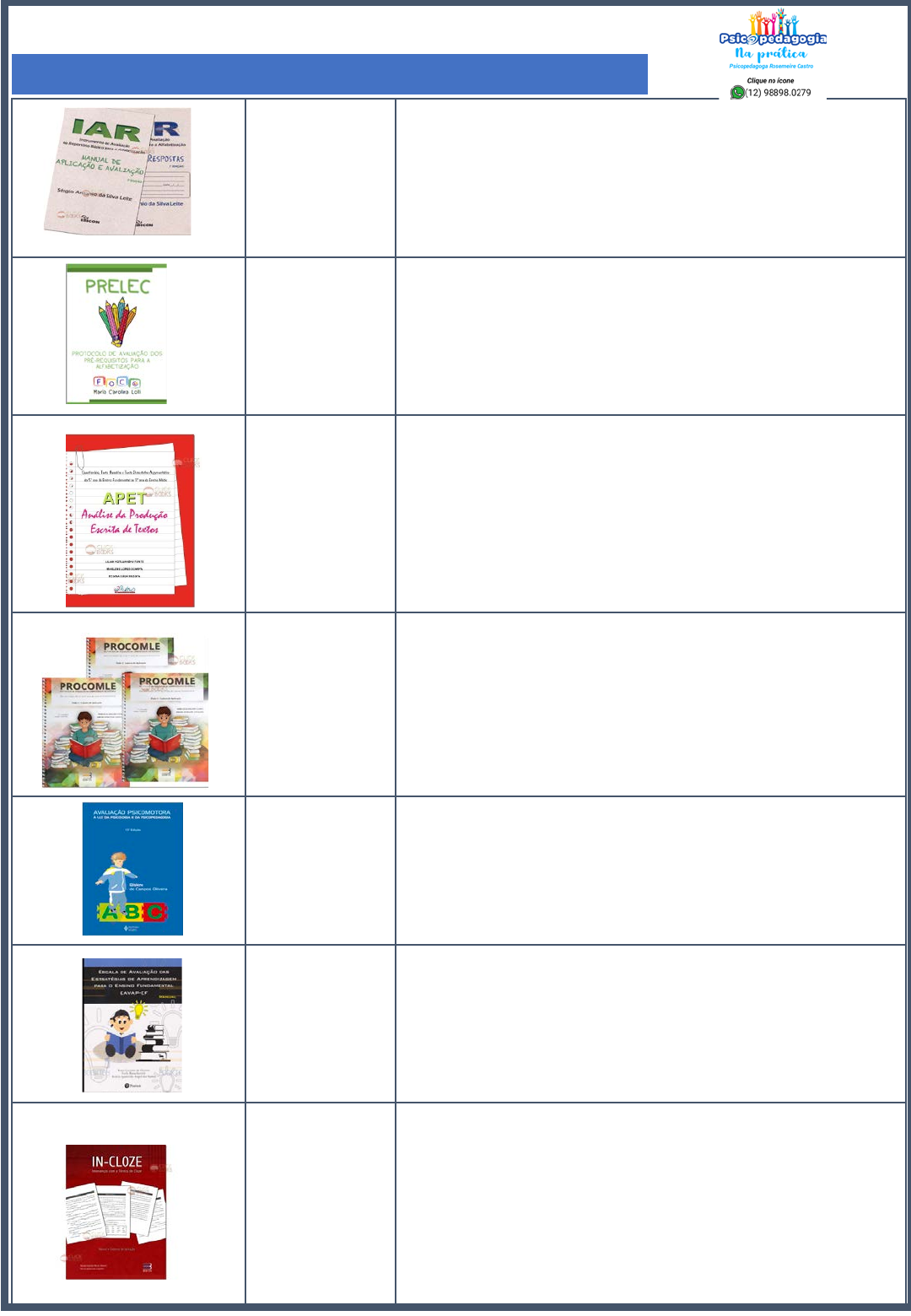 IAR- Instrumento de avaliação do repertório básico para alfabetização. R$27,00 O KIT R$ 15,00 Resp. Seus objetivos específicos são: a) avaliar o repertório comportamental das crianças no que diz respeito aos pré-requisitos fundamentais para a aprendizagem da leitura e escrita; b) possibilitar informações que indicarão se a criança está em condições ideais de iniciar a alfabetização propriamente dita; c) fornecer aos professores informações seguras sobre que habilidades ou conceitos deverão ser treinados para que a criança possa iniciar a aprendizagem da leitura e escrita. GRATUITO Protocolo de avaliação de Pré- Requisitos para Alfabetização Seus objetivos específicos são: a) avaliar o repertório comportamental das crianças no que diz respeito aos pré-requisitos fundamentais para a aprendizagem da leitura e escrita; b) possibilitar informações que indicarão se a criança está em condições ideais de iniciar a alfabetização propriamente dita; c) fornecer aos professores informações seguras sobre que habilidades ou conceitos deverão ser treinados para que a criança possa iniciar a aprendizagem da leitura e escrita. APET – Análise da produção escrita de textos 5º ano até 3º ano Ensino Médio. R$55,00 A avaliação do discurso escrito tem a função de verificar o nível de independência, domínio e eficácia do aprendente com a palavra escrita. Alguns instrumentos de avaliação encontrado na literatura estrangeira favorecem uma busca pelo autocontrole dos processos cognitivos (metacognição), associados à composição escrita. A avaliação deve refletir dois critérios: *critérios relacionados com o processo - consciência que o aprendente tem sobre suas atividades mentais presentes na sua produção escrita; *critérios relacionados com o produto - as características do texto (verificação das competências ortográfica, semântica-lexical, gramatical, textual e pragmática-discursiva). Protocolo de Avaliação da Compreensão de Leitura é indicado para escolares do 3º ao 5º ano do Ensino Fund. R$170,00 O PROCOMLE –. Pode ser utilizado por professores e coordenadores pedagógicos em contexto educacional de forma coletiva, e por fonoaudiólogos, psicopedagogos e psicólogos, em contexto clínico. A aplicação do protocolo tem a finalidade de identificar que tipo de dificuldades apresentam aqueles escolares que, apesar de lerem com proficiência, não conseguem responder perguntas sobre o que leram no final da leitura de um texto, como também verificar em quais níveis da estrutura do texto encontram-se estas dificuldades, sendo possível, assim, caracterizar o perfil e classificar o desempenho do escolar em compreensão de leitura. Avaliação Psicomotora: a Luz da Psicologia e da Psicopedagogia R$37,00 O livro salienta dados e informações sobre a validação do constructo e da consistência interna da bateria Psicomotora de Vitor da Fonseca, descreve os procedimentos detalhadamente de cada um dos fatores psicomotores e facilita a aplicação para todos os profissionais. EPP - ENTREVISTA ESTRUTURADA PARA PROFESSORES R$ 90,00 EAVAP-EF Escala de Avaliação das Estratégias de Aprendizagem para o Ensino Fundamental (Teste completo) (Teste Completo) Editora: PEARSON IN-CLOZE - INTERVENÇÃO COM A TÉCNICA DE CLOZE R$ 95,00 A partir de 9 anos O Programa de Intervenção com a Técnica de Cloze IN- CLOZE é um procedimento de intervenção para ser utilizado em contexto clínico e educacional por profissionais da área da educação e da saúde que tenham como objetivo auxiliar o desenvolvimento da compreensão de leitura em escolares com dificuldades específicas na compreensão leitora de textos narrativos e expositivos. Psicopedagoga Rosemeire Castro Testes- Intervenção psicopedagógicas/neuropsicopedagógicas 10-18 anos 5-6 anos A partir de 9 anos 5-6 anos Psicopedagoga: Rosemeire Castro ETDAH-CRIAD Escala de Autoavaliação do TDAH - R$48,10 A Escala de Autoavaliação do TDAH – Versão para Crianças e Adolescentes (ETDAH-CriAd) foi desenvolvida para trazer o entendimento da própria criança e do adolescente (com idades entre 6 e 15 anos) a respeito dos possíveis prejuízos de atenção, hiperatividade/impulsividade, bem como a intensidade do prejuízo (moderado ou grave). PROLEC Provas de Avaliação dos Processos de Leitura (Teste Completo) 2º ao 5º ano R$ 323,00 PROLEC é composto por diferentes tarefas que tratam de explorar todos os processos que interferem na leitura, dos mais periféricos aos mais centrais, bem como dos mais simples aos mais complexos. A principal vantagem destas provas consiste em derivar de um modelo bem fundamentado sobre o funcionamento do sistema de leitura (Dupla Rota), estando especificamente claros os processos que o compõem. Com estas provas não se obtém somente uma pontuação da capacidade de leitura dos escolares, como ocorre com as baterias clássicas. PRONAR-LE – Programa de Remediação com nomeação automática rápida e leitura 2º ao 5º ano R$ 150,00 ProNAR-LE é um instrumento de intervenção para uso clínico e educacional composto por três cadernos, sendo um manual de aplicação com a folha de respostas, um caderno de pranchas para avaliação e um caderno de pranchas para a intervenção. O caderno de pranchas para a avaliação é composto por 4 pranchas, sendo: letras, dígitos, cores e objetos. O caderno de pranchas para a intervenção é composto por 22 pranchas, incluindo figuras, cores, palavras e pseudopalavras .Este instrumento de remediação foi elaborado para ser aplicado em escolares com dificuldades de aprendizagem, transtorno específico de leitura (dislexia) e transtorno global da aprendizagem, visando diminuir as alterações no nível da decodificação, da precisão e da fluência da leitura da palavra destes escolares. PROTOCOLO DE AVALIAÇÃO DE HABILIDADES COGNITIVO- LINGÜÍSTICAS R$ 60,00 O protocolo não tem como objetivo estabelecer 
