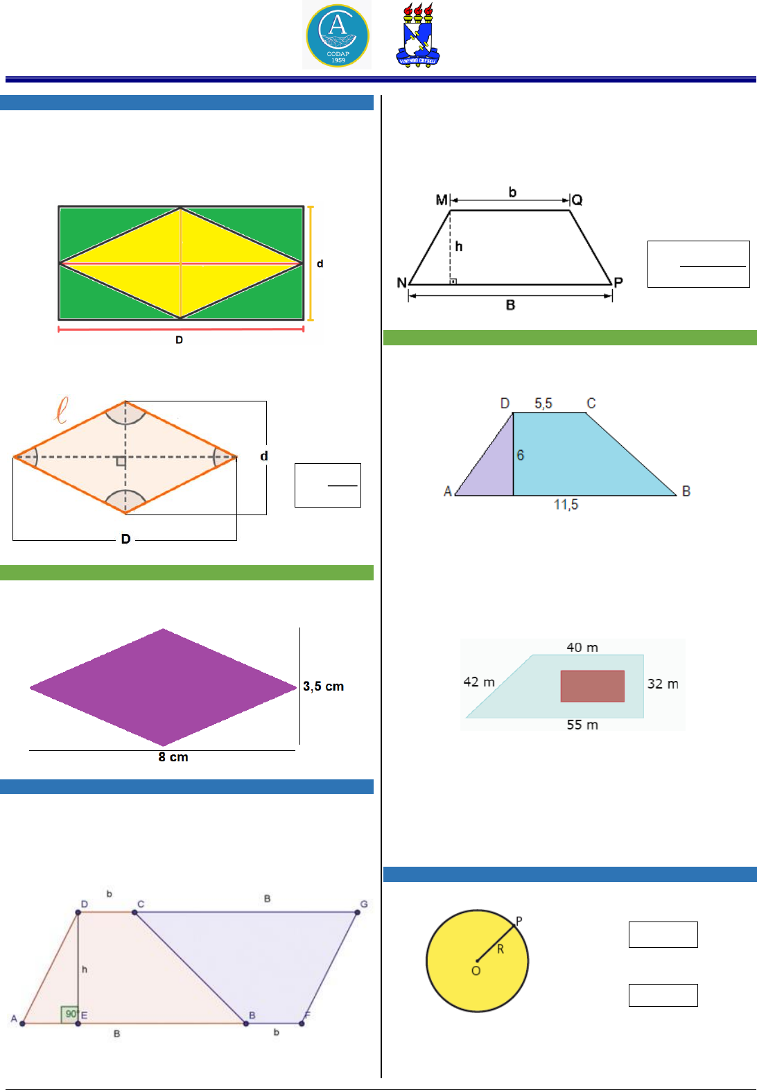 Página 1 ÁREAS DAS FIGURAS PLANAS (PARTE 2) Prof. MSc. RÍGEL RABELO 6. Losango ➢ O losango é um quadrilátero que possui os 4 lados com a mesma medida. Para calcularmos a sua área, devemos perceber que ele possui a metade da área de um retân- gulo. ➢ Dessa forma, a área do losango será dada por: ÁREA: D.d A 2 = EXERCÍCIOS DE AULA 01) Calcule a área do losango a seguir. 7. Trapézio ➢ Um trapézio é um quadrilátero que possui um par de lados paralelos. A figura a seguir mostra dois trapézios idênticos, colocados um ao lado do outro, formando um paralelogramo de base igual a (B + b) e altura h. ➢ A área desse paralelogramo é ( ).A B b h= + . Como essa área equivale a dois trapézios idênticos, então a área de cada um desses trapézios será a metade da área do paralelogramo. Logo: ÁREA: ( )B b .h A 2 + = EXERCÍCIOS DE AULA 02) Calcule a área do trapézio a seguir. 03) A figura a seguir representa um terreno com a forma de um trapézio retângulo. Nele será construída uma casa que ocupará o espaço representado pelo retângulo marrom. A área ocupada pela casa corresponderá a 20% da área do lote e a menor dimensão da casa medirá 50% do lado do terreno paralelo a ela. A maior dimensão da casa terá comprimento igual a a) 38 m. b) 35 m. c) 32 m. d) 30 m. e) 27 m. 8. Círculo ÁREA: 2A π.R= COMPRIMENTO: C 2π.R= Página 2 ÁREAS DAS FIGURAS PLANAS (PARTE 2) Prof. MSc. RÍGEL RABELO EXERCÍCIOS DE AULA 04) (IFPE 2018) A imagem abaixo reproduz a bandeira de uma das nações mais desenvolvidas em todo o mundo, o Japão. Sabendo que a bandeira tem formato retangular de dimen- sões 8 cm e 12 cm, e um círculo central de 2 cm de raio, usando π = 3, podemos afirmar que a área da bandeira pin- tada de branco, em centímetros quadrados, é a) 96. b) 90. c) 72. d) 84. e) 12. 9. Setor circular ➢ O setor circular é a região compreendida entre os seg- mentos que ligam dois pontos de uma circunferência (P e Q) ao centro (O) da mesma e o arco de circunferência que liga esses pontos P e Q. ÁREA DO SETOR: 2 setor 360 πR α A = COMPRIMENTO DO ARCO: arco 360 2π.R α C = EXERCÍCIO DE AULA 05) Encontre o comprimento do arco AB e a área do setor circular na figura a seguir. 10. Segmento circular ➢ Um segmento circular é a região compreendida entre o segmento que liga os pontos P e Q de uma circunferên- cia e o arco de circunferência que liga esses mesmos dois pontos. ÁREA DO SEGMENTO CIRCULAR: segmento setor triânguloA A A= − EXERCÍCIOS DE AULA 06) Calcule a área do segmento circular a seguir. 11. Coroa circular ➢ Uma coroa circular é a região externa a um círculo de raio r e interna a um círculo de raio R, com R > r, concên- trica à primeira. ÁREA DA COROA: 2 2A π.R π.r= − EXERCÍCIO DE AULA 07) Na área de lazer de um condomínio há um canteiro cir- cular de 5 metros de raio em torno do qual será colocada grama ao custo de R$ 45,00 por m2, conforme a figura a seguir. Usando a aproximação 3 = , o custo para cobrir toda essa região será de a) R$ 1215,00 b) R$ 3375,00 c) R$ 5265,00 d) R$ 6945,00 e) R$ 8640,00