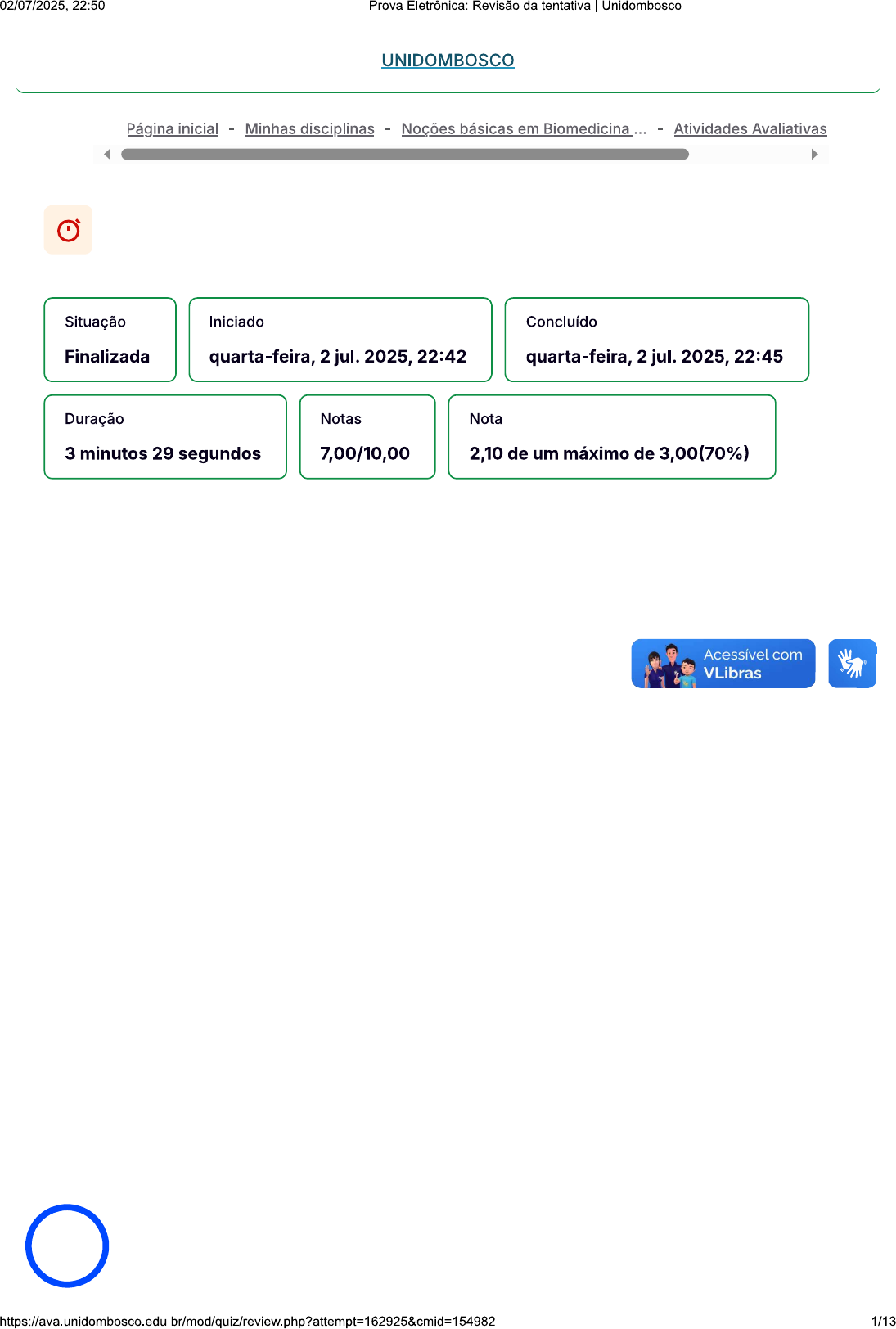 02/07/2025, 22:50 Prova Eletrônica: Revisão da tentativa Unidombosco UNIDOMBOSCO Página inicial - Minhas disciplinas Noções básicas em Atividades Avaliativas Situação Iniciado Concluído Finalizada quarta-feira, 2 jul. 2025, 22:42 quarta-feira, 2 jul. 2025, 22:45 Duração Notas Nota 3 minutos 29 segundos 7,00/10,00 2,10 de um máximo de 3,00(70%) Acessível com VLibras 1/1302/07/2025, 22:50 Prova Eletrônica: Revisão da tentativa Unidombosco UNIDOMBOSCO Os bioestimuladores são substâncias aplicadas na pele com a finalidade de prevenir e combater o envelhecimento cutâneo. Os ativos utilizados podem ser de vários tipos, porém, alguns acabam respondendo melhor aos objetivos esperados. Cada substância possui suas particularidades, mas, de maneira geral, propósito de aplicação é mesmo independente do produto escolhido. Com base nessas informações e no conteúdo estudado no livro da disciplina, analise as asserções a seguir e a relação proposta entre elas. I As substâncias mais utilizadas para realizar a bioestimulação é ácido polilático, a hidroxiapatita de cálcio e a policaprolactona. Porque: São substâncias biocompatíveis ao organismo, e promovem na pele um estímulo na produção de colágeno, tornando-a mais tonificada e firme. A seguir, assinale a alternativa correta: Escolha uma opção: Acessível com VLibras a. As asserções I e são proposições falsas. b. A asserção I é uma proposição verdadeira, e a II é uma proposição falsa. A asserção é uma proposição falsa, e a é uma proposição verdadeira. d. As asserções I e são proposições verdadeiras, e a é uma justificativa da I. e. As asserções I e são proposições verdadeiras, mas a não é uma justificativa da I. A resposta correta é: As asserções e são proposições verdadeiras, e a é uma justificativa da I. 2/1302/07/2025, 22:50 Prova Eletrônica: Revisão da tentativa Unidombosco UNIDOMBOSCO ácido hialurônico é uma substância muito utilizada no mercado da estética. A utilização dessa substância foi iniciada em cirurgia oftalmológica e no tratamento de osteoartrite de joelhos na década de 70. Extremamente utilizado para atuar contra envelhecimento, é poderoso devido ao seu alto poder de retenção hídrica, promovendo volume e hidratação. I A forma do ácido hialurônico que tem mais durabilidade e poder preenchedor é a não reticulado, gerando mais volumização de forma eficaz. Porque: Seu alto poder hidratante se deve a sua capacidade de retenção hídrica, uma vez que AH tem muita afinidade com água. A seguir, assinale a alternativa correta: Escolha uma opção: a. As asserções I e são proposições verdadeiras, e a é uma Acessível com VLibras b. As asserções e são proposições falsas. A asserção I é uma proposição falsa, e a é uma proposição verdadeira. As asserções e são proposições verdadeiras, mas a não é uma justificativa d. correta da I. e. A asserção I é uma proposição verdadeira, e a é uma proposição falsa. A resposta correta é: A asserção I é uma proposição falsa, e a é uma proposição verdadeira. 3/1302/07/2025, 22:50 Prova Eletrônica: Revisão da tentativa Unidombosco UNIDOMBOSCO A programação do equipamento de corrente russa é necessária para conhecer a função de alguns parâmetros, a fim de realizar a função correta para fortalecimento e tonificação muscular. Analise as afirmativas a seguir e assinale V para a(s) verdadeira(s) e F para a(s) falsa(s). I. Função ON, tempo para relaxar a região muscular. II. Função OFF, tempo que músculo leva para contrair. III. Função Rise, tempo de subida até a contração. IV. Função Decay, tempo de descida até relaxamento. V. Sequencial (Q): atuação em sequência, do menor para maior, tempo de contração e repouso serão iguais Agora, assinale a alternativa que apresenta a sequência correta: Escolha uma opção: Acessível com VLibras F,F,V,V,V. e. A resposta correta é: F,F,V,V,V. 4/1302/07/2025, 22:50 Prova Eletrônica: Revisão da tentativa Unidombosco UNIDOMBOSCO No início as terapias retro antivirais para os pacientes CID: B-24 (portadores de HIV) apresentavam uma proteólise significativa, a aparência frequentemente era muito magra e cadavérica. Na Europa em 1999, foi lançado um bioestimulador de colágeno para aumento da espessura dérmica, proporcionando uma aparência saudável aos pacientes. Qual a primeira substância e marca lançada para bioestimulação de colágeno? Escolha uma opção: a. Ácido Poli- L-lático Elleva b. Policaprolactona Ellansé C. Policaprolactona - Sculptra d. Hidroxiapatita de Cálcio - Radiesse Acessível com VLibras e. Ácido Poli-L-lático - Sculptra A resposta correta é: Ácido Poli-L-lático Sculptra 5/1302/07/2025, 22:50 Prova Eletrônica: Revisão da tentativa Unidombosco UNIDOMBOSCO Com a penetração das ondas ultrassônicas no tecido-alvo, alguns efeitos são produzidos, como efeito térmico e efeito mecânico, ambos são importantes para resultado gerado pelo ultrassom. Cada efeito gera características específicas. Assinale quais alternativas indicam efeito térmico (1) e quais indicam efeito mecânico (2): (1) Efeito térmico (2) Efeito mecânico Estimulação do metabolismo celular. ( ) Melhora da permeabilidade cutânea. Realização de micromassagem celular. Aumento da circulação sanguínea, através do calor. Agora, assinale a alternativa que apresenta a sequência correta: Escolha uma opção: a. ET, ET, EM e Acessível com VLibras b. ET, EM e ET. C. EM e ET. d. ET, ET, ET e EM. e. ET, EM e ET. A resposta correta é: ET, EM e ET. 6/1302/07/2025, 22:50 Prova Eletrônica: Revisão da tentativa Unidombosco UNIDOMBOSCO ultrassom é um método que utiliza de ondas sonoras através de um cabeçote, com transdutor perpendicular à área a ser tratada, e sempre mantido em contato com o agente de acoplamento, de modo a não gerar a formação de bolhas de ar. Considerando a definiç