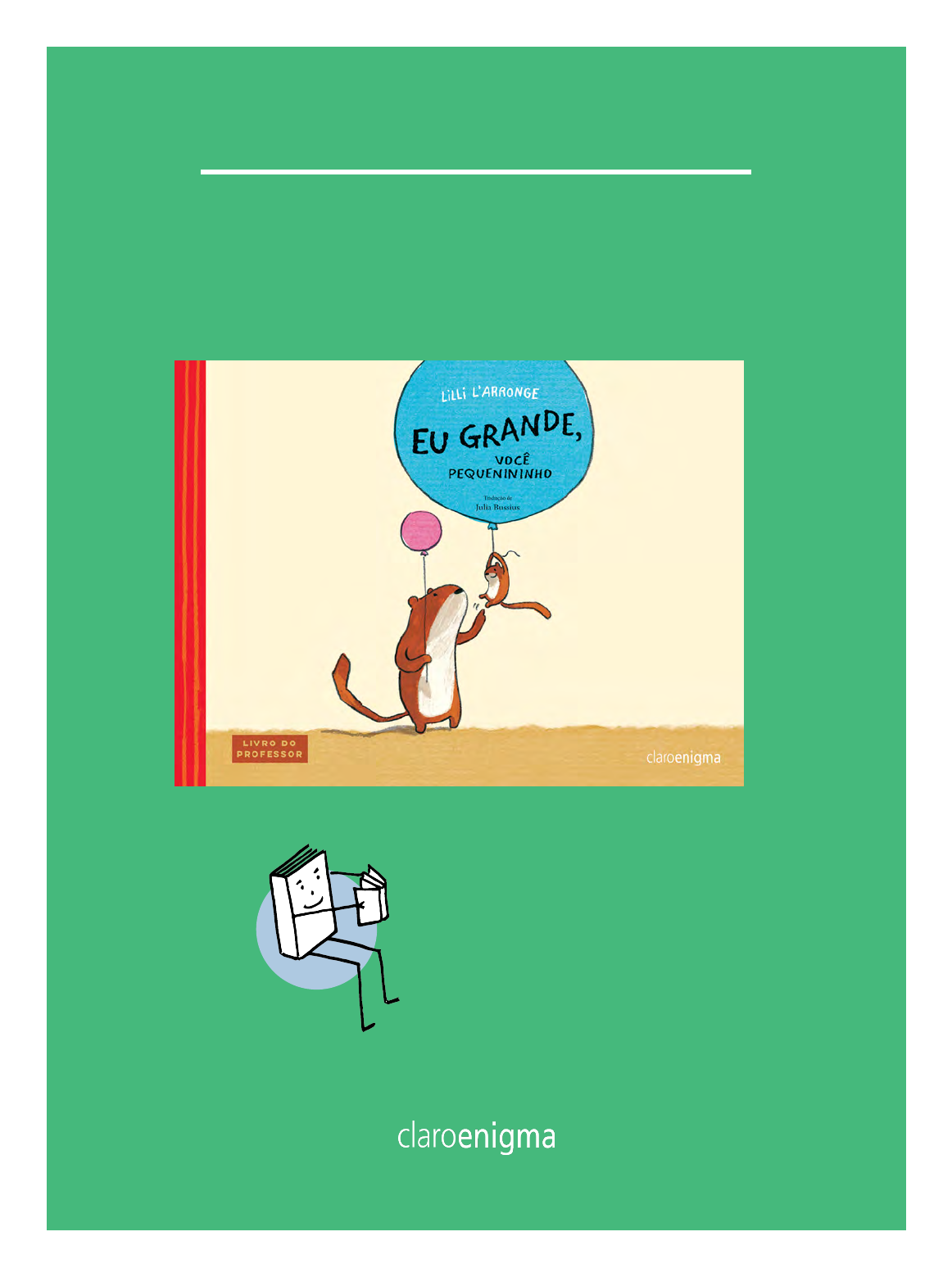 Material Digital do ProfessorMaterial Digital do Professor AUTORIA Lucila Silva de Almeida Especialista do Instituto Avisa Lá COORDENAÇÃO Ana Carolina Carvalho Coordenadora do Instituto Avisa Lá AUTORIA Lucila Silva de Almeida Especialista do Instituto Avisa Lá COORDENAÇÃO Ana Carolina Carvalho Coordenadora do Instituto Avisa Lá LIVRO Eu grande, você pequenininho AUTORA E ILUSTRADORA Lilli L’Arronge TRADUTORA Julia Bussius CATEGORIA Creche II ESPECIFICAÇÃO DE USO Para que o professor leia para crianças bem pequenas TEMAS Quotidiano de crianças nas escolas, nas famílias e nas comunidades (urbanas e rurais); Relacionamento pessoal e desenvolvimento de sentimentos de crianças nas escolas, nas famílias e nas comunidades (urbanas e rurais) GÊNERO LITERÁRIO Poemas, trava-línguas, parlendas, adivinhas, provérbios, quadrinhas, etc. Material Digital do ProfessorMaterial Digital do Professor Conteúdo Instituto Avisa Lá — Formação Continuada de Educadores Coordenação Ana Carolina Carvalho Revisão Ana Luiza Couto Luciane H. Gomide 2021 Todos os direitos desta edição reservados à editora claro enigma ltda. Rua Bandeira Paulista, 702 — Parte cj. 72 04532-002 — São Paulo — sp Telefone: (11) 3707-3531 Dados Internacionais de Catalogação na Publicação (cip) Angélica Ilacqua crb-8/7057 Almeida, Lucila Silva de Material digital do professor : Eu grande, você peque- nininho / Lucila Silva de Almeida ; coordenação de Ana Carolina Carvalho, Instituto Avisa Lá. – 1a ed. – São Paulo : Claro Enigma, 2021. Bibliografia isbn 978-65-89870-00-5 1. Literatura infantil — Estudo e ensino 2. Material de apoio ao professor i. Título ii. L’Arronge, Lilli. Eu grande, você pequenininho iii. Carvalho, Ana Carolina iv. Instituto Avisa Lá 21-1752 cdd 372.64044 Índice para catálogo sistemático: 1. Literatura infantil — Estudo e ensino 372.64044 4 Carta Cara educadora, caro educador, Neste material você vai encontrar apoio para trabalhar com o livro Eu grande, você pequenininho. Desde já, enfatizamos que as propostas aqui apresentadas são sobretudo sugestões e não pretendem esgotar as possibi- lidades de leitura da obra. Ele é composto dos seguintes itens: Contextualização da obra: informações e aspectos importantes sobre o livro e sobre a autora, a ilustradora e a tradutora. Por que ler este livro na Educação Infantil?: relações com competên- cias gerais e campos de experiência da Base Nacional Comum Curricu- lar (bncc), reforçando como a obra contribui para a formação leitora das crianças nessa etapa escolar. Conversas em torno da leitura deste livro: aspectos importantes para a experiência literária, assim como para o planejamento de uma leitura dialogada com as crianças. Outras propostas de atividades: sugestões para apoiar a experiência de leitura, com atividades a serem realizadas após a leitura comparti- lhada. Outras propostas de leitura com as crianças: sugestões para explo- rar a literacia familiar, para trabalhar a leitura pelas próprias crianças e para ampliar os laços com outros leitores. Bibliografia comentada: obras usadas para elaborar este material, com um breve comentário. Indicação de leituras complementares: sugestão de materiais que dialogam com os conteúdos e temas abordados e contribuem para o tra- balho do(a) educador(a). 5 Este Material digital do professor foi produzido com a supervisão do Ins- tituto Avisa Lá — Formação Continuada de Educadores, organização da so- ciedade civil sem fins lucrativos que vem contribuindo, desde 1986, para qualificar a prática educativa nos centros de Educação Infantil, creches e pré-escolas públicas. Junto com as redes de Ensino Fundamental, o Insti- tuto Avisa Lá desenvolve ações de formação para profissionais de educação visando à competência da leitura, escrita e matemática dos estudantes nos anos iniciais. A coordenação pedagógica do Avisa Lá acompanhou a redação e a edição do material escrito por especialistas em leitura e escrita. O manual também contou com a leitura crítica de toda a equipe envolvida na produção editorial. Nossa intenção foi indicar caminhos para que você, educador(a), possa mediar uma experiência literária significativa para bebês e crianças da Edu- cação Infantil, contribuindo para que eles construam sentidos na leitura, ampliando suas referências estéticas e literárias. Bom trabalho! 6 Contextualização da obra Eu grande, você pequenininho foi escrito e ilustrado por Lilli L’Arronge. É um livro sensível que aborda uma temática comum a várias obras da autora: as relações familiares e as descobertas sobre si. São de sua autoria títulos infan- tis como Nós agora somos quatros e Caos, também publicados no Brasil. Nas- cida em 1979, é formada em Comunicação Visual na Universidade Bauhaus, em Weimar, na Alemanha, onde mora atualmente. Trabalha como ilustrado- ra e escreve e ilustra livros para crianças e adultos. Nas obras infantis, as ilustrações delicadas permitem que o leitor articule as imagens e o texto e possa se apropriar da obra atribuindo outros sentidos nessa experiência literária. Eu grande, você pequenininho é escrito em forma de quadrinhas — um tipo de poesia composto de quatro versos — e retrata a relação entre um pai e seu filho. A escolha de palavras no diminutivo é proposital; afinal, para os pais, os filhos parecem nunca crescer. Aliás, a autora nos convida a atentar para o jogo entre diminutivo e aumentativo: além de ser explorado nas ri- mas, ele é destacado no título do livro e em algumas ilustrações, como nos regadores da página 3. 7 Essa é uma obra que possibilita que todas as crianças sintam-se repre- sentadas, pois retrata cenas extremamente comuns do cotidiano de crianças pequenas e suas famílias. Publicado originalmente em 2014 na Alemanha, aqui no Brasil o livro foi cuidadosamente traduzido do alemão por Julia Bussius, bacharel em Jo