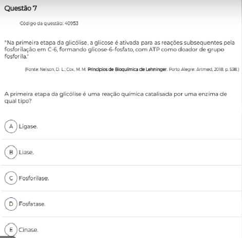 Questão 7 Código da questão: 40953 "Na primeira etapa da a glicose é ativada para as reações subsequentes pela fosforilação em C-6, formando glicose-6-fosfato, com ATP como doador de grupo fosforila." (Fonte: D. L; M.M. Principios de de Porto Alegre: Artmed, 2018. p. A primeira etapa da glicólise é uma reação quimica catalisada por uma enzima de qual tipo? A Ligase. B Liase. C D E Cinase.