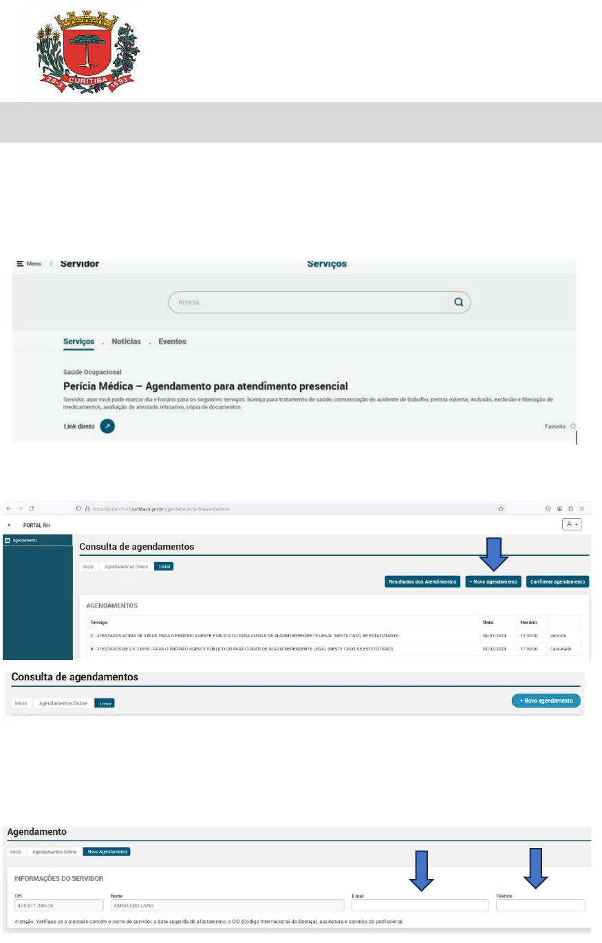 Prefeitura Municipal de Curitiba Secretaria Municipal de Gestão de Pessoal Departamento de Saúde Ocupacional Gerência de Perícia Médica Rua Heitor Stockler de França, 356-Centro Cívico 80030-030 Curitiba - PR Telefone: (41) 3350-9884 Orientações Técnicas para cadastrar documentos no link PERÍCIA- AGENDAMENTO PARA ATENDIMENTO PRESENCIAL 1 - Ao entrar no serviço Perícia Médica - Agendamento para atendimento presencial, e clique em link direto. 2 – Na tela Consulta de Agendamento, clicar no botão “+Novo Agendamento” 3 – Na tela de Novo Agendamento preencha: • Email de contato (não obrigatório) • Telefone (obrigatório) Prefeitura Municipal de Curitiba Secretaria Municipal de Gestão de Pessoal Departamento de Saúde Ocupacional Gerência de Perícia Médica Rua Heitor Stockler de França, 356-Centro Cívico 80030-030 Curitiba - PR Telefone: (41) 3350-9884 4 – Anexar arquivo. Fotografe o atestado para anexa-lo • Clique no botão “procurar”. Localize o atestado no celular ou computador. O nome do documento deverá aparecer ao lado do botão. • Em seguida, clique no botão “Adicionar”. • O arquivo anexo deve aparecer logo abaixo com o link para visualizar ou excluir. 5 – Escolha uma das opções conforme se enquadra no seu caso. • Ao escolher a opção o campo data aparece para escolha da mesma. • Escolha a data para abrir os horários . • Após escolher Data e horário, clique no botão agendar. 6 – Após a finalização o sistema emite comprovante do agendamento. Compareça na data e hora marcada na Perícia Médica. 7 – Na pericia médica, confirme sua presença nos totens da recepção e aguarde a chamada no painel de Tv. A confirmação só poderá ser realizada a partir de 15 minutos antes até 5 minutos depois do horário agendado. Em caso de atraso, deverá agendar novo horário.