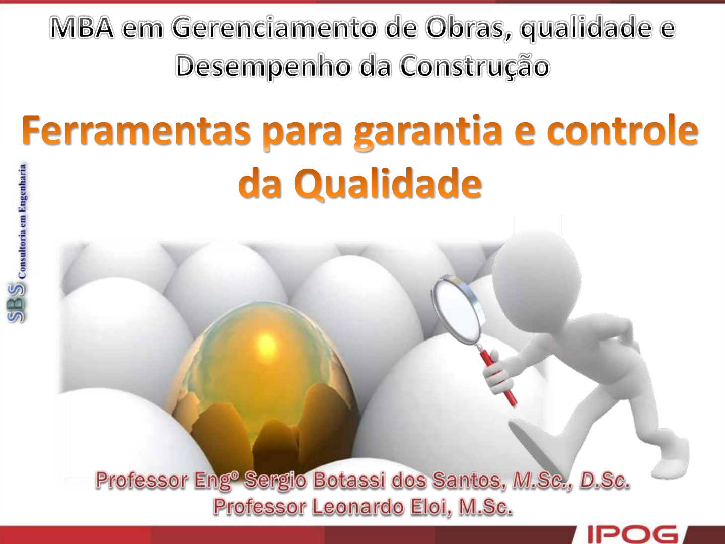 Ferramentas p/ garantia e controle da Qualidade – MBA em Gerenc. de Obras, qualidade e Desempenho da Construção 1 V e rs ã o I II – R e v . 0 – J a n / 2 0 2 0 T o d o s o s d ir e it o s re s e rv a d o s a o a u to r Ferramentas p/ garantia e controle da Qualidade – MBA em Gerenc. de Obras, qualidade e Desempenho da Construção 2 OBJETIVOS ➢ Geral: Apresentar ferramentas quantitativas para garantia e controle da qualidade, utilizando o software MS-Excel® para apoio à tomada de decisão. ➢ Específicos: ✓ Compreender os princípios da garantia e controle da qualidade de forma quantitativa; ✓ Conhecer metodologia para garantia da qualidade - Planejamento de Experimentos; ✓ Aplicar técnica estatística de Analise de Variância para a garantia da qualidade; ✓ Conhecer princípios do Controle Estatístico da Qualidade; ✓ Aplicar Técnica 3-Sigma para Controle Estatístico de Processos. Ferramentas p/ garantia e controle da Qualidade – MBA em Gerenc. de Obras, qualidade e Desempenho da Construção 3 PLANO DE AULA: Assunto Recursos Audiovisuais Duração (h) Apresentação do Módulo: Bibliografia, Objetivos e Método Avaliatório Datashow 0,25 Introdução a Gestão Quantitativa da Qualidade Datashow 0,50 Princípios Estatísticos para quantificação da qualidade Datashow 0,25 Funções estatísticas básicas e aplicação em gestão quantitativa da qualidade Datashow/Computador 0,75 Resolução de Estudos de Caso de Funções Estatísticas Datashow/Computador 1,50 Planejamento de experimentos - DOE Datashow 1,50 Aplicação de planejamento de experimentos - Estudo de Caso Resolvido Datashow 1,00 Análise de Variância - ANOVA Datashow 1,00 Estudos de caso aplicado para ANOVA Fator único Datashow/Computador 1,00 Resolução da Primeira Lista de Atividades Computador 3,00 Fundamentos de Controle da Qualidade Datashow 0,50 Princípios do Controle Estatístico de Processos – CEP Datashow 1,00 Gráficos de Controle da Qualidade Datashow 3,00 Definição dos Limites de Controle e de Especificação Datashow 0,75 Cálculo da capacidade e desempenho do processo Datashow/Computador 1,00 Resolução da Segunda Lista de Atividades Computador 3,00 Duração Total Estimada: 20h efetivas Ferramentas p/ garantia e controle da Qualidade – MBA em Gerenc. de Obras, qualidade e Desempenho da Construção 4 BIBLIOGRAFIA RECOMENDADA ➢ MONTGOMERY, D. C. Estatística Aplicada e Probabilidade para Engenheiros. Ed. LTC, 2009. ➢ ABNT. Guia sobre técnicas estatísticas para a ISO 9001. NBR ISO 10017, 2005. ➢ ABNT. Sistemas de gestão da qualidade - Requisitos. NBR ISO 9001, 2008. ➢ MONTGOMERY, D. C. Introdução à Controle Estatístico de Processos. Ed. LTC, 2004. ➢ BRUNI, A. L.; PAIXÃO, R. B. Excel Aplicado à Gestão Empresarial. Ed. Atlas, 2008. ➢ Ministério das Cidades. Regimento do Sistema de Avaliação da Conformidade de Empresas e Serviços e Obras da Construção Civil. PBQP-H, 2012. ➢ CARLBERG, C. Administrando a Empresa com Excel. São Paulo: Makron Books, 2005. ➢ LEOPOLDINO, E. A. Introdução à Pesquisa Operacional: Métodos e modelos para análise de decisões. 3ª Edição. Ed. LTC. Rio de Janeiro, 2004. http://images.google.com.br/imgres?imgurl=http://batatatransgenica.files.wordpress.com/2008/12/livros.jpg&imgrefurl=http://batatatransgenica.wordpress.com/2008/12/&usg=__H7SYggRIepNersaN6ac3oJajhiw=&h=570&w=632&sz=28&hl=pt-BR&start=2&um=1&tbnid=dNdYtTQ5dqFv-M:&tbnh=124&tbnw=137&prev=/images?q=LIVROS&hl=pt-BR&um=1 Ferramentas p/ garantia e controle da Qualidade – MBA em Gerenc. de Obras, qualidade e Desempenho da Construção 5 MÉTODO AVALIATÓRIO Critérios Objetivos: 1º) Desempenho nas listas de exercícios; 2º) Desempenho nos exemplos; 3º) Assiduidade; 4º) Presença remota (eliminatória). Princípios: A avaliação será baseada na capacidade do aluno de compreender e desenvolver os temas abordados nesse módulo. Critérios Subjetivos: 1º) Participação pró-ativa nas atividades; 2º) Respeito ao colega (silêncio nas horas devidas); 3º) Presença mental; 4º) Critério de desempate: “Agradar” o professor. 2 7 5 9 10 Ferramentas p/ garantia e controle da Qualidade – MBA em Gerenc. de Obras, qualidade e Desempenho da Construção Afinal, O que é Qualidade? Capacidade de se atender a necessidade de alguém ou de algo. 6 Lembre-se: Atender a necessidade não é absoluto, mas sim relativo. Atender a Necessidade (referência)… ✓ Respeito a requisitos normativos (ex.: NBR, ISO); ✓ Interesses sociais (ex.: leis e regulamentos); ✓ Necessidades coletivas (ex.: tendências de mercado); ✓ Necessidades individuais (ex.: projetos em geral). Atender a necessidade = Agregar Valor http://images.google.com.br/imgres?imgurl=http://educar.files.wordpress.com/2008/04/duvida.jpg&imgrefurl=http://educar.wordpress.com/2008/04/13/duvida-metodica-sobre-esta-discussao/&usg=__IOUKg2PartOuSyGKkxlLSAjTvfw=&h=442&w=640&sz=175&hl=pt-BR&start=11&tbnid=i959ujM2sX11LM:&tbnh=95&tbnw=137&prev=/images?q=d%C3%BAvida&gbv=2&hl=pt-BR Ferramentas p/ garantia e controle da Qualidade – MBA em Gerenc. de Obras, qualidade e Desempenho da Construção Formas de atendimento da Qualidade 7 O Propósito da qualidade pode ser atingido de duas formas: Qualidade do Processo: ✓ Racionalização dos recursos; ✓ Padronização das rotinas; ✓ Confiabilidade e previsibilidade dos resultados; ✓ Foco na produtividade e melhoria contínua. Qualidade do Produto: ✓ Satisfação do cliente; ✓ Alto desempenho (uso racional e durável); ✓ Confiabilidade e segurança. Ferramentas p/ garantia e controle da Qualidade – MBA em Gerenc. de Obras, qualidade e Desempenho da Construção Para se manter um Sistema de Gestão da Qualidade é fundamental se respeitar: 8 ◆ Garantia da Qualidade: Ações planejadas para se assegurar os padrões de qualidade. Princípios: - Produto deve ser adequado à finalidade pretendida; - Erros devem ser eliminados antes de acontece-lo.