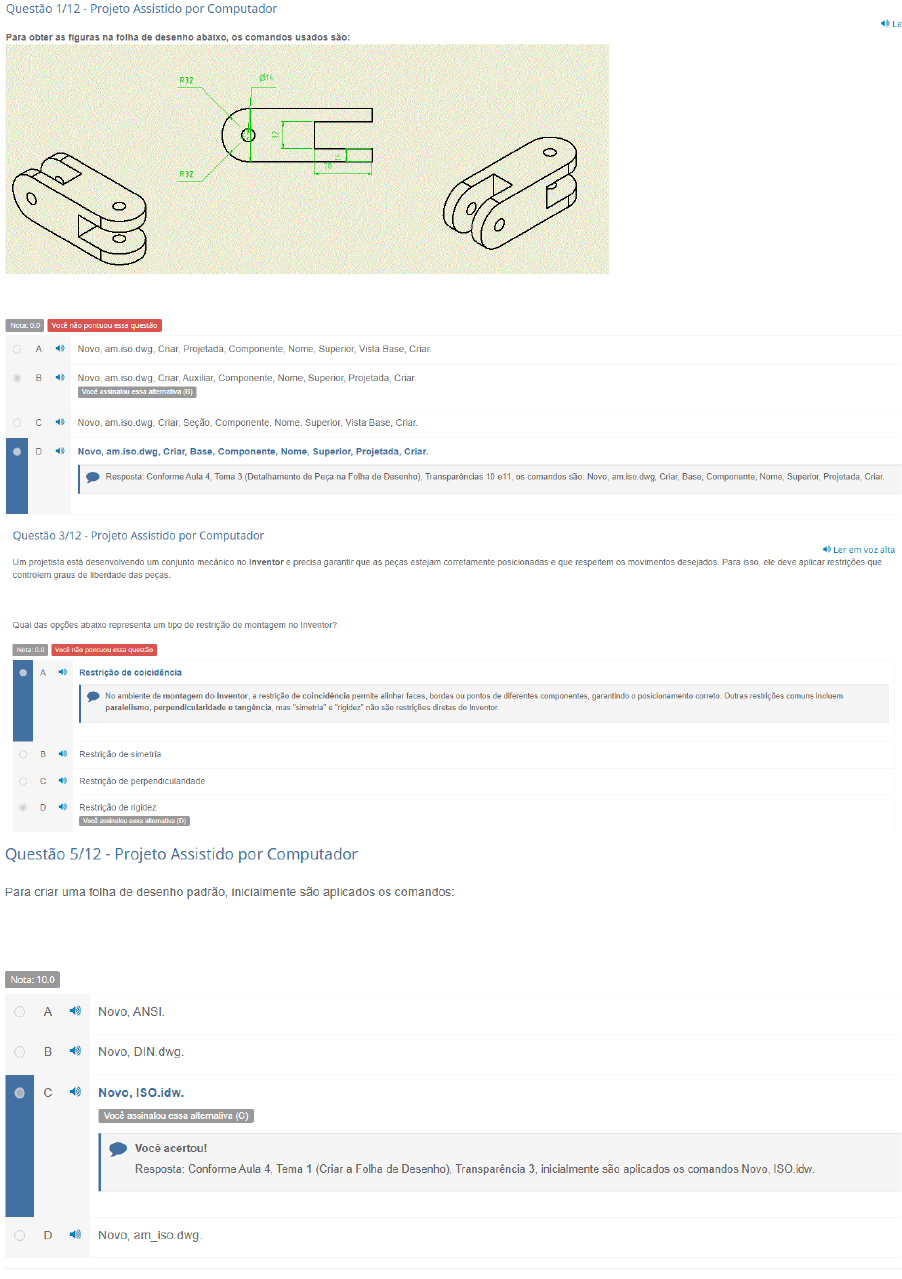 Questão 1/12 Projeto Assistido por Computador Le Para obter as figuras na folha de desenho abaixo, os comandos usados são: R32 016 R32 Nota: 0.0 pontuou essa questão A Novo, am iso dwg, Criar, Projetada, Componente, Nome, Superior, Vista Base, Novo, am iso dwg, Criar, Auxiliar, Componente, Nome, Superior, Projetada, Você assinalou essa alternativa C am iso dwg, Criar, Seção, Componente, Nome, Superior, Vista Base, D am.iso.dwg, Criar, Base, Componente, Nome, Superior, Projetada, Criar. Resposta: Conforme Aula 4. Tema 3 3 (Detalhamento de Peça na Folha de Desenho), Transparências 10 os comandos são: Novo, am.iso dwg, Base, Componente, Nome, Superior, Projetada, Questão 3/12 Projeto Assistido por Computador Ler em voz alta Um projetista está desenvolvendo um conjunto mecânico no Inventor e precisa garantir que as peças estejam corretamente posicionadas e que respeitem movimentos desejados. Para isso, ele deve aplicar restrições que controlem graus de liberdade das peças. Qual das opções abaixo representa um tipo de restrição de montagem no Inventor? pontuou essa questão A Restrição de coicidência No ambiente de montagem do Inventor, restrição de coincidência permite alinhar faces, bordas ou pontos de diferentes componentes, garantindo posicionamento correto Outras restrições comuns incluem paralelismo, perpendicularidade tangência, mas "simetria" "rigidez" não são restrições diretas do B Restrição de simetria C Restrição de perpendicularidade D Restrição de rigidez Você assinalou essa alternativa Questão 5/12 Projeto Assistido por Computador Para criar uma folha de desenho padrão, inicialmente são aplicados comandos: Nota: 10.0 A Novo, ANSI. B Novo, DIN.dwg. C Novo, ISO.idw. Você assinalou essa alternativa (C) Você acertou! Resposta: Conforme Aula 4, Tema 1 (Criar a Folha de Desenho), Transparência 3, inicialmente são aplicados os comandos Novo, D Novo, am_iso.dwg.Questão 6/12 Projeto Assistido por Computador Ler em alta Para fazer um eixo cilíndrico liso no software Auto Desk Inventor com diâmetro de 20mm X 100 de comprimento devemos seguir passos: Nota: 10.0 A Iniciar 0 esboço 2D, selecionar 0 plano de trabalho, clicar no icone linha, posicionar no centro, abrir um circulo, editar a cota do diâmetro, reabrir 0 esboço, clicar no icone extrusão editar a cota de comprimento, selecionar sentido e finalizar Iniciar esboço 2D, selecionar o plano de trabalho, clicar no icone do circulo, posicionar no centro, abrir um circulo, editar a cota do diâmetro, encerrar esboço, clicar no icone extrusão editar a cota de comprimento, selecionar sentido e finalizar comando. Você assinalou essa alternativa Você acertou! Resposta: rota de aprendizagem da aula 1 Iniciar esboço 2D, selecionar 0 plano de trabalho, clicar no icone do circulo, posicionar no centro, abrir um circulo, encerrar 0 esboço, clicar no icone extrusão editar a cota de comprimento, selecionar sentido D Iniciar 0 esboço 2D, selecionar 0 plano de trabalho, clicar no icone do circulo, posicionar no centro, abrir um circulo, editar a cota do diâmetro, clicar no icone extrusão editar a cota de comprimento, selecionar sentido e finalizar 0 Questão 10/12 Projeto Assistido por Computador Utilizado para arredondar cantos vivos. Selecione comando, edite 0 valor do raio e clique nas arestas à arredondar ou no ponto de encontro da linhas. Nota: 10.0 A Comando Comando Filet. Você assinalou essa alternativa (B) Você acertou! Comando line. Comando Circulo.Questão 11/12 Projeto Assistido por Computador (questão opcional) Ler em voz alta Durante uma aula prática de Projeto Assistido por computador, alunos foram orientados a modelar uma peça mecânica simples no Autodesk Para isso, utilizaram recursos de esboço 2D e extrusão 3D, com 0 objetivo de gerar a representação tridimensional da peça antes da elaboração do desenho técnico conforme a peça abaixo: No Autodesk Inventor, qual é recurso utilizado para transformar um esboço bidimensional em um modelo tridimensional? Nota: 10.0 A Revolução, gera sólidos girando um perfil Revolução Gera sólidos girando um perfil 2D, mas não operação padrão para criar volumes retos B Extrusão, transforma perfis 2D em sólidos 3D Você assinalou essa alternativa Você acertou! Extrusão Correta: Transforma perfis 2D em sólidos 3D ao "empurrá-los" numa C Aparar, Utilizada para cortar elementos em esboços Aparar Incorreta: Utilizada para cortar elementos em esboços, não para criar D Espelhar reproduz geometrias simetricamente Espelhar Reproduz geometrias simetricamente, não cria volumes Questão 12/12 Projeto Assistido por Computador (questão opcional) Para realizar uma rosca M10x1,5 devemos selecionar comando Temos que selecionar 0 tipo de rosca que iremos usar. Para realizar a rosca temos que fazer a furção, onde iremos dimensionar a profundiade da rosca e a profundiade do furo. analise a cotas correta: Nota: 10.0 A A profundidade da rosca 20mm e a profundidade do furo 15mm. A profundidade do furo 20mm e profundidade da rosca 15mm. Você assinalou essa alternativa (B) Você acertou! A profundiade do furo tem que ser maior que a profundide da rosca C A profundidade da rosca 20mm e profundiadde da rosca 20mm D A profundidade da rosca 15mm e a profundiade do furo 15mm