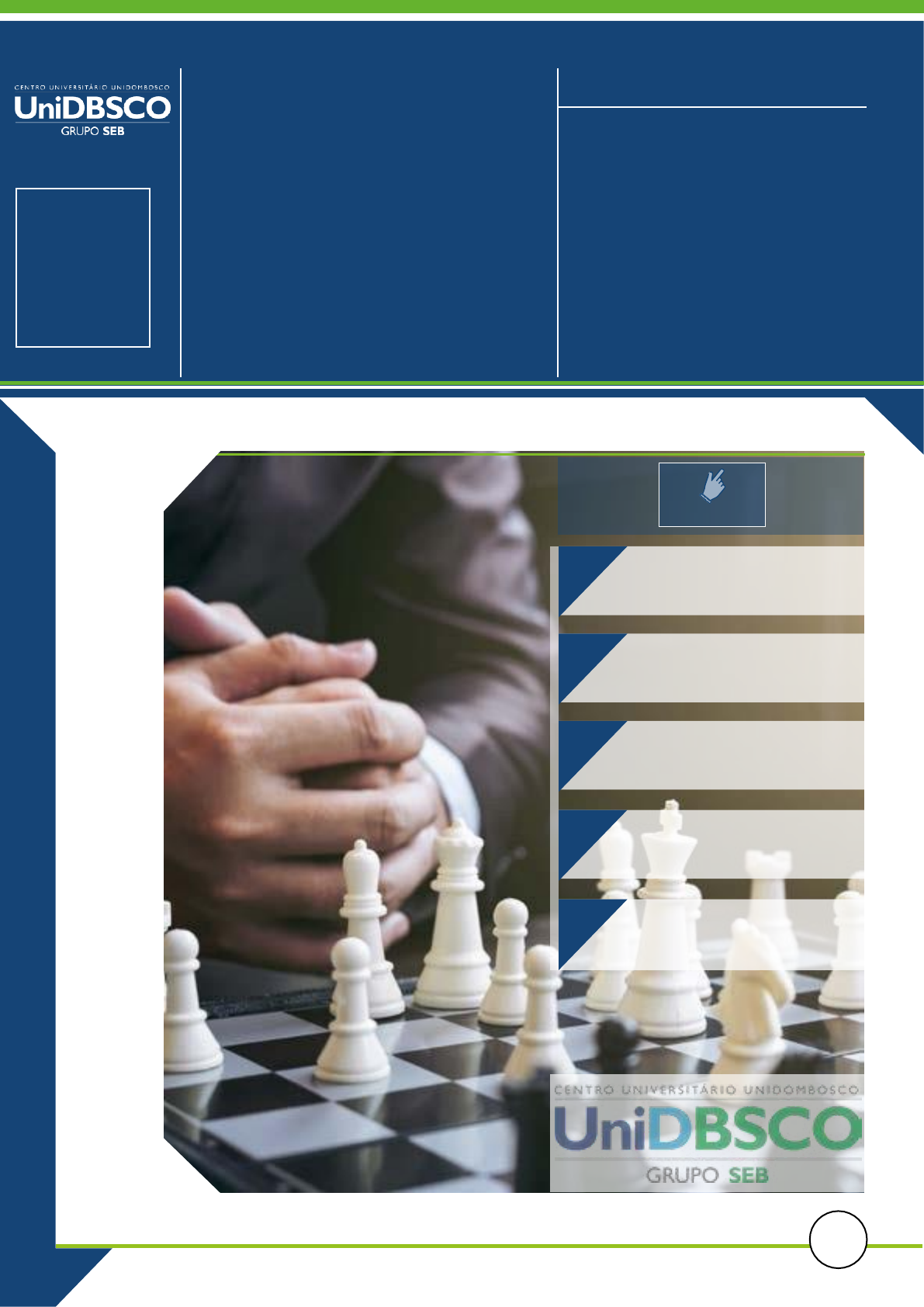 1. Apresentação da Unidade de Aprendizagem 2. Objetivos 3. Conteúdos 4. Aplicação Prática 5. Autoestudo PLANEJAMENTO ESTRATÉGICO Rota de Aprendizagem 1 Introdução ao Planejamento Estratégico 1 Rota de Aprendizagem 1 Introdução ao Planejamento Estratégico Clique no segmento para acessar o conteúdo 2o Período • Nível hierárquico Operacional. • Nível hierárquico Tático. • Nível hierárquico Estratégico. 1. Apresentação da unidade de aprendizagem Nesta unidade serão desenvolvidos os conceitos fundamentais de Planeja- mento Estratégico. Serão abordados os conceitos de riscos inerentes às estratégias. A visão empreendedora estratégica para atingirem-se os objetivos organizacionais. Será abordado também, o conceito hierárquico organizacional de estratégico, tático e operacional. 2. Objetivos • Conhecer o conceito de Planejamento Estratégico. • Compreender que toda estratégia nunca é uma certeza e sempre envolve riscos. • Compreender para que serve uma Estratégia. • Compreender que a formulação de uma estratégia diminui os riscos e incertezas em relação à sobrevivência sustentável em longo prazo das empresas. • Compreender o conceito do nível hierárquico Estratégico. • Compreender o conceito do nível hierárquico Tático. • Compreender o conceito do nível hierárquico Operacional. 3. Conteúdos • Conceitos de Planejamento Estratégico. • Riscos inerentes à uma Estratégia. • Para que serve uma estratégia. 4. Aplicação Prática O aluno deve refletir sobre os conceitos trabalhados e buscar identificar no seu dia a dia questões relativas à estratégia empresarial. Deverá refletir sobre como a formulação da estratégia empresarial poderá influenciar a sobrevivência organiza- cional. 5. Autoestudo Capítulo Norteador Capítulo 01 (p. 01 à 14) - NOGUEIRA, Cleber Suckow. Planejamento Estratégico. São Paulo: Pearson Education do Brasil, 2014. (livro eletrônico). Descrição das Atividades a) Sugestão de leitura: Capítulo 01 - CERTO, Samuel C. PETER, J. P. Administração Estratégica. 3ª Edição. São Paulo: Pearson Education do Brasil, 2005. (livro eletrônico). Capítulo 01 (p. 01 à 14) - NOGUEIRA, Cleber Suckow. Planejamento Es- tratégico. São Paulo: Pearson Education do Brasil, 2014. (livro eletrônico). Parte I e II - SAADE, Alessandro. GUIMARÃES, Thelma. Dominando Estra- tégias de Negócios. São Paulo: Financial Times, Prentice Hall, 2006. (livro 2 3 Rota de Aprendizagem 1 Introdução ao Planejamento Estratégico Rota de Aprendizagem 1 Introdução ao Planejamento Estratégico Planejamento Estratégico Introdução ao Planejamento Estratégico 2o período eletrônico). b) Sugestão de vídeos: Vídeo Aula da Unidade 01 – postado no AVA. 6. Referências BARNEY, J.B. e HESTERLY, W. S. Administração Estratégica e Vantagem Competiti- va. São Paulo: Pearson Prentice Hall, 2007. BARNEY, J.B. e HESTERLY, W. S. Administração Estratégica e Vantagem Competiti- va. São Paulo: Pearson Prentice Hall, 2007. (livro eletrônico). CAMPOS, Letícia Mirella Fischer. Administração Estratégica. Curitiba: Intersaberes, 2016. (livro eletrônico). CERTO, Samuel C. PETER, J. P. Administração Estratégica. 3ª Edição. São Paulo: Pear- son Education do Brasil, 2005. (livro eletrônico). CUSTODIO, Marcos Franqui. Gestão da Qualidade. São Paulo: Pearson Education do Brasil, 2015. (livro eletrônico). KLUYVER, Cornelis A. PEARCE, John A. Estratégia: uma visão executiva. São Paulo: Prentice Hall, 2007. (livro eletrônico). MARTINS, Tomas Sparano et al.. Incrementando a Estratégia: uma abordagem do Balanced Scorecard. Curitiba: Intersaberes, 2014. (livro eletrônico). MONTGOMERY, C. A. e PORTER, M. E. Estratégia: a busca da vantagem competitiva. São Paulo: Campus, 1998. NOGUEIRA, Cleber Suckow. Planejamento Estratégico. São Paulo: Pearson Educa- tion do Brasil, 2014. (livro eletrônico). SAADE, Alessandro. GUIMARÃES, Thelma. Dominando Estratégias de Negócios. São Paulo: Financial Times, Prentice Hall, 2006. (livro eletrônico). SERTEK, Paulo. GUINDANI, Roberto Ari. MARTINS, Tomas Sparano. Administração e Planejamento Estratégico. Curitiba: IBPEX, 2012. (livro eletrônico). 4 5 Rota de Aprendizagem 1 Introdução ao Planejamento Estratégico Rota de Aprendizagem 1 Introdução ao Planejamento Estratégico