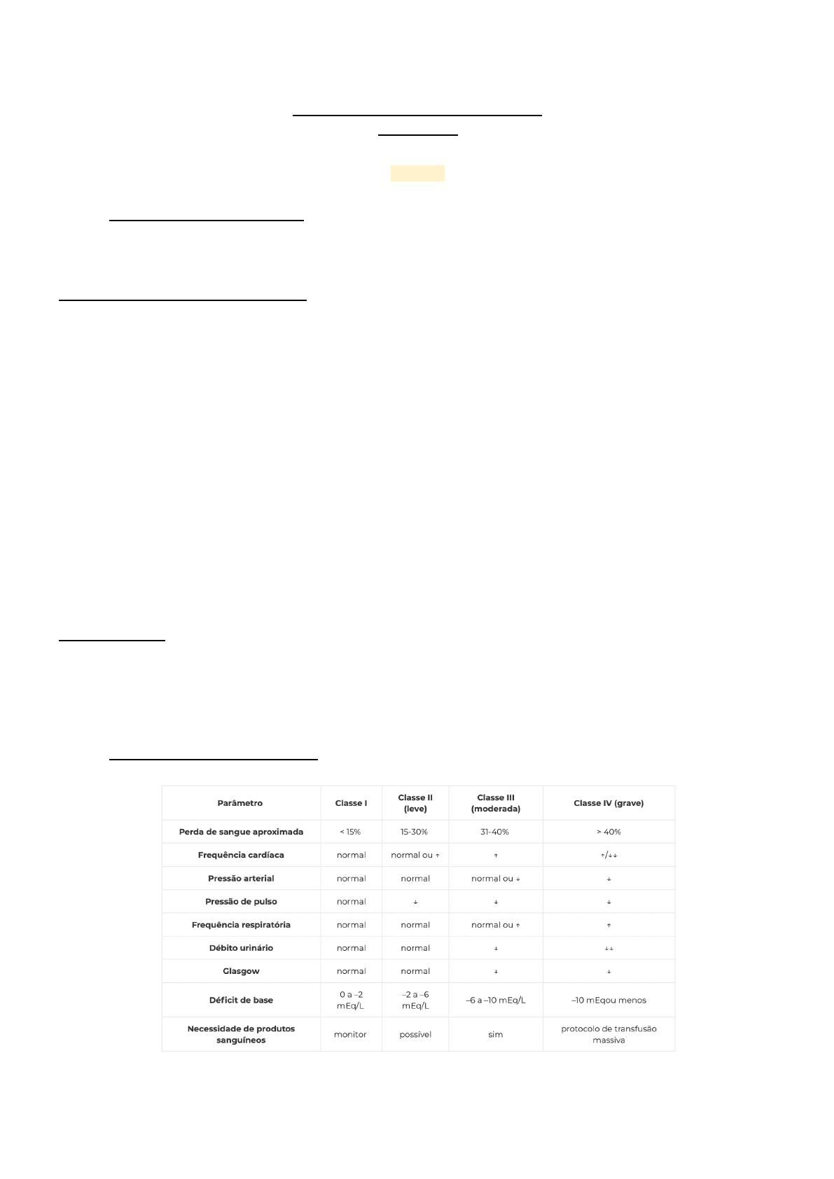 AULA 1- Manejo de pacientes críticos (18/07/2023) Grupo 1 1. Definição de paciente crítico: é aquele que apresenta instabilidade ou risco de instabilidade de sistema vital com risco de morte. Esses pacientes podem sofrer deterioração de um ou mais funções dos órgãos vitais, apresentando instabilidade cardiovascular, respiratória, neurológica, renal, metabólica ou patologias que possam levar à instabilidade desses sistemas. Fisiopatologia choque hipovolêmico: choque hipovolêmico como denota o nome, trata-se de uma perda de volemia com consequente insuficiência circulatória e alterações sistêmicas. ➔ A redução do volume intravascular gera uma diminuição do retorno venoso e consequente diminuição do volume diastólico final. Assim, a oxigenação tecidual e o aporte de nutrientes ficam comprometidos. O mecanismo compensatório inclui o aumento da frequência cardíaca, a vasoconstrição periférica e estimulação dos barorreceptores que levam ao aumento da frequência respiratória e ativam catecolaminas dando início a cascata inflamatória. ➔ No entanto, o mecanismo compensatório torna-se insuficiente, o resultado inclui hipotensão, resposta inflamatória sistêmica com mau funcionamento enzimático e morte celular. ➔ A causa mais comum de choque hipovolêmico é hemorragia, porém pode ser resultante de edema com perda volêmica para o terceiro espaço e desidratação, causa menos comum. Resumo da definição: O choque hipovolêmico é resultante da redução do volume intravascular secundário a perda de sangue ou fluidos e eletrólitos, gerando assim uma redução da pré-carga e consequentemente do débito cardíaco (DC). A resistência vascular sistêmica (RVS) aumenta numa tentativa de manter a perfusão de órgãos vitais. Sua causa mais comum é a hemorragia. Quadro clínico: o quadro clínico do paciente varia de acordo com a gravidade do choque, o choque hipovolêmico pode ser classificado em uma escala de (I- IV) preconizada pelo ATLS, a tabela a seguir demonstra a classificação do choque de acordo com o quadro clínico e a conduta necessária em cada caso. A classificação leva em consideração o volume perdido, a frequência cardíaca, a pressão sistólica e de pulso, a frequência respiratória, o débito urinário e o estado mental. 2. Graus de choque hipovolêmico OBS: Reposição volêmica se usa a regra de 3:1; 300 ml de cristaloide a cada 100ml de sangue perdido. Pressão de pulso = diferença entre pressão sistólica e diastólica. Tratamento O manejo inicial consiste no suporte básico a vida, dando-se prioridade sempre à avaliação do “ABC”: ● A (airway): assegurar via aérea, mantendo-a pérvia e protegida contra obstrução ou aspiração. ● B (breathing): manter adequada ventilação e oxigenação do paciente fornecendo oxigênio suplementar. A ventilação mecânica deve ser instituída sempre que a ventilação por acessórios não invasivos for insuficiente, e em todos os pacientes em choque grave, diminuindo seu consumo energético. ● C (circulation): deve-se dar atenção às possíveis causas do choque, visando um tratamento definitivo para o problema. ➔ Acesso venoso calibroso: o acesso ao sistema vascular deve ser obtido rapidamente, através da inserção de dois cateteres intravenosos periféricos de calibre 16 ou 18, antes de qualquer possibilidade de cateterismo venoso central. ➔ Reposição volêmica agressiva: a pré-carga deve ser aumentada visto que a hipovolemia, seja ela absoluta ou relativa, quase sempre está presente, inclusive em determinadas fases dos choques cardiogênico e distributivo. O tipo de líquido a ser infundido ainda é tema de controvérsia, e podem ser empregados tanto cristaloides (Solução Fisiológica, Ringer) quanto coloides, entretanto o custo dos cristaloides é bem menor, sendo estes os mais utilizados. O líquido deve estar aquecido para evitar hipotermia, e deve ser administrado tão rápido quanto possível. A dose da reposição volêmica inicial é habitualmente de 2 litros no adulto e de 20 mL/kg na criança, e a resposta ao volume deve ser monitorizada pela diminuição da taquicardia, melhora do débito urinário e do estado neurológico Transfusões são reservadas a pacientes com grandes perdas (>30% volemia - graus 3 e 4) . Em geral procura-se manter o hematócrito em 30% e a hemoglobina 10 g/dL. Nos graus 3 e 4 - A administração de concentrados de hemácias (CH) sem adicionar fatores de coagulação e plaquetas resulta em comprometimento da hemostasia (falta fatores de coagulação/proteínas) - A cada 1 concentrado de hemácias administra 1 de plasma e 1 de plaquetas. ➔ Agentes inotrópicos e vasoativos: devem ser administrados com cautela e somente após a ressuscitação volêmica, ou então como ponte, enquanto esta é realizada e a PA continua muito baixa. Servem como auxílio para manter a pressão de perfusão. Uma PAM-alvo (pressão arterial média) ainda não foi estabelecida, mas uma PAM de pelo menos 60-65 mmHG é um alvo razoável. Ex: São representados por agentes inotrópicos (Dobutamina, Inibidores da Fosfodiesterase), vasopressores (Dopamina, Noradrenalina) e vasodilatadores (Nitroprussiato, Nitroglicerina). Finalmente, após o manejo inicial, o paciente deve ser prontamente encaminhado a UTI, onde os esforços devem ser direcionados ao tratamento definitivo da causa base do quadro. Grupo 2 1. Defina tríade letal do trauma: É um desarranjo metabólico derivado de exaustão fisiológica devido a acidose metabólica, hipotermia e coagulopatia. Alimentado por FEEDBACK POSITIVO que leva a morte! A hipoperfusão dos tecidos → gasta ATP → forma lactato → gera uma acidose metabólica → leva a diminuição do pH → que afeta atividade do fator VII de coagulação. ● Outros fatores que pioram a acidose: uso excessivo de soro, muitas transfusões sanguíneas e redução da função miocárdica (por isso o controle de danos)