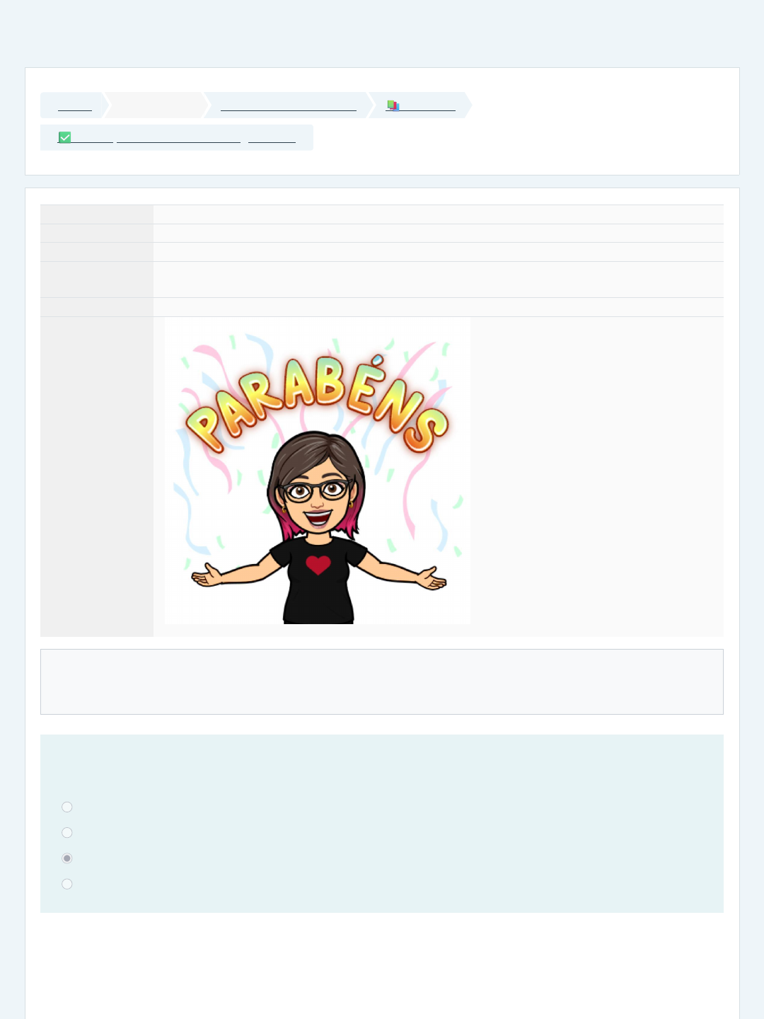 Painel Meus cursos 32010002091-T01-2025-1 Módulo 2 Avaliação do Módulo 2 - Design de IHC IInniicciiaaddoo eemm quarta, 25 jun 2025, 14:24 EEssttaaddoo Finalizada CCoonncclluuííddaa eemm quarta, 25 jun 2025, 16:22 TTeemmppoo eemmpprreeggaaddoo 1 hora 58 minutos AAvvaalliiaarr 77,,0000 de um máximo de 10,00(7700%) CCoommeennttáárriiooss Questão 11 Correto Atingiu 1,00 de 1,00 Avisar ao usuário o que está sendo processado durante uma avaliação de crédito do cadastro atende qual diretriz? a. Equilíbrio entre controle e liberdade do usuário b. Correspondência com as expectativas dos usuários c. Visibilidade e reconhecimento d. Conteúdo relevante e expressão adequada https://ava.ufms.br/my/ https://ava.ufms.br/my/ https://ava.ufms.br/my/ https://ava.ufms.br/course/view.php?id=68193 https://ava.ufms.br/course/view.php?id=68193 https://ava.ufms.br/course/view.php?id=68193 https://ava.ufms.br/course/view.php?id=68193#section-3 https://ava.ufms.br/course/view.php?id=68193#section-3 https://ava.ufms.br/course/view.php?id=68193#section-3 https://ava.ufms.br/mod/quiz/view.php?id=953894 https://ava.ufms.br/mod/quiz/view.php?id=953894 Questão 22 Incorreto Atingiu 0,00 de 1,00 Questão 33 Incorreto Atingiu 0,00 de 1,00 Questão 44 Correto Atingiu 1,00 de 1,00 Questão 55 Incorreto Atingiu 0,00 de 1,00 Durante o projeto de um sistema, o designer precisa projetar mensagens de erro que permitam ao usuário entender o que aconteceu, as consequências desse acontecimento e como revertê-las. Essa é uma recomendação da diretriz ‘Conteúdo relevante e expressão adequada’. Escolha uma opção: Verdadeiro Falso Assinale a alternativa incorreta sobre o design thinking. a. Utiliza a sensibilidade do designer b. Utiliza estratégia de negócios para converter valor para o mercado c. Utiliza tecnologia para aproveitar oportunidades de mercado d. Utiliza métodos para combinar as necessidades das pessoas e. Utiliza tecnologia viável Incluir pessoas com deficiência no projeto de design é a única forma de atender à diretriz ‘projete para acessibilidade’. Escolha uma opção: Verdadeiro Falso Ao disponibilizar no sistema um conjunto de valores defaults mais comuns para os campos de um formulário estamos atendendo à diretriz Correspondência com as expectativas dos usuários . Questão 66 Correto Atingiu 1,00 de 1,00 Questão 77 Correto Atingiu 1,00 de 1,00 Questão 88 Correto Atingiu 1,00 de 1,00 Questão 99 Correto Atingiu 1,00 de 1,00 Na etapa de Análise da situação atual é preciso analisar pessoas, artefatos e processos para encontrar as necessidades e oportunidades de melhoria. Na fase de Ideação do design thinking é necessário a colaboração de diferentes pessoas para um workshop colaborativo em busca de formas para resolver o problema do contexto. Empatia Definição Ideação Prototipação Teste O design thinking possui cinco fases. Ordene-as. Quando aproveitamos o conhecimento de mundo do usuário e a ordem existente para a realização de atividades, estamos atendendo a diretriz Correspondência com as expectativas dos usuários . Visibilidade e reconhecimento Consistência e padronização Questão 1100 Correto Atingiu 1,00 de 1,00 Na etapa de Avaliação da nova situação é preciso analisar as diferenças na situação e como os usuários foram afetados. Atividade anterior ◄ Checkout de Presença do Módulo 2 - Design de IHC Seguir para... Próxima atividade Videoaula Obrigatória - Módulo 3 - Unidade 1 - Planejamento da avaliação de IHC ► Precisa de ajuda com o AVA UFMS? https://agead.ufms.br (67) 3345-7613 suporte.agead@ufms.br https://ava.ufms.br/mod/assign/view.php?id=953892&forceview=1 https://ava.ufms.br/mod/assign/view.php?id=953892&forceview=1 https://ava.ufms.br/mod/url/view.php?id=953896&forceview=1 https://ava.ufms.br/mod/url/view.php?id=953896&forceview=1 https://agead.ufms.br/ https://agead.ufms.br/ tel:(67) 3345-7613 tel:(67) 3345-7613 mailto:suporte.agead@ufms.br mailto:suporte.agead@ufms.br https://api.whatsapp.com/send?phone=556733457613 https://api.whatsapp.com/send?phone=556733457613 https://api.whatsapp.com/send?phone=556733457613 https://api.whatsapp.com/send?phone=556733457613