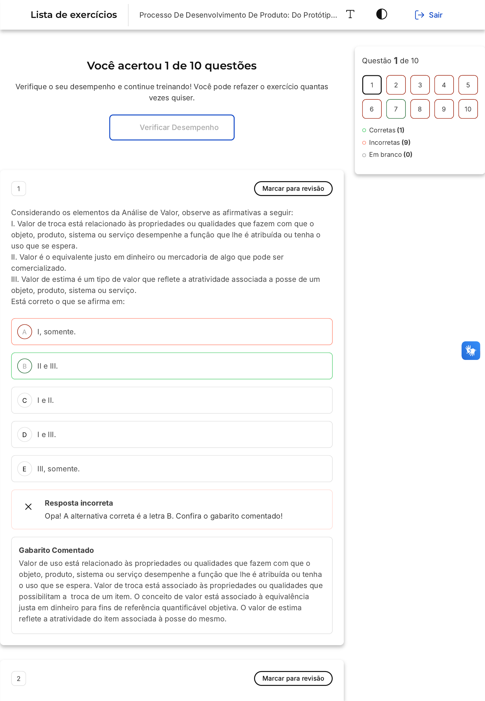 Você acertou 1 de 10 questões Verifique o seu desempenho e continue treinando! Você pode refazer o exercício quantas vezes quiser. Verificar Desempenho A B C D E 1 Marcar para revisão Considerando os elementos da Análise de Valor, observe as afirmativas a seguir: I. Valor de troca está relacionado às propriedades ou qualidades que fazem com que o objeto, produto, sistema ou serviço desempenhe a função que lhe é atribuída ou tenha o uso que se espera. II. Valor é o equivalente justo em dinheiro ou mercadoria de algo que pode ser comercializado. III. Valor de estima é um tipo de valor que reflete a atratividade associada a posse de um objeto, produto, sistema ou serviço. Está correto o que se afirma em: I, somente. II e III. I e II. I e III. III, somente. Resposta incorreta Opa! A alternativa correta é a letra B. Confira o gabarito comentado! Gabarito Comentado Valor de uso está relacionado às propriedades ou qualidades que fazem com que o objeto, produto, sistema ou serviço desempenhe a função que lhe é atribuída ou tenha o uso que se espera. Valor de troca está associado às propriedades ou qualidades que possibilitam a troca de um item. O conceito de valor está associado à equivalência justa em dinheiro para fins de referência quantificável objetiva. O valor de estima reflete a atratividade do item associada à posse do mesmo. 2 Marcar para revisão Questão 1 de 10 Corretas (1) Incorretas (9) Em branco (0) 1 2 3 4 5 6 7 8 9 10 Lista de exercícios Processo De Desenvolvimento De Produto: Do Protótip… Sair A B C D E A B Considerando a importância da consideração das dimensões da qualidade no lançamento do produto e introdução no mercado, observe as afirmativas a seguir: I. A dimensão da qualidade denominada "durabilidade" é sinônimo da dimensão "confiabilidade". II. A dimensão "conformidade" está relacionada ao atendimento à especificações. III. O setor de marketing e propaganda deve explorar ao máximo as características da qualidade que distinguem positivamente o produto particular dos produtos dos concorrentes. Está correto o que se afirma em: I, somente. II e III. I e II. I e III. II, somente. Resposta incorreta Opa! A alternativa correta é a letra B. Confira o gabarito comentado! Gabarito Comentado A dimensão da qualidade "conformidade" trata do atendimento às exigências contidas em especificações. O marketing e propaganda devem atuar no sentido de promover as qualidades contidas nos produtos, principalmente aquelas que se destacam frente aos concorrentes. Apesar de durabilidade e confiabilidade serem conceitos correlacionados, estes se distinguem no sentido que a durabilidade trata do limite máximo da vida útil do sistema, enquanto que a confiabilidade trata da propensão à falha durante todo o tempo da vida do item, ou seja, considera a eventual recuperação por meio de ações de manutenção. 3 Marcar para revisão Considerando testes e avaliações no ciclo de vida do produto, observe as afirmativas a seguir: I. Avaliações técnicas normalmente são planejadas e conduzidas de acordo com normas técnicas específicas. II. Na condução de avaliações técnicas é importantíssimo que os equipamentos de testes estejam formalmente aferidos. III. Testes e avaliações na prática são sinônimos. Está correto o que se afirma em: I, somente. II e III. C D E A B C D E I e II. I e III. II, somente. Resposta incorreta Opa! A alternativa correta é a letra C. Confira o gabarito comentado! Gabarito Comentado Testes e avaliações se distinguem conceitualmente. Testes são ensaios conduzidos sob condições preestabelecidas com o objetivo de coleta de informações que são utilizadas em avaliações, ou seja, para colaborarem em algum tipo de "juízo de valor" que pode ser útil na tomada de decisões. Normas técnicas específicas costumam padronizar procedimentos experimentais em avaliações técnicas. A necessária confiabilidade e exatidão de medições somente é possível se os equipamentos de testes estiverem aferidos de forma a garantirem rastreabilidade das grandezas ao Sistema Internacional (SI). 4 Marcar para revisão Considerando a sincronia da produção e soluções ERP, observe as afirmativas a seguir: I. O nível de detalhamento das partes de itens a serem administrados em sistemas ERP/MRP depende se os itens são fabricados internamente ou adquiridos fora. II. Os tempos de abastecimento ou lead time dependem do grau de confiança com relação à agilidade nas entregas necessárias de cada fornecedor. III. Os níveis de estoque eventualmente necessários são definidos pelos fornecedores. Está correto o que se afirma em: I, somente. II e III. I e II. I e III. II, somente. Resposta incorreta Opa! A alternativa correta é a letra C. Confira o gabarito comentado! Gabarito Comentado O detalhamento dos itens nos softwares de ERP/MRP é maior quando é necessário administrar matérias primas ou insumos de fabricação, o que não ocorre quando um item é adquirido no mercado. A definição dos tempos de abastecimento está A B C D E intimamente ligada às incertezas associadas ao fornecimento de itens contratados. Os eventuais estoques necessários são definidos pelos gestores da produção em função das incertezas associadas ao fornecimento. 5 Marcar para revisão Considerando o acompanhamento de vendas e o acompanhamento do produto, observe as afirmativas a seguir: I. O monitoramento da vida de um produto é algo que não costuma atrapalhar as operações. II. Sistemas de informações gerenciais podem ser úteis para a coleta oportuna de informações sobre vendas no mercado . III. O acompanhamento de vendas de peças de reposição associadas a determinado sistema pode ajudar no projeto e na gestão de sistemas de manutenção que apoiam o sistema desenvolvido. Está correto o que se afirma em: I, somente. II e III. I e II. I e III. II, somente. Resposta incorreta Opa! A alternativa correta é a letra