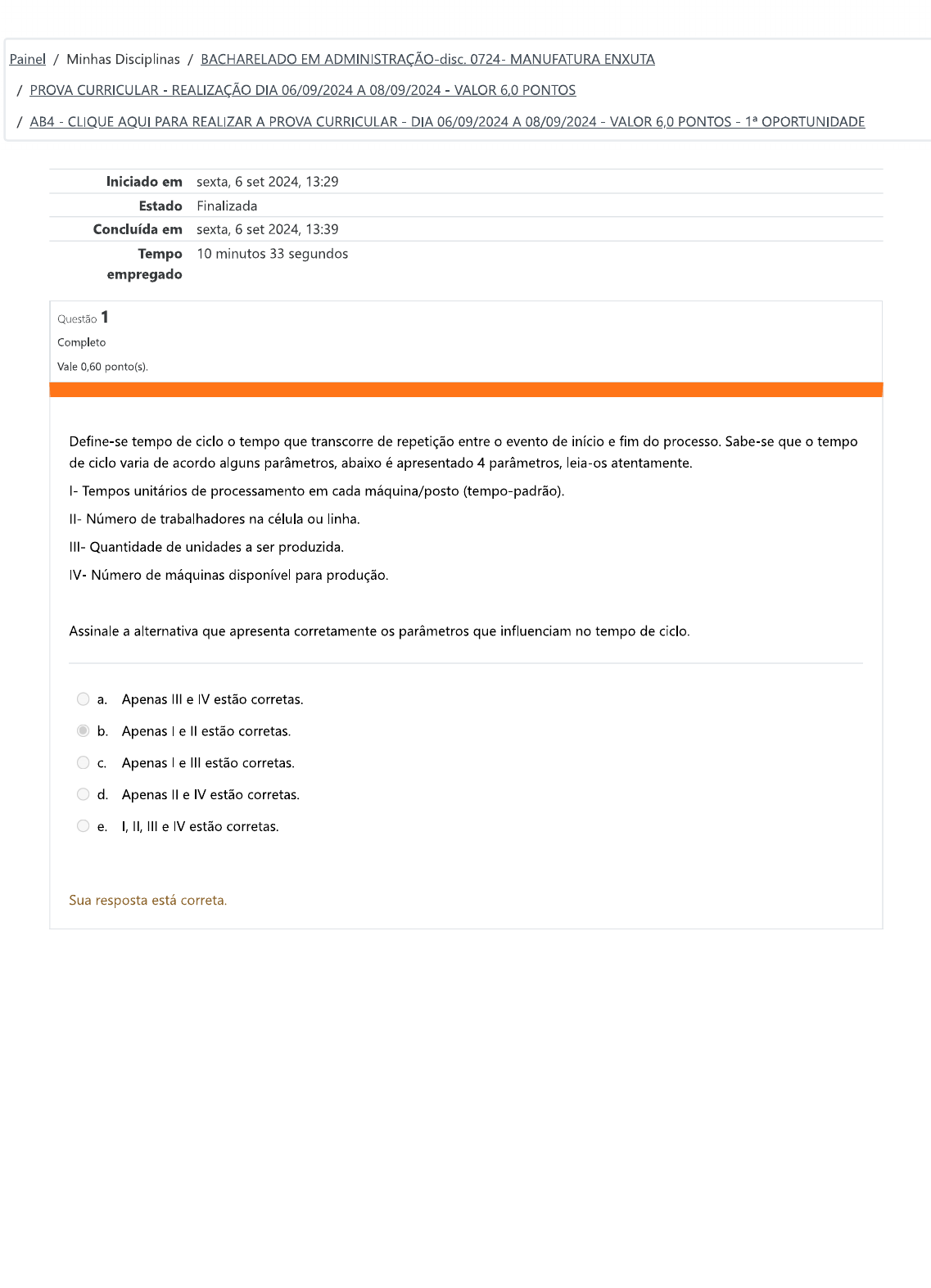 Painel / Minhas Disciplinas / BACHARELADO EM ADMINISTRAÇÃO-disc. 0724- MANUFATURA ENXUTA / PROVA CURRICULAR REALIZAÇÃO DIA 06/09/2024 A 08/09/2024 VALOR 6,0 PONTOS / AB4 CLIQUE AQUI PARA REALIZAR A PROVA CURRICULAR DIA 06/09/2024 A 08/09/2024 VALOR 6,0 PONTOS OPORTUNIDADE Iniciado em sexta, 6 set 2024, 13:29 Estado Finalizada Concluída em sexta, 6 set 2024, 13:39 Tempo 10 minutos 33 segundos empregado Questão 1 Completo Vale 0,60 ponto(s). Define-se tempo de ciclo o tempo que transcorre de repetição entre o evento de início e fim do processo. Sabe-se que o tempo de ciclo varia de acordo alguns parâmetros, abaixo é apresentado 4 parâmetros, leia-os atentamente. Tempos unitários de processamento em cada máquina/posto (tempo-padrão). II- Número de trabalhadores na célula ou linha. III- Quantidade de unidades a ser produzida. IV- Número de máquinas disponível para produção. Assinale a alternativa que apresenta corretamente os parâmetros que influenciam no tempo de ciclo. a. Apenas III e IV estão corretas. b. Apenas e estão corretas. C. Apenas le III estão corretas. d. Apenas e IV estão corretas. e. I, II, III e IV estão corretas. Sua resposta está correta.Questão 2 Completo Vale 0,60 ponto(s). O Volvismo é entendido como sendo uma expressão do modelo sueco de gestão, caracterizada pelo elevado nível de informatização e automação, com um alto grau de experimentalismo. Com base no que foi estudo a respeito do assunto marque a alternativa correta: a. operário deve se concentrar em conhecer apenas sua função, não devevendo se envolver em sindicados e de decisões que influenciam no processo de fabricação b. No volvismo, é a máquina que dita seu ritmo para o operário. C. operário tem um papel muito semelhante daquele do fordismo e do toyotismo. d. No volvismo, a produção é um processo de informação que possui capacidade de auto regulação, como consequência apresenta descentralização das decisões, maior autonomia às etapas dos processos e elevada flexibilidade. e. Volvismo se caracteriza pela baixa flexibilização funcional, de produto e de processo, pelo baixo grau de automação e informatização que implicam numa produção pouco diversificada. Sua resposta está correta.Questão 3 Completo Vale 0,60 ponto(s). É necessário realizar um estudo minucioso e detalhado a partir da observação do setup para uma determinada máquina e aproveitar ao máximo seu tempo. Existem processos de setup que podem ser realizados mesmo com a máquina em funcionamento, enquanto outros apenas com a máquina parada, para isso é necessário definir a ordem dos processos do setup e aproveitar ao máximo seu tempo de funcionando para deixar ela menor tempo possível parada. tempo de Setup envolve algumas funções, leia as funções abaixo e julgue-as corretamente se as funções descritas fazem parte do tempo de Setup. Marque V para Verdadeiro e F para Falso. Centragem e determinação das dimensões das ferramentas. Qualificação de funcionário. Fixação e remoção de matrizes e ferramentas. Preparação da matéria-prima, preparação de dispositivos de montagem, acessórios, etc. Assinale a alternativa que apresenta a sequência correta: a. V,F,V,V. b. F,V,V,F. C. d. F,F,V,V. e. V,F,F,V. Sua resposta está correta.Questão 4 Completo Vale 0,60 ponto(s). Kanban pode ser traduzido de forma literal como sendo "anotação visível" ou "sinal", no entanto, é utilizado ao redor do mundo com o significado de 'cartão' uma vez que essa é a principal característica do sistema. Com base no que foi apresentado e em seu conhecimento, leia atentamente o as afirmações abaixo e faça o que se pede: I- Empurrar a produção. II- Centralizar a produção. III- Limitar o nível máximo de estoque. IV- Usar diferentes sinalizadores para ordem de produção e autorização de transferência de material. Assinale a alternativa que apresente corretamente as características do sistema Kanban: a. Apenas e III estão corretas. b. Apenas le IV estão corretas. C. Apenas IV está correta. d. Apenas III e IV estão corretas. e. Apenas e estão corretas. Sua resposta está correta. Questão 5 Completo Vale 0,60 ponto(s). Sabe-se que o Jidoka possibilita diversas vantagens, entre elas pode-se citar: a redução de custo através da redução da força de trabalho; flexibilidade na produção para alterações na demanda; qualidade assegurada; aumento do respeito à condição humana. Com base em seu conhecimento, leia as afirmações abaixo e assinale a alternativa correta. I- A multifuncionalidade surgiu com a automatização das máquinas com um toque humana. POIS A multifuncionalidade deu liberdade ao homem de poder trabalhar de forma simultânea acompanhando mais de uma máquina ao mesmo tempo a. As afirmações e estão incorretas. b. As afirmações e estão corretas e a afirmação é uma justificativa para a afirmação I. C. A afirmação está correta e a afirmação está incorreta. d. As afirmações e estão corretas, no entanto a afirmação não é uma justificativa para a afirmação I. e. A afirmação está incorreta e a afirmação está correta. Sua resposta está correta.Questão 6 Completo Vale 0,60 ponto(s). O modelo de gestão da produção conhecido como Taylorismo-fordismo é um modelo que implica em ritmos intensos de produção, crescimento sem controle, centralização e especialização do trabalho. Tal modelo não é mais utilizado atualmente, assinale a alternativa que apresenta corretamente os motivos que levam ao abandono de sua utilização. I- Redução do poder dos sindicatos. II- Elevação do nível de instrução. III- Recusa dos operários a determinadas formas de organização do trabalho. IV- Excessiva rigidez do sistema baseado na produção maciça. a. I, II, III e IV estão corretas. b. Apenas II, III e IV estão corretas. C. Apenas I, e IV estão corretas. d. Apenas e III estão corretas. e. Apenas e III estão corretas. Sua
