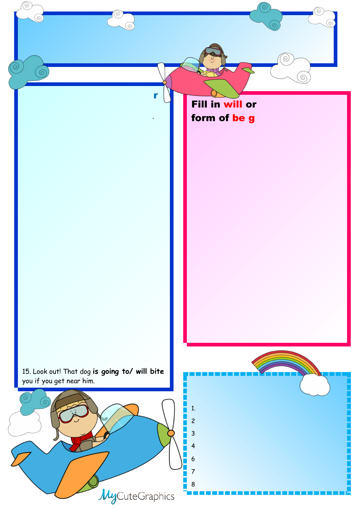 ( will or going to ) ( Circle the correct answer 1 . Oh look! It is going to / will snow soon. 2. Next summer I am going to / will backpack around Europe. 3. Ring! Ring! I am going to / I’ll answer it. 4. I think our team is going to / will win the match. 5. In 2055 robots are going to / will be our teachers. 6. Tonight we are going to have / will have a birthday party for my brother. 7. Sponge Bob is going to / will work at the Crabby Patty tonight. 8. My friends are going to / will go to the movies tonight. 9. I doubt that he is going to / will pass the English test. 10. H e is going to / will study for the test tomorrow . 11. Be careful! You are going to / will drop the dishes. 12. During summer vacation we are going to / will go swimming every day. 13. I’m sure that you are going to/ will find your lost ring. 14. I am going to / will help you carry your books. 15. Look out! That dog is going to / will bite you if you get near him. ) ( Fill in will or the correct form of be going to 1 . Next Saturday we __________ __ _____ (attend) an NBA game. 2. I think the game ____________ (be) at the Olympic arena. 3. My father __________________(buy) tickets tonight. 4. _________ the Miami Heat _________ (win) the championship? 5. The weather ___________(be) dreadful tomorrow. But I doubt that it _____________(snow) in June. 6. We use the word (s) ________________ when we want to talk about predictions. 7. In 300 years people __________________ (travel) with flying cars instead of airplanes. 8. We use the word(s) _______________ when we offer to help someone. 9. I ______________(lift) that heavy box for you. 10. I think that schools __________ ( not/ use) ______________ books- they _______ (give) every child a tablet computer. 11. When we speak about plans we use _______________________. 12. Later I ________________(read) a science fiction book on my e-reader. ) ( Yes or no 1. will is used for plans _______________ 2. will is used for predictions ______________ 3. am going to is used for plans ____________ 4. will is used for offers of help ____________ 6. will is used for something likely to happen ______ 7. am going to is used after I think ____________ 8. will is used for decisions I make now __________ ) ( will or going to ) ( Circle the correct answer 1. Oh look! It is going to / will snow soon. 2. Next summer I am going to / will backpack around Europe. 3. Ring! Ring! I am going to / I’ll answer it. 4. I think our team is going to / will win the match. 5. In 2055 robots are going to / will be the teachers. 6. Tonight we are going to have/ will have a birthday party for my brother. 7. Sponge Bob is going to / will work at the Crabby Patty tonight. 8. My friends are going to / will go to the movies tonight. 9. I doubt that he is going to / will pass the English test. 10. He is going to / will study for the test last night. 11. Be careful! You are going to / will drop the dishes. 12. During summer vacation we are going to / will go swimming every day. 13. I’m sure that you are going to / will find your lost ring. 14. I am going to / will help you carry your books. 15. Look out! That dog is going to / will bite you if you get near him. ) ( Fill in will or the correct form of be going to 1. Next Saturday we _______________ (attend) an NBA game. 2. I think the game ____________ (be) at the Olympic arena. 3. My father __________________(buy) tickets tonight. 4. _________ the Miami Heat _________ (win) the championship? 5. The weather ___________(be) dreadful tomorrow. But I doubt that it _____________(snow) in June. 6. We use the word ________________ when we want to talk about predictions. 7. In 300 years people __________________ (travel) with flying cars instead of airplanes. 8. We use the word(s) _______________ when we offer to help someone. 9. ______________(lift) that heavy box for you. 10. I think that schools __________ ( not/ use) ______________ books- they _______ (give) every child a tablet computer. 11. When we speak about plans we use _______________________. 12. Later I ________________(read) a science fiction book on my e-reader. ) ( Yes or no 1. will is used for plans _______________ 2. will is used for predictions ______________ 3. am going to is used for plans ____________ 4. will is used for offers of help ____________ 6. will is used for something likely to happen ______ 7. am going to is used after I think ____________ 8. will is used for decisions I make now __________ ) ( will or going to ) ( Circle the correct answer 1. Oh look! It is going to will snow soon. 2. Next summer I am going to will backpack around Europe. 3. Ring! Ring! I am going to I’ll answer it. 4. I think our team is going to will win the match. 5. In 2055 robots are going to will be the teachers. 6. Tonight we are going to / will have a birthday party for my brother. 7. Sponge Bob is going to will work at the Crabby Patty tonight. 8. My friends are going to will go to the movies tonight. 9. I doubt that he is going to / will pass the English test. 10. He is going to stud y/ will study for the test tonight . 11. Be careful! You are going to will drop the dishes. 12. During summer vacation we are going to / will go swimming every day. 13. I’m sure that you are going to will find your lost ring. 14. I am going to will help you carry your books. 15. Look out! That dog is going to will bite you if you get near him. ) ( Fill in will or the correct form of be going to 1. Next Saturday we are going to attend (attend) an NBA game. 2. I think the game will be (be) at the Olympic arena. 3. My father is going to buy (buy) tickets tonight. 4. Will the Miami Heat win (win) the championship? 5. The weather will be (be) dreadful tomorrow. But I doubt that it will snow (snow) in June. 6. We use the word (s) will when we want to talk about predictions. 7. In 300 years people will travel (travel) with flying cars instead of airplanes. 8. We use the word(s) will when we offer to help someone. 9. I will lift ( lif