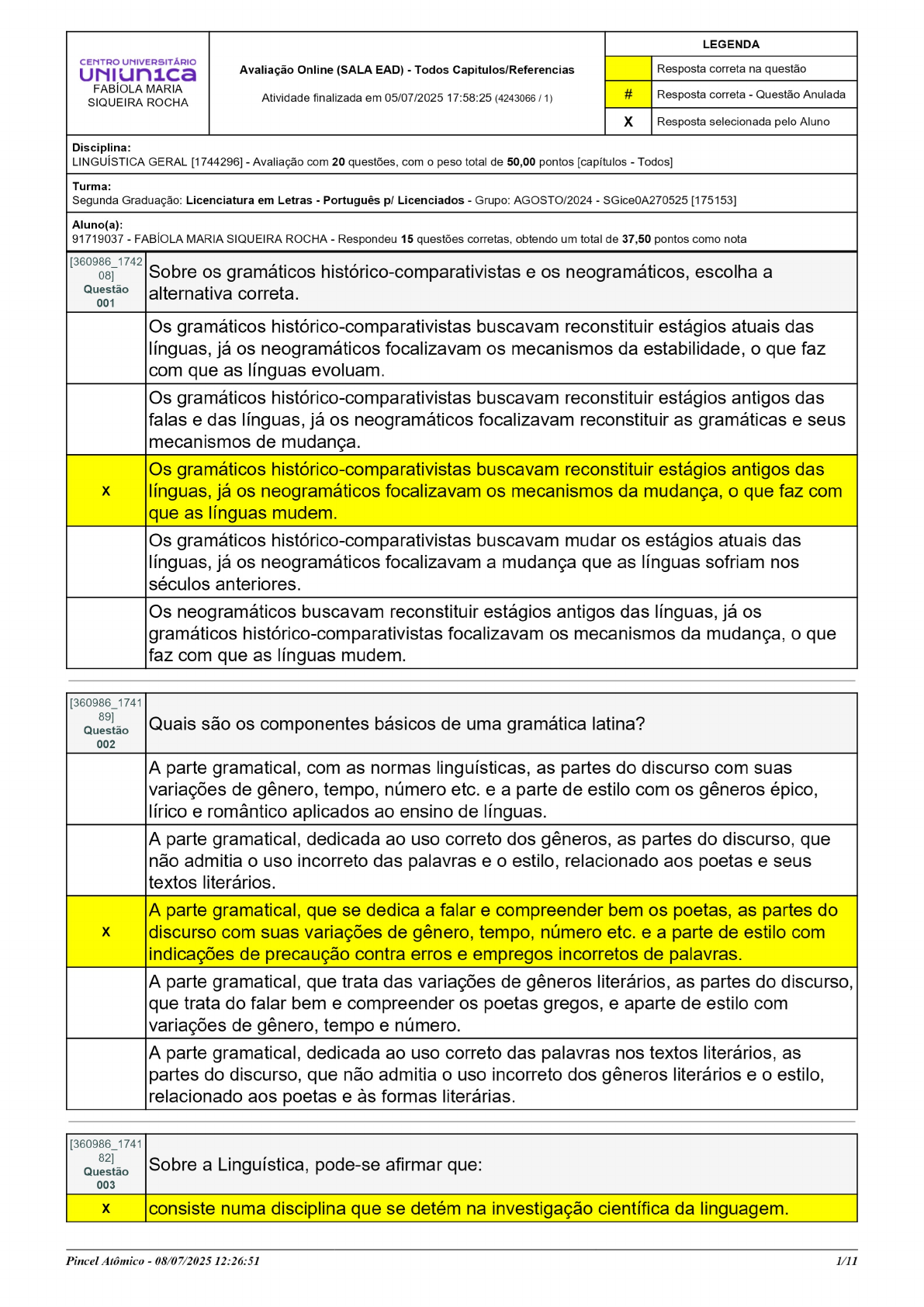 Pincel Atômico - 08/07/2025 12:26:51 2/11 corresponde aos estudos gramaticais, filológicos ou etimológicos realizados desde a Grécia Antiga e estendendo-se até os dias atuais, com ênfase na investigação empírica da linguagem. consiste numa abordagem científica de todos os tipos de linguagem utilizadas pelos seres humanos, desde as primeiras gramáticas até os autores modernos do Império Romano que influenciam diversos idiomas por conta do latim. corresponde aos estudos sobre a linguagem a partir de Ferdinand Saussure, em que os estudos gramaticais e etimológicos são o cerne da investigação científica. consiste numa disciplina que trata da linguagem de uma forma normativa, procurando estabelecer as regras e normas do uso padrão da língua. [360986_1742 00] Questão 004 Observe atentamente as sentenças a seguir: I. O período conhecido como Linguística apresenta uma preocupação investigativa em relação ao estudo da linguagem. II. O estudo histórico-comparativo das línguas analisa as línguas, buscando as semelhanças e diferenças entre as palavras de cada uma de modo a reconstruir o idioma primitivo do qual teriam se originado. III. O estudo lógico da linguagem mesclou filosofia e linguística e buscou descobrir a relação entre pensamento e linguagem. A partir da sua leitura: I e III estão corretas. Somente II está correta. Somente I está correta. X Todas as alternativas estão corretas. I e II estão corretas. [360986_1728 51] Questão 005 Analise as afirmações a seguir: I. Dentre as concepções defendidas pelos estruturalistas, estão as práticas analíticas das línguas, a partir das descrições de seu sistema e funcionamento. II. O estruturalismo não rompeu com os estudos anteriores sobre a língua, como a gramática tradicional, histórico-comparativa e a neogramática. III. O estruturalismo americano priorizou estudos sobre a descrição das línguas históricas. É correto o que se afirma em: I e III. III. I e II. X I. II. Pincel Atômico - 08/07/2025 12:26:51 3/11 [360986_1728 26] Questão 006 A importância da linguagem Na abertura da sua obra Política, Aristóteles afirma que somente o homem é um “animal político”, isto é, social e cívico, porque somente ele é dotado de linguagem. Os outros animais, escreve Aristóteles, possuem voz (phone) e com ela exprimem dor e prazer, mas o homem possui a palavra (logos) e, com ela, exprime o bom e o mau, o justo e o injusto. Exprimir e possuir em comum esses valores é o que torna possível a vida social e política e, dela, somente os homens são capazes. Segue a mesma linha o raciocínio de Rousseau no primeiro capítulo do Ensaio sobre a origem das línguas: A palavra distingue os homens dos animais; a linguagem distingue as nações entre si. Não se sabe de onde é um homem antes que ele tenha falado. Escrevendo sobre a teoria da linguagem, o linguista Hjelmslev afirma que “a linguagem é inseparável do homem, segue-o em todos os seus atos”, sendo “o instrumento graças ao qual o homem modela seu pensamento, seus sentimentos, suas emoções, seus esforços, sua vontade e seus atos, o instrumento graças ao qual ele influencia e é influenciado, a base mais profunda da sociedade humana.” Prosseguindo em sua apreciação sobre a importância da linguagem, Rousseau considera que a linguagem nasce de uma profunda necessidade de comunicação: Desde que um homem foi reconhecido por outro como um ser sensível, pensante e semelhante a si próprio, o desejo e a necessidade de comunicar-lhe seus sentimentos e pensamentos fizeram-no buscar meios para isso. Gestos e vozes, na busca da expressão e da comunicação, fizeram surgir a linguagem. Por seu turno, Hjelmslev afirma que a linguagem é “o recurso último e indispensável do homem, seu refúgio nas horas solitárias em que o espírito luta contra a existência, e quando o conflito se resolve no monólogo do poeta e na meditação do pensador.” A linguagem, diz ele, está sempre à nossa volta, sempre pronta a envolver nossos pensamentos e sentimentos, acompanhando-nos em toda a nossa vida. Ela não é um simples acompanhamento do pensamento, “mas sim um fio profundamente tecido na trama do pensamento”, é “o tesouro da memória e a consciência vigilante transmitida de geração a geração”. A linguagem é, assim, a forma propriamente humana da comunicação, da relação com o mundo e com os outros, da vida social e política, do pensamento e das artes. No entanto, no diálogo Fedro, Platão dizia que a linguagem é um pharmakon. Esta palavra grega, que em português se traduz por poção, possui três sentidos principais: remédio, veneno e cosmético. Ou seja, Platão considerava que a linguagem pode ser um medicamento ou um remédio para o conhecimento, pois, pelo diálogo e pela comunicação, conseguimos descobrir nossa ignorância e aprender com os outros. Pode, porém, ser um veneno quando, pela sedução das palavras, nos faz aceitar, fascinados, o que vimos ou lemos, sem que indaguemos se tais palavras são verdadeiras ou falsas. Enfim, a linguagem pode ser cosmético, maquiagem ou máscara para dissimular ou ocultar a verdade sob as palavras. A linguagem pode ser conhecimento-comunicação, mas também pode ser encantamento-sedução. O fragmento acima foi extraído do livro Convite à Filosofia de Marilena Chauí. CHAUÍ, Marilena. Convite à Filosofia. São Paulo: Ática, 2000. De acordo com o texto, X a linguagem, para Aristóteles, é a palavra (logos), ela exprime valores e é isso que torna o homem capaz de vida social e política. a linguagem é um pharmakon para Platão. Essa palavra grega se traduz por poção e possui dois sentidos: remédio e medicamento. a concepção de linguagem enquanto comunicação que diferencia os homens dos animais, em Rousseau, vai de encontro à concepção de linguagem do grego Aristóteles. Pincel Atômico - 08/07/2025 12:26:51 4/11 a linguagem, segundo o linguista Hje