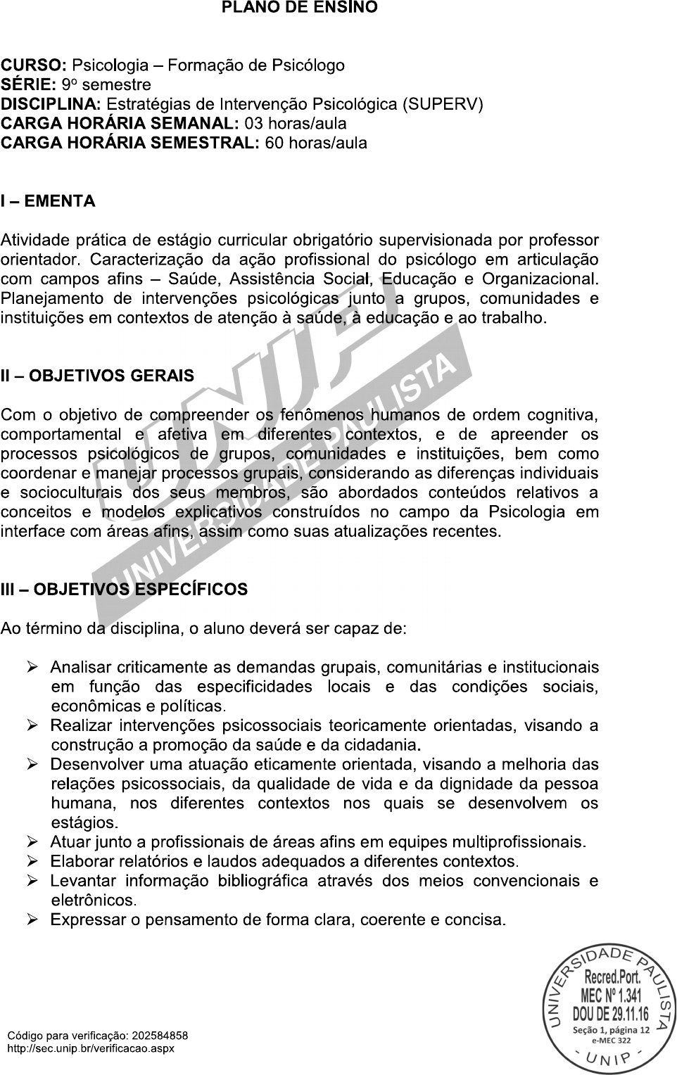 PLANO DE ENSINO CURSO: Psicologia Formação de Psicólogo SÉRIE: 9° semestre DISCIPLINA: Estratégias de Intervenção Psicológica (SUPERV) CARGA HORÁRIA SEMANAL: 03 horas/aula CARGA HORÁRIA SEMESTRAL: 60 horas/aula I - EMENTA Atividade prática de estágio curricular obrigatório supervisionada por professor orientador. Caracterização da ação profissional do psicólogo em articulação com campos afins Saúde, Assistência Social, Educação e Organizacional. Planejamento de intervenções psicológicas junto a grupos, comunidades e instituições em contextos de atenção à saúde, à educação e ao trabalho. II OBJETIVOS GERAIS Com objetivo de compreender os fenômenos humanos de ordem cognitiva, comportamental e afetiva em diferentes contextos, e de apreender os processos psicológicos de grupos, comunidades e instituições, bem como coordenar e manejar processos grupais, considerando as diferenças individuais e socioculturais dos seus membros, são abordados conteúdos relativos a conceitos e modelos explicativos construídos no campo da Psicologia em interface com áreas afins, assim como suas atualizações recentes. III OBJETIVOS ESPECÍFICOS Ao término da disciplina, aluno deverá ser capaz de: Analisar criticamente as demandas grupais, comunitárias e institucionais em função das especificidades locais e das condições sociais, econômicas e políticas. Realizar intervenções psicossociais teoricamente orientadas, visando a construção a promoção da saúde e da cidadania. Desenvolver uma atuação eticamente orientada, visando a melhoria das relações psicossociais, da qualidade de vida e da dignidade da pessoa humana, nos diferentes contextos nos quais se desenvolvem os estágios. Atuar junto a profissionais de áreas afins em equipes multiprofissionais. Elaborar relatórios e laudos adequados a diferentes contextos. Levantar informação bibliográfica através dos meios convencionais e eletrônicos. Expressar pensamento de forma clara, coerente e concisa. DOU DE 29.11.16 PAULISTA Port. N° 1.341 Seção 1, página 12 Código para verificação: 202584858 e-MEC 322 UNIPIV COMPETÊNCIAS Implementação de estratégias de intervenção psicológica com indivíduos, grupos e comunidades, teórica e tecnicamente articuladas. Análise e avaliação crítica de intervenções psicológicas para a promoção da saúde e da cidadania em diferentes contextos. V CONTEÚDO PROGRAMÁTICO 1. processo perspectivas individualizantes, perspectivas sociais e institucionais. 2. Processos de exclusão social. 3. Vetores institucionais: políticas de saúde, relação saber-poder, trabalho em equipe multiprofissional. 4. Atribuições e práticas do psicólogo nos contextos da saúde, comunidades, educação e organizações. 5. Psicologia, ética e compromisso social. As disciplinas são ministradas preferencialmente AULISTA por aulas expositivas, VI ESTRATÉGIA DE TRABALHO metodologias ativas e diversificadas apoiadas nos planos de ensino. O desenvolvimento dos conceitos e conteúdos ocorre com apoio de propostas de leituras de livros e artigos científicos básicos e complementares, exercícios, discussões em fórum/chats ou presenciais quando for caso, sugestões de filmes, vídeos e demais recursos audiovisuais. Com objetivo de aprofundar e enriquecer domínio dos conhecimentos e incentivar a pesquisa, o docente pode propor trabalhos individuais ou em grupo, palestras, atividades complementares e práticas em diferentes cenários, que permitam aos alunos assimilarem os conhecimentos essenciais para sua formação. Apresentação da Disciplina: É imprescindível que na primeira semana de aula professor orientador de estágio, apresente Plano de Ensino da disciplina, enfatizando os objetivos gerais (competências), os objetivos específicos (habilidades), critérios de avaliação, estratégias de trabalho e bibliografia. Organização das Atividades de Supervisão: Cada professor orientador deve elaborar um cronograma de leituras com base na bibliografia básica para sustentar plano de intervenções, nas três primeiras semanas. Na quarta semana, professor distribui os clientes para todos os estagiários. planejamento das atividades de supervisão deve incluir as datas para a realização dos exercícios teórico-práticos, conforme explicitado no item VI Avaliação. Leitura e discussão de textos: professor orientador de estágio deve escolher quais os textos da Bibliografia Básica e/ou Complementar ele solicitará uma produção escrita compreensiva correspondente, a ser-lhe entregue por cada um dos alunos, o que garantirá ao orientador a leitura atenta e dirigida do material (Verificação de DOU DE 29.11.16 PAULISTA Recred. Port. N° 1.341 Seção 1, página 12 Código para verificação: 202584858 e-MEC 322 UNIPEsta produção deve ser corrigida pelo professor orientador e registrada como hora de Atividade Prática de estágio, em documento específico e comprobatório do Centro de Psicologia Aplicada da UNIP. Discussão e supervisão de atendimentos realizados pelos estagiários: Cada aluno deverá trazer semanalmente as respectivas anotações referentes ao caso atendido no Centro de Psicologia Aplicada e/ou a situação vivenciada em outro campo de estágio para discussão durante a supervisão com professor orientador. Este fará suas considerações e abrirá a discussão aos demais alunos do grupo de supervisão. Após as discussões, o professor orientador deverá fazer suas observações, embasando-as teoricamente e finalizará a discussão com suas considerações finais. Relatórios semanais das intervenções psicológicas realizadas: Toda e qualquer atividade prática de estágio deve ser registrada semanalmente em um relatório descritivo. Este relatório deve ser minuciosamente descritivo (descrição das atividades realizadas em campo de estágio) e compreensivo (apresentar fundamentação teórico- explicativa que justifique as intervenções
