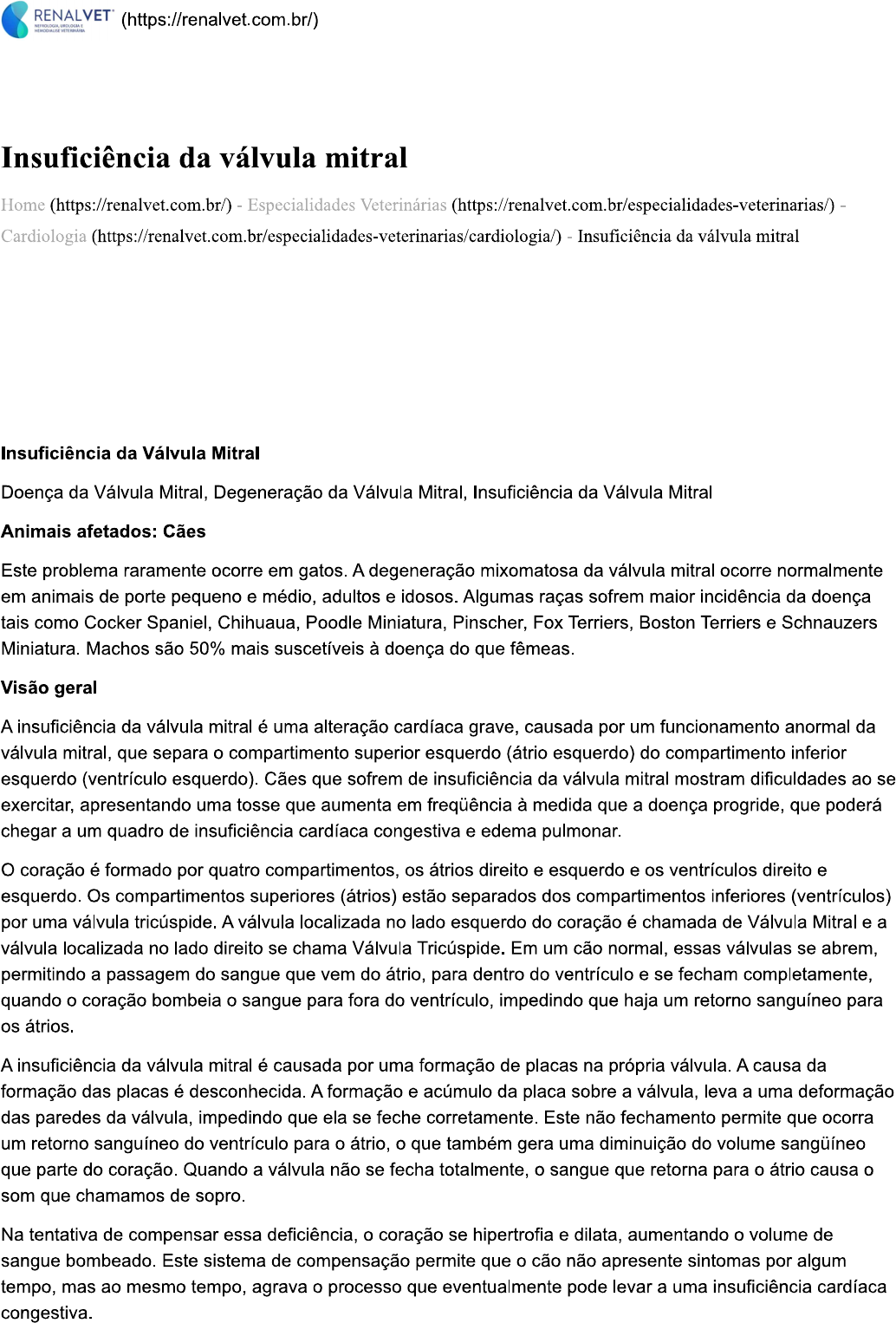 RENALVET (https://renalvet.com.br/) Insuficiência da válvula mitral Home Especialidades Veterinárias (https://renalvet.com.br/especialidades-veterinarias/) Cardiologia Insuficiência da válvula mitral Insuficiência da Válvula Mitral Doença da Válvula Mitral, Degeneração da Válvula Mitral, Insuficiência da Válvula Mitral Animais afetados: Cães Este problema raramente ocorre em gatos. A degeneração mixomatosa da válvula mitral ocorre normalmente em animais de porte pequeno e médio, adultos e idosos. Algumas raças sofrem maior incidência da doença tais como Cocker Spaniel, Chihuaua, Poodle Miniatura, Pinscher, Fox Terriers, Boston Terriers e Schnauzers Miniatura. Machos são 50% mais suscetíveis à doença do que fêmeas. Visão geral A insuficiência da válvula mitral é uma alteração cardíaca grave, causada por um funcionamento anormal da válvula mitral, que separa o compartimento superior esquerdo (átrio esquerdo) do compartimento inferior esquerdo (ventrículo esquerdo). Cães que sofrem de insuficiência da válvula mitral mostram dificuldades ao se exercitar, apresentando uma tosse que aumenta em freqüência à medida que a doença progride, que poderá chegar a um quadro de insuficiência cardíaca congestiva e edema pulmonar. coração é formado por quatro compartimentos, os átrios direito e esquerdo e os ventrículos direito e esquerdo. Os compartimentos superiores (átrios) estão separados dos compartimentos inferiores (ventrículos) por uma válvula tricúspide. A válvula localizada no lado esquerdo do coração é chamada de Válvula Mitral e a válvula localizada no lado direito se chama Válvula Tricúspide. Em um cão normal, essas válvulas se abrem, permitindo a passagem do sangue que vem do átrio, para dentro do ventrículo e se fecham completamente, quando o coração bombeia o sangue para fora do ventrículo, impedindo que haja um retorno sanguíneo para os átrios. A insuficiência da válvula mitral é causada por uma formação de placas na própria válvula. A causa da formação das placas é desconhecida. A formação e acúmulo da placa sobre a válvula, leva a uma deformação das paredes da válvula, impedindo que ela se feche corretamente. Este não fechamento permite que ocorra um retorno sanguíneo do ventrículo para átrio, o que também gera uma diminuição do volume sangüíneo que parte do coração. Quando a válvula não se fecha totalmente, o sangue que retorna para o átrio causa o som que chamamos de sopro. Na tentativa de compensar essa deficiência, coração se hipertrofia e dilata, aumentando volume de sangue bombeado. Este sistema de compensação permite que o cão não apresente sintomas por algum tempo, mas ao mesmo tempo, agrava processo que eventualmente pode levar a uma insuficiência cardíaca congestiva.A insuficiências da válvula mitral ocorre com maior freqüência em animais de meia-idade e idosos e também mostra maior prevalência em raças de pequeno e médio porte. Alguns cães podem ser controlados com medicamentos por um período de tempo que varia de acordo com a gravidade do caso. Alguns cães chegam a viver alguns anos após a manifestação de sintomas de insuficiência da válvula mitral. Sinais Clínicos Cães com insuficiência da válvula mitral tem diminuída a sua resistência a esforços e mostram uma tendência a tosse durante exercícios. A medida que esse problema cardíaco evolui para uma congestão pulmonar e edema, ritmo respiratório e a aumentam de freqüência. A tosse geralmente que ora à noite, pela manhã e durante os exercícios. No exame físico podemos encontrar o pulso e o ritmo cardíaco alterados, dependendo do estágio da patologia, assim como a presença de sopro, que é o refluxo de sangue para o átrio. Sintomas Ver sinais clínicos Descrição coração é formado por quatro compartimentos, os átrios direito e esquerdo e os ventrículos direito e esquerdo. Os compartimentos superiores (átrios) estão separados dos compartimentos inferiores (ventrículos) por uma válvula tricúspide. A válvula localizada no lado esquerdo do coração é chamada de Válvula Mitral e a válvula localizada no lado direito se chama Válvula Tricúspide. Em um cão normal, essas válvulas se abrem, permitindo a passagem do sangue que vem do átrio, para dentro do ventrículo e se fecham completamente, quando o coração bombeia o sangue para fora do ventrículo, impedindo que haja um retorno sanguíneo para os átrios. A insuficiência da válvula mitral é causada por um acúmulo de placas sobre a válvula. Essas placas fazem com que as paredes da válvula fiquem espessadas, encolhidas, distorcidas e incapazes de funcionar corretamente. Os músculos que controlam a válvula ou as cordoáreas tendíneas, também poderão ficar espessados e enfraquecidos. refluxo constante do sangue através das válvulas danificadas, leva a uma dilatação secundária no átrio e ventrículo esquerdos, que piora quadro de mal-fechamento da válvula mitral piorando quadro clínico. sangue que retorna ao átrio, geralmente se move em uma velocidade mais alta do que sangue que está indo. Isso pode levar à formação de um tecido cicatricial ou fibrosamento no local onde ele colide com a parede do músculo. Uma falha valvular, permite com que o sangue retorne ao átrio, gerando os sons que chamamos de sopro cardíacos. A dilatação do lado esquerdo do coração, faz com que o músculo cardíaco fique sobrecarregado, devido aumento de volume sanguíneo bombeado. Este excesso de trabalho faz com que o coração passe a bombear sangue para o resto do corpo com menos eficiência corpo procura uma compensação, fazendo com que o coração bombeie um volume sanguíneo ainda maior, o que causará conseqüentemente, uma maior dilatação cardíaca. Na maioria dos cães, esses mecanismos compensatórios retardam o aparecimento de sintomas na fase inicial da doença. Porém, a dilatação compensatóri