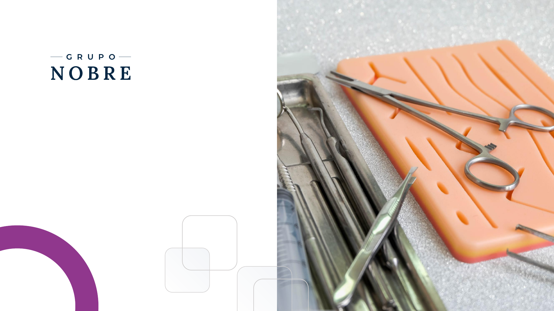 Habilitação em Sutura para Enfermeiros Art. 1º – Autorizar ao Enfermeiro a realização de sutura simples, em pequenas lesões em ferimentos superficiais de pele, anexos e mucosas e a aplicação de anestésico local injetável, recomendando que seja estabelecido rotina ou protocolo aprovado na instituição de saúde. §1º Entende-se por sutura simples aquelas realizadas para a união da pele em feridas corto contusas acidentais e superficiais de pele e/ou estabilização externa de dispositivos sob a pele com utilização de fio e agulha. Os ferimentos superficiais são considerados aqueles ferimentos corto contusos abertos e limpos que atingem camadas da pele até a hipoderme. RESOLUÇÃO COFEN 731/2023 Este curso é uma criação exclusiva do Grupo Nobre e está protegido por direitos autorais. Conceitos Históricos das Suturas • Há 2,5 milhões de anos os nossos ancestrais descobriram as lascas. • Australopitecos fizeram ferramentas de pedra. • Homo sapiens tinham utensílios de pedra e ossos: as agulhas de fita. • Primeiros relatos de fechamento de feridas: Egito há 4000 anos. • Na Índia há relatos do uso dos ferrões de formigas negras. • Na Grécia, Celsus defendia a necessidade de limpar as feridas antes de suturar. • Na idade média, Albucasis (930-1013), foi o primeiro a utilizar fios nas suturas de intestino de vaca e cordeiro. • Ambroise Paré (1510-1590) substituiu a cauterização pela sutura com fios (não estéril). • Joseph Lister (1827-1912) usou o ácido carbólico para desinfecção de fios. • Teoria de Lister sobre antissepsia: fervura e do uso da autoclave. • Esterilização levou ao desenvolvimento de aventais, lençois, instrumentos e suturas estéreis. • 1940 os serviços de saúde usavam a esterilização e materiais estéreis. Anatomia e Fisiologia da Pele A pele é o maior órgão do corpo humano. Ela é formada por um epitélio estratificado de origem ectodérmica em contato com uma derme de tecido conjuntivo de origem mesenquimal. As suas principais funções são: • Proteção: rigidez (espessura) e melanina (UV); • Termorregulação: eliminação do suor e refrigeração; • Resposta imune: primeira linha de defesa; • Impermeabilidade: barreira à perda de água e substâncias; • Sensação: tato; • Excreção: glândulas écrinas (suor) excretam H2O, eletrólitos, HCO3, ureia, entre outros; • Endocrinometabólica: produção de vitamina D, testosterona, estronas, diidrotestosterona. A pele possui três camadas que são: epiderme, derme e hipoderme. Epiderme Epiderme: é a camada mais superficial da pele, constituída de epitélio pavimentoso estratificado queratinizado (queratinócitos). e a suas principais funções são proteção mecânica e contra irradiação ultravioleta e renovação da pele. A epiderme possui 5 camadas: • Camada basal • Camada espinhosa • Camada granulosa • Camada lúcida • Camada córnea As 5 Camadas da Epiderme CAMADA BASAL - mais interna próxima ao tecido conjuntivo da derme. Possui uma alta atividade mitótica que garante a renovação celular da pele. Além disso, a quantidade de queratina aumenta à medida em que os queranócitos migram para a superfície celular. CAMADA ESPINHOSA: possui algumas camadas de células bem coesas, unidas através dos desmossomos, que a conferem uma aparência de espinhos. A constituição desta camada permite que a epiderme seja resistente a atritos. CAMADA GRANULOSA: possui cerca de 5 fileiras de células achatadas que auxiliam na impermeabilização da epiderme através da formação de uma barreira. As 5 Camadas da Epiderme CAMADA LÚCIDA: última camada constituída de queratinócitos pavimentosos com núcleo citoqueratinizado e está presente nas regiões em que a pele é mais espessa (plantas e palmas) e nos lábios. CAMADA CÓRNEA: camada de células achatadas anucleadas, rica em queratina citoplasmática. Ela se descama continuamente, e os queratinócitos, ao chegarem nesta camada, se especializam (perdem núcleos e se achatam, uma barreira impermeável. Células da Epiderme Além dos queratinócitos, a epiderme apresenta outros três tipos de células: MELANÓCITOS: responsáveis pela síntese de grânulos (melanossomas) ricos em melanina. CÉLULAS DE LANGERHANS: originárias da medula óssea, possuem citoplasma claro, contendo os grânulos de Birbeck. São células dendríticas responsáveis pelo reconhecimento e apresentação de antígenos para linfócitos T. CÉLULAS DE MERKEL: encontram-se grânulos osmiófilos, contendo neurotransmissores liberados mediante pressão sobre a pele, atribuindo a esta célula a característica de receptor mecânico. Derme É a camada de tecido conjuntivo, abaixo da epiderme, no qual estão imersos os anexos cutâneos, vasos sanguíneos, linfáticos e nervos. A derme possui as chamadas papilas dérmicas, que são projeções da derme para a epiderme. É constituída de duas camadas: papilar e reticular. JUNÇÃO DERMOEPIDÉRMICA: É a zona de transição dermoepidérmica, produzida pelos queratinócitos basais e fibroblastos dérmicos. Essa região possui aspecto linear e eosinofílico e é composta por glicoproteínas, colágeno e fibras elásticas. CAMADA PAPILAR: Constituída de tecido conjuntivo frouxo, é a camada dérmica mais superficial, em contato com a membrana basal, formada por fibras colágenas mais finas e dispostas verticalmente. CAMADA RETICULAR: É a camada mais profunda, constituída por tecido conjuntivo denso, com feixes mais grossos de colágeno, ondulados e dispostos horizontalmente. Hipoderme É a camada mais profunda da pele, formada por lóbulos de adipócitos, o que a faz ser conhecida como panículo adiposo. A hipoderme confere à pele: • proteção mecânica (amortecedor de traumas) • termogênese (isolante térmico) • armazenamento de energia (depósito de calorias) • função endócrina (conversão periférica de hormônios sexuais). Estão presentes nesta