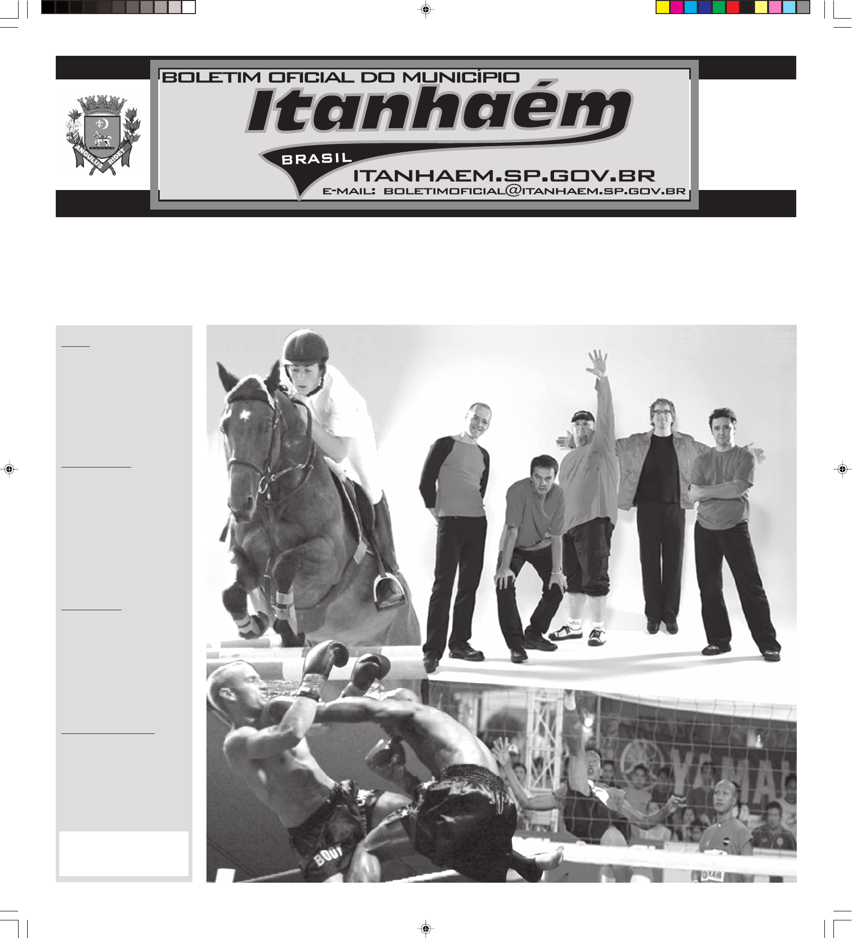 ANO 3 • Nº 32DISTRIBUIÇÃO GRATUITA ITANHAÉM, 1 A 20 DE JANEIRO DE 2006 IPTU COBRANÇAS EM ATRASO INICIAM NESTE MÊS MELHORIAS ESTADO LIBERA R$ 3 MILHÕES PARA ITANHAÉM DIVERSÃO ABERTAS INSCRIÇÕES PARA 6 KM FOLIA TRI FM Acompanhe ainda o Festival de Verão Cultura Ativa PAVIMENTAÇÃO BALNEÁRIO TUPY É O PRÓXIMO BENEFICIADO Nenhum de Nós, Futevôlei, Festival Eqüestre e Kick Boxing agitam Itanhaém A banda de rock nacional Nenhum de Nós se apresenta, no sábado, na Praia dos Sonhos 01 a 11 de janeiro.pmd 26/1/2006, 09:161 2 | BOLETIM OFICIAL DE ITANHAÉMITANHAÉM, 1 A 20 DE JANEIRO DE 2006 AGENDE-SE Abertas inscrições para 6 KM da Folia Tri FM Muita alegria promete tomar conta de Itanhaém, no dia 18 de fevereiro. Os 6 KM da Folia Tri FM já está com as inscrições abertas, a partir desta segunda-feira (23). Quem quiser partici- par do evento que irá reunir mil corredores e 500 caminhantes, pode se inscrever diretamente pela internet, no site www.ativo.com, ou em Santos, à Rua Itororó, 27, no Centro, de segunda a sexta-feira, das 12 às 18 horas. Em Itanhaém, as inscrições começam na quarta-feira (25), na tenda do Conselho Municipal de Turismo (COMTUR), loca- lizado na Praça Narciso de Andrade, no Centro, das 15 às 21 horas. Para os corredores a taxa é de R$ 25,00 e para os cami- nhantes R$ 15,00. Além da prova, o 6 KM da Folia – Tri FM promete muita festa. Após percorrem o Centro Histórico e a orla da praia, com largada e chegada na Avenida Jayme Cas- tro, os 1.500 participantes serão recebidos com a animação das passistas da Escola de Samba União Imperial, de Santos. A 1ª edição dos 6 KM da Folia Tri FM Itanhaém tem a orga- nização e realização da Tri FM, com supervisão da Federação Paulista de Atletismo. Patrocínio da Prefeitura Municipal de Ita- nhaém e da Osan, com o apoio da Drogaria Central de Itanha- ém e da Unimed Santos e a colaboração da FMA Notícias. TENDA DO COMTUR A partir de quara-feira (25) Missa na Gruta Nossa Senhora de Lourdes Um dos patrimônios turísticos mais visitados de Itanha- ém, a Gruta Nossa Senhora de Lourdes é também, consi- derada um dos redutos mais freqüentados por católicos no Município. E como acontece a vários anos, todas as quar- tas-feiras, a partir das 17 horas, é realizada uma missa em louvor a Santa. O monumento que existe há aproximadamente 36 anos, recebe a celebração ministrada pelo padre da Paróquia do Belas Artes, Élcio de Assis Machado. Todo o ambiente reli- TODO DIA 11 - A partir das 17h PROJETO CULTURA ATIVA Até dia 6 de fevereiro SEXTA QUE LÁ VEM TEATRO A partir da próxima sexta-feira (6), até o início de fevereiro, o departamento levará ao espaço público o Sexta que lá vem teatro. Com comédias ligeiras, interpretadas por viajantes caiçaras que vão de estação em estação contando suas histó- rias, o projeto é diversão garantida. Para dar início a apresen- tação itinerante, fatos cômicos acontecidos na Cidade, nas décadas de 50 e 60, serão encenados na Tenda Cultural do Suarão, às 21 horas. Até dia 18 de fevereiro SHOW NOS BAIRROS Com o objetivo de levar cultura e entretenimento a todos os cantos da Cidade, o departamento municipal de Cultura dará início no próximo sábado (7), às 21 horas, ao projeto Show nos Bairros. Os primeiros locais a serem beneficiados com o proje- to, que acontece pelo segundo ano consecutivo, são os jardins Tropical e Oásis. Já no dia 14, as atrações serão levadas ao Guarapiranga e Gaivota. Dia 28, a programação segue nos jar- dins Coronel e Bopiranga. No dia 4 de fevereiro, os bairros contemplados serão o Umuarama e Savoy. E para encerrar as apresentações, no dia 18, o Show nos Bairros animará o Aguapeú e o América. Até dia 26 de fevereiro PASSOS DE ANCHIETA O departamento cultural iniciou o projeto Passos de Anchi- eta, levando informação, cultura e entretenimento aos turistas, através de artistas que interpretam o padre e recepcionam os visitantes. O trabalho inédito, que envolve 20 jovens contrata- dos e capacitados com aulas de teatro e turismo, acontece nas praias e pontos históricos, durante toda a temporada de verão. CONVENTO ENCENA Outra importante iniciativa que, além de ressaltar a arte, valoriza a história e os patrimônios culturais da Ci- dade, trata-se do Convento Encena, que teve início no último dia 26 no Convento Nossa Senhora da Conceição, no alto do Morro de Itaguaçu. O projeto aborda a funda- ção da Vila de Nossa Senhora da Conceição, hoje Ita- nhaém, através dos personagens Martim Afonso e Con- dessa de Vimieiros. APARIÇÃO DA VIRGEM É ENCENADA NA CAMA DE ANCHIETA Iniciou no último dia 29, um dos mais significativos pro- jetos artísticos a serem desenvolvidos na região, durante toda a temporada. Envolvendo história e arte, e tendo como cenário principal o ponto turístico conhecido como Cama do Anchieta, a iniciativa apresenta ao público a encena- ção da aparição da Virgem Santíssima ao beato José de Anchieta. Apresentada todos os domingos, sempre às 20h30, a peça, que reúne fé e cultura num reduto de belezas natu- rais, situado na praia da Gruta Nossa Senhora de Lourdes, conta com efeitos especiais, que deixam o evento ainda mais emocionante. Vale ressaltar que, o espetáculo é gra- tuito e voltado a pessoas de todas as idades, podendo so- frer alterações nas datas em caso de mau tempo. Até dia 27 de fevereiro TEATRO INFANTIL E, para atender o público infantil, a Cultura preparou um repertório especial, que será apresentado durante todo o mês de janeiro, nas tendas instaladas no Suarão, na Praça Benedi- to Calixto e no Gaivota. As peças, que visam divertir as crian- ças, sem esquecer, contudo, o contexto pedagógico, serão en- cenadas sempre às 18 horas. gioso que paira no local, ainda conta com outro grande atra- tivo a Cama de Anchieta, que recentemente ganhou uma passarela de acesso. A entrada da passarela localizada ao lado d