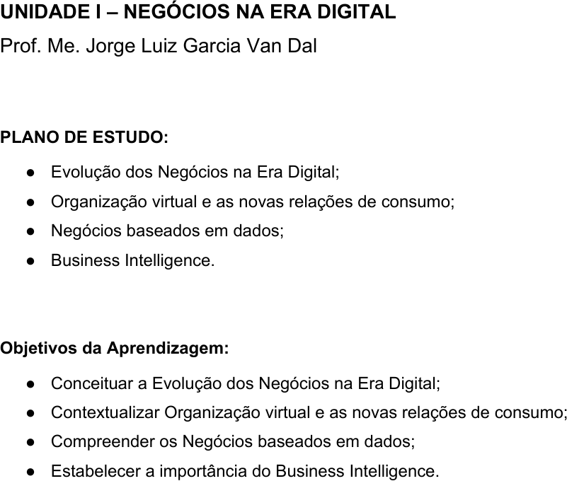 UNIDADE I – NEGÓCIOS NA ERA DIGITAL Prof. Me. Jorge Luiz Garcia Van Dal PLANO DE ESTUDO: ● Evolução dos Negócios na Era Digital; ● Organização virtual e as novas relações de consumo; ● Negócios baseados em dados; ● Business Intelligence. Objetivos da Aprendizagem: ● Conceituar a Evolução dos Negócios na Era Digital; ● Contextualizar Organização virtual e as novas relações de consumo; ● Compreender os Negócios baseados em dados; ● Estabelecer a importância do Business Intelligence. INTRODUÇÃO Caro(a) aluno(a), temos o privilégio de estar vivendo em uma era de radicais transformações tecnológicas e de profundas mudanças em nossa sociedade e em nossa economia. Tais mudanças em nosso modo de vida são provocadas, sobretudo, pelo surgimento das novas tecnologias de informação e de comunicação (TICs), e por isso mesmo as relações de consumo estão passando por algo mais profundo e radical que uma revolução (que já seria algo grandioso), vivemos o que muitos estudiosos chamam de era disruptiva, o que pode ser entendido como uma interrupção no curso normal das coisas, ou seja, uma ruptura com velhos conceitos e práticas. Está emergindo uma nova economia, cada vez mais colaborativa e em rede que, por sua vez, contribui para o surgimento de novos formatos de negócios e empresas, como as startups. A era dos mercados tradicionais, baseados em relações de consumo que necessitavam da presença física dos clientes, está dando lugar à presença virtual das empresas e a disputa pela atenção das pessoas nas redes. Nas páginas que seguem, nós vamos olhar além dos métodos e sistemas tradicionais de negócios e vamos perceber que nos tempos atuais, a economia se sustenta em dados e que as organizações inteligentes são aquelas que buscam se adaptar e evoluir a grande revolução digital no mundo dos negócios. 1. EVOLUÇÃO DOS NEGÓCIOS NA ERA DIGITAL Imagem de tópico: https://www.freepik.com/free-photo/people-working-html- codes_36190663.htm#fromView=search&page=1&position=1&uuid=9cbb0301-d918-44e7- b2ce- 0c34c9efa114&query=EVOLU%C3%87%C3%83O+DOS+NEG%C3%93CIOS+NA+ERA+DI GITAL A chamada sociedade da informação ou era digital é um fenômeno resultante do avanço das tecnologias da informação impulsionado pelo crescimento das redes globais de comunicação. A evolução tecnológica ocorrida nas últimas décadas se acelerou no século XXI e tem alto poder de transformação nas atividades sociais e econômicas em todo o planeta. Nesse sentido, é importante refletirmos sobre o compasso das mudanças que passam a sociedade, as organizações, as pessoas e os governos, pois aquela organização ou indivíduo que não acompanhar este desenvolvimento se tornarão obsoletos ou, até mesmo, extintos rapidamente. Uma revolução em curso. Novas plataformas de comunicação baseadas na interação e colaboração instantâneas estão reconfigurando o entendimento de espaço, tempo, sociabilidade e identidade. Elas representam uma verdadeira revolução na mediação das experiências humanas. “Diferentemente de qualquer outra revolução, o cerne da transformação que estamos vivendo na revolução atual refere-se às tecnologias da informação, processamento e comunicação” (Castells, 2011, p. 50). A frase de Manuel Castells, autor de “Sociedade em Rede”, reflete sua visão da natureza revolucionária de como “um novo sistema eletrônico caracterizado pelo seu alcance global, integração de todos os meios de comunicação e interatividade potencial está mudando e mudará para sempre a nossa cultura” (Castells, 2011, p. 354). Castells (2011) considera que está ocorrendo uma revolução tão importante quanto a invenção do alfabeto, que no ocidente proporcionou a infraestrutura mental para comunicação cumulativa baseada em conhecimentos; embora permitisse discurso racional, separava a comunicação escrita do sistema audiovisual de símbolos e percepções, tão importantes para a expressão plena da mente humana. https://www.freepik.com/free-photo/people-working-html-codes_36190663.htm#fromView=search&page=1&position=1&uuid=9cbb0301-d918-44e7-b2ce-0c34c9efa114&query=EVOLU%C3%87%C3%83O+DOS+NEG%C3%93CIOS+NA+ERA+DIGITAL https://www.freepik.com/free-photo/people-working-html-codes_36190663.htm#fromView=search&page=1&position=1&uuid=9cbb0301-d918-44e7-b2ce-0c34c9efa114&query=EVOLU%C3%87%C3%83O+DOS+NEG%C3%93CIOS+NA+ERA+DIGITAL https://www.freepik.com/free-photo/people-working-html-codes_36190663.htm#fromView=search&page=1&position=1&uuid=9cbb0301-d918-44e7-b2ce-0c34c9efa114&query=EVOLU%C3%87%C3%83O+DOS+NEG%C3%93CIOS+NA+ERA+DIGITAL https://www.freepik.com/free-photo/people-working-html-codes_36190663.htm#fromView=search&page=1&position=1&uuid=9cbb0301-d918-44e7-b2ce-0c34c9efa114&query=EVOLU%C3%87%C3%83O+DOS+NEG%C3%93CIOS+NA+ERA+DIGITAL https://www.freepik.com/free-photo/people-working-html-codes_36190663.htm#fromView=search&page=1&position=1&uuid=9cbb0301-d918-44e7-b2ce-0c34c9efa114&query=EVOLU%C3%87%C3%83O+DOS+NEG%C3%93CIOS+NA+ERA+DIGITAL Uma transformação tecnológica de dimensões históricas similares está ocorrendo (...), ou seja, a integração de vários modos de comunicação em uma rede interativa(...) que, pela primeira vez na história, integra no mesmo sistema, as modalidades escrita, oral e audiovisual da comunicação humana. (Castells, 2011, p. 354) Conforme argumenta Castells (2011), uma nova economia surgiu em escala mundial nas últimas duas décadas, chamada de informacional, considerando que a produtividade e competitividade dependem da capacidade de gerar, processar e aplicar, eficientemente, a informação baseada em conhecimentos, também denominada de global, pelo fato de que as principais atividades produtivas, o consumo, a circulação bem como o capital, o trabalho, a administração, a informação e a tecnologia estão organizados em escala global. Países e regiões mais desenvolvidos tecnolog