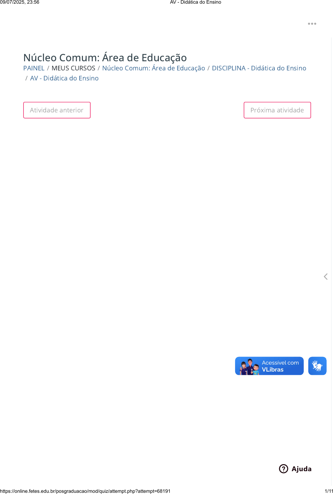 PAINEL / MEUS CURSOS / Núcleo Comum: Área de Educação / DISCIPLINA - Didática do Ensino / AV - Didática do Ensino Núcleo Comum: Área de Educação Atividade anterior Próxima atividade Ajuda 09/07/2025, 23:56 AV - Didática do Ensino https://online.fetes.edu.br/posgraduacao/mod/quiz/attempt.php?attempt=68191 1/11 https://online.fetes.edu.br/posgraduacao/my/ https://online.fetes.edu.br/posgraduacao/my/ https://online.fetes.edu.br/posgraduacao/course/view.php?id=1022 https://online.fetes.edu.br/posgraduacao/course/view.php?id=1022#section-5 https://online.fetes.edu.br/posgraduacao/mod/quiz/view.php?id=6298 https://online.fetes.edu.br/posgraduacao/mod/label/view.php?id=26507 https://online.fetes.edu.br/posgraduacao/mod/label/view.php?id=26508 https://online.fetes.edu.br/posgraduacao Questão 1 Ainda não respondida Vale 1,00 ponto(s). Os dois principais tipos de didática nos possibilitam exercer a didática com criatividade, inovação e resultados. A respeitos destes dois tipos, escolha a opção correta. I) Na Didática Ativa, também chamadas de METODOLOGIAS ATIVAS, o estudante é o foco e o agente de sua aprendizagem. Todos os métodos convergem para sua ação sobre o objeto a ser conhecido. Existem muitos métodos ativos que estão fundamentados na Escola Nova e em outros autores que questionam o uso somente de métodos tradicionais. Esta didática foca nas competências e habilidades e forçam o estudante a assumir a gestão de sua aprendizagem. II) Na Didática Tradicional, o processo do ensino está focado mais na figura do professor: O professor escolhe e prepara os seus métodos que utilizará no processo de ensino. O professor utiliza em seu trabalho docente, os recursos visuais, técnicos ou multimeios para expor e explicar conceitos e conhecimentos. O professor utiliza os métodos que julga serem eficientes para sua aula, adequando sempre às faixas etárias e ao sequenciamento. Escolha uma opção: a. Somente a opção I está correta; b. Somente a opção II está correta; c. Somente a opção I está incorreta; d. As opções I e II estão corretas; e. Somente a opção II está incorreta. 09/07/2025, 23:56 AV - Didática do Ensino https://online.fetes.edu.br/posgraduacao/mod/quiz/attempt.php?attempt=68191 2/11 https://online.fetes.edu.br/posgraduacao Rose Pencil Rose Pencil Questão 2 Ainda não respondida Vale 1,00 ponto(s). Analisando o propósito da didática, onde temos que “Ensinar de forma didática é criar espaço, ou seja, criar condições pedagógicas de aprendizagem”, e que "O professor não ensina, na verdade, mas ajuda ou facilita o aluno a aprender". Sendo assim, "Ninguém educa ninguém, ninguém educa a si mesmo, os homens se educam entre si". (Paulo Freire). Neste sentindo, o professor didático precisa: I) Criar espaço para a aprendizagem por meio de arrumação física da sala sala de aula, com variações em sua forma de organização. II) Criar aulas provocativas e desafiadoras para o estudante III) Planejar formas e estratégias de interação e participação de todos. Escolha uma opção: a. Somente a opção I está correta; b. Todas as opções estão corretas; c. As opções de I a III estão incorretas; d. Somente a opção II está correta; e. Somente a opção III está incorreta. 09/07/2025, 23:56 AV - Didática do Ensino https://online.fetes.edu.br/posgraduacao/mod/quiz/attempt.php?attempt=68191 3/11 https://online.fetes.edu.br/posgraduacao Questão 3 Ainda não respondida Vale 1,00 ponto(s). O mapa mental mostra que para aprender, as aulas precisam ser trabalhadas de forma didática criando espaços e condições pedagógicas de aprendizagem. Podemos dizer que criar “Espaços de aprendizagem” é: I) Deixar os alunos falarem e interagirem; II) Fazer perguntas e ouvir respostas, e também ouvir perguntas e dar respostas; III) Trazer informações que despertem a curiosidade e interesse nos alunos; IV) Fomentar o o encorajamento e socialização de conhecimento entre professores e estudantes; V) Permitir liberdade de expressão, de sentimentos, pensamentos e ideias diferentes. Escolha uma opção: a. Somente as opções I e II estão corretas; b. Somente as opções II e III estão corretas; c. Todas as opções estão corretas; d. Somente as opções III e IV estão corretas; e. Somente as opções IV e V estão corretas. 09/07/2025, 23:56 AV - Didática do Ensino https://online.fetes.edu.br/posgraduacao/mod/quiz/attempt.php?attempt=68191 4/11 https://online.fetes.edu.br/posgraduacao Questão 4 Ainda não respondida Vale 1,00 ponto(s). Concepções que embasam a prática educativa e que garantem a identidade e qualidade ao trabalho desenvolvido pelo professor. Um exemplo dessas proposições pode ser visto na ênfase dada pela _______________ ao exame do caráter histórico e contextual das práticas de linguagem, de modo a permitir o entendimento das razões do seu uso, da valoração, do uso, dentre outros. Escolha a opção que completa o espaço. Escolha uma opção: a. Nova BNCC; b. PCNs de 2019; c. Proposta Pedagógica; d. Praticas pedagógicas; e. Avaliação. 09/07/2025, 23:56 AV - Didática do Ensino https://online.fetes.edu.br/posgraduacao/mod/quiz/attempt.php?attempt=68191 5/11 https://online.fetes.edu.br/posgraduacao Questão 5 Ainda não respondida Vale 1,00 ponto(s). Toda boa aula didática precisa ser planejada, e assim, criar espaços de aprendizagem, ou seja, condições pedagógicas para que aconteça a aprendizagem significativa. Como um professor pode criar espaços de aprendizagem significativa em sua aula?. Escolha a opção INCORRETA. Escolha uma opção: a. Falando mais que os alunos, já que detém a maior parte do conhecimento. b. Fazendo perguntas claras e inteligentes, e que levem os alunos a pensarem e analisarem situações do cotidiano e da sociedade. c. Quando as informações e o conteúdo apresentados servem para serem analisadas, refletidas, relacionadas a outros conhecimentos, etc. d. Qua