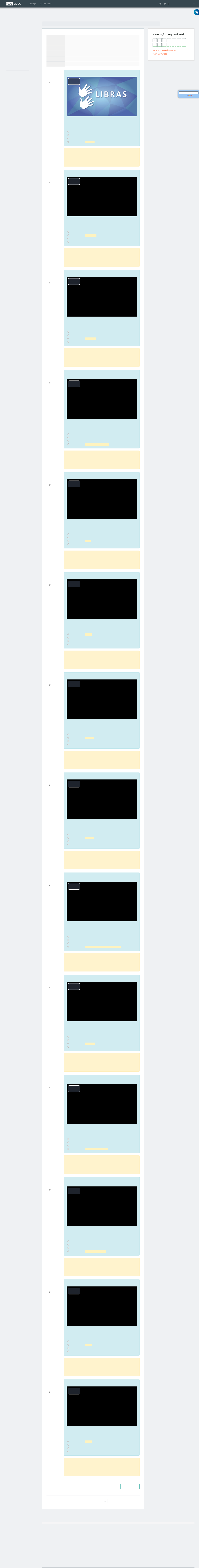 EV.G | Escola Virtual.Gov MOOC Seguindo as tendências educacionais mais recentes, a Escola Virtual.Gov oferece uma plataforma MOOC que sustenta a oferta de cursos de curta e média duração, abertos e gratuitos, como alternativa de formação mais aderente ao desenvolvimento rápido de competências para o trabalho. SOBRE A ESCOLA Catálogo de Cursos Catálogo de Programas Conheça a Escola Adesão Institucional Instituições Participantes Política de Privacidade UTILIDADES Validação de Documentos Perguntas Frequentes e Fale Conosco Catálogo Área do aluno Painel / Meus cursos / Introdução à Libras / Módulo 4: Casas e cômodos, utensílios de cozinha e cores / Exercício Avaliativo - Módulo 4 Introdução à Libras Questão 1 Correto Atingiu 1,00 de 1,00 Marcar questão Questão 2 Correto Atingiu 1,00 de 1,00 Marcar questão Questão 3 Correto Atingiu 1,00 de 1,00 Marcar questão Questão 4 Correto Atingiu 1,00 de 1,00 Marcar questão Questão 5 Correto Atingiu 1,00 de 1,00 Marcar questão Questão 6 Correto Atingiu 1,00 de 1,00 Marcar questão Questão 7 Correto Atingiu 1,00 de 1,00 Marcar questão Questão 8 Correto Atingiu 1,00 de 1,00 Marcar questão Questão 9 Correto Atingiu 1,00 de 1,00 Marcar questão Questão 10 Correto Atingiu 1,00 de 1,00 Marcar questão Questão 11 Correto Atingiu 1,00 de 1,00 Marcar questão Questão 12 Correto Atingiu 1,00 de 1,00 Marcar questão Questão 13 Correto Atingiu 1,00 de 1,00 Marcar questão Questão 14 Correto Atingiu 1,00 de 1,00 Marcar questão Terminar revisão Iniciado em segunda, 4 set 2023, 15:18 Estado Finalizada Concluída em segunda, 4 set 2023, 15:21 Tempo empregado 2 minutos 35 segundos Notas 14,00/14,00 Avaliar 20,00 de um máximo de 20,00(100%) Assista ao vídeo e assinale a alternativa em que o sinal de cozinha é realizado. Fonte: Instituto Federal de São Paulo Caso não consiga visualizar o vídeo (formato .mp4, tamanho 2,8MB), clique com o botão direito do mouse e selecione "Salvar link como...". Escolha uma opção: Alternativa A Alternativa B Alternativa C Alternativa D Cozinha Sua resposta está correta. Alternativa a: Sala. Alternativa b: Banheiro. Alternativa c: Quarto. A resposta é: Alternativa d: Cozinha. Assista ao vídeo e assinale a alternativa em que o sinal de biblioteca é realizado. Fonte: Instituto Federal de São Paulo Caso não consiga visualizar o vídeo (formato .mp4, tamanho 2,9MB), clique com o botão direito do mouse e selecione "Salvar link como...". Escolha uma opção: Alternativa A Alternativa B Biblioteca. Alternativa C Alternativa D Sua resposta está correta. Alternativa a: Salão de jogos. Alternativa c: Corredor. Alternativa d: Salão de festas. A resposta é: Alternativa b: Biblioteca. Assista ao vídeo e assinale a alternativa em que o sinal de escritório é realizado. Fonte: Instituto Federal de São Paulo Caso não consiga visualizar o vídeo (formato .mp4, tamanho 2,8MB), clique com o botão direito do mouse e selecione "Salvar link como...". Escolha uma opção: Alternativa A Alternativa B Alternativa C Escritório. Alternativa D Sua resposta está correta. Alternativa a: Quarto. Alternativa b: Casa. Alternativa d: Prédio. A resposta é: Alternativa c: Escritório. Assista ao vídeo e assinale a alternativa em que os sinais de casa, barracos e prédios são realizados. Fonte: Instituto Federal de São Paulo Caso não consiga visualizar o vídeo (formato .mp4, tamanho 4,4MB), clique com o botão direito do mouse e selecione "Salvar link como...". Escolha uma opção: Alternativa A Alternativa B Alternativa C Alternativa D Casa, barracos e prédios. Sua resposta está correta. Alternativa a: Barraco, castelo e casa. Alternativa b: Casa, prédios e castelo. Alternativa c: Casa grande, casa pequena e castelo. A resposta é: Alternativa d: Casa, barracos e prédios. Assista ao vídeo e assinale a alternativa em que o sinal de faca é realizado. Fonte: Instituto Federal de São Paulo Caso não consiga visualizar o vídeo (formato .mp4, tamanho 3,2MB), clique com o botão direito do mouse e selecione "Salvar link como...". Escolha uma opção: Alternativa A Alternativa B Alternativa C Faca Alternativa D Sua resposta está correta. Alternativa a: Concha. Alternativa b: Garfo. Alternativa d: Colher. A resposta é: Alternativa c: Faca. Assista ao vídeo e assinale a alternativa em que o sinal de copo é realizado. Fonte: Instituto Federal de São Paulo Caso não consiga visualizar o vídeo (formato .mp4, tamanho 3,0MB), clique com o botão direito do mouse e selecione "Salvar link como...". Escolha uma opção: Alternativa A Copo Alternativa B Alternativa C Alternativa D Sua resposta está correta. Alternativa b: Xícara. Alternativa c: Prato. Alternativa d: Colher. A resposta é: Alternativa a: Copo. Assista ao vídeo e assinale a alternativa em que o sinal de concha é realizado. Fonte: Instituto Federal de São Paulo Caso não consiga visualizar o vídeo (formato .mp4, tamanho 3,0MB), clique com o botão direito do mouse e selecione "Salvar link como...". Escolha uma opção: Alternativa A Alternativa B Concha Alternativa C Alternativa D Sua resposta está correta. Alternativa a: Tesoura. Alternativa c: Garfo. Alternativa d: Pincel. A resposta é: Alternativa b: Concha. Assista ao vídeo e assinale a alternativa em que o sinal de peneira é realizado. Fonte: Instituto Federal de São Paulo Caso não consiga visualizar o vídeo (formato .mp4, tamanho 3,0MB), clique com o botão direito do mouse e selecione "Salvar link como...". Escolha uma opção: Alternativa A Alternativa B Peneira Alternativa C Alternativa D Sua resposta está correta. Alternativa a: Pilão. Alternativa c: Jarra. Alternativa d: Panela. A resposta é: Alternativa b: Peneira. Assista ao vídeo e assinale a alternativa em que os sinais de abridor de latas, tesoura e saca rolhas são realizados. Fonte: Instituto Federal de São Paulo Caso não consiga visualizar o vídeo (formato .mp4, tamanho 4,7MB), clique com o bo
