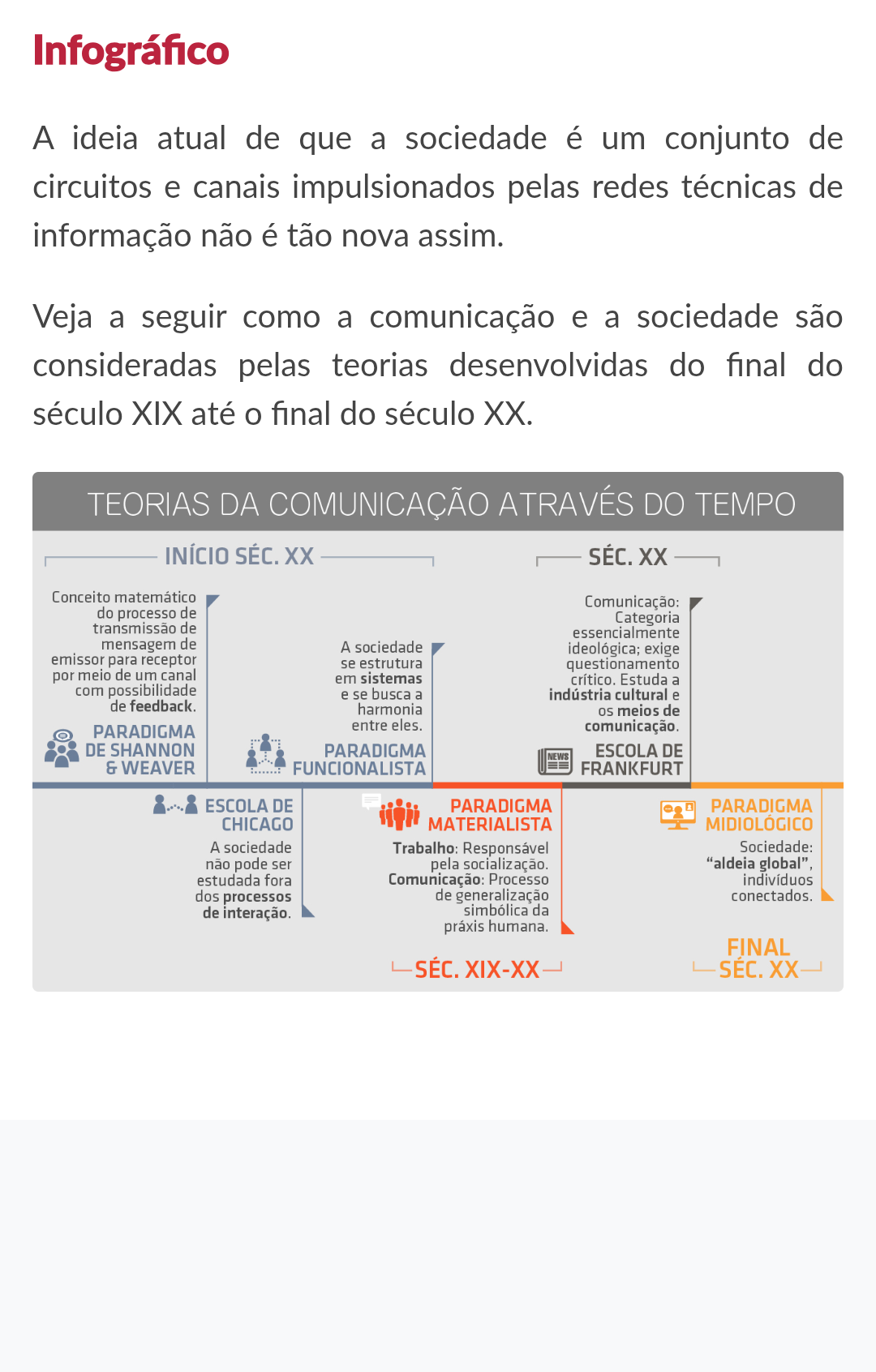 Infográfico A ideia atual de que a sociedade é um conjunto de circuitos e canais impulsionados pelas redes técnicas de informação não é tão nova assim. Veja a seguir como a comunicação e a sociedade são consideradas pelas teorias desenvolvidas do final do século XIX até o final do século XX. TEORIAS DA COMUNICAÇÃO ATRAVÉS DO TEMPO INÍCIO SÉC. SÉC. Conceito matemático Comunicação: do processo de Categoria transmissão de essencialmente mensagem de A sociedade ideológica; exige emissor para receptor se estrutura questionamento por meio de um canal em sistemas crítico. Estuda a com possibilidade e se busca a indústria cultural e de feedback. harmonia meios de PARADIGMA entre eles. comunicação. DE SHANNON PARADIGMA ESCOLA DE & WEAVER FUNCIONALISTA FRANKFURT ESCOLA DE PARADIGMA PARADIGMA CHICAGO MATERIALISTA MIDIOLÓGICO A sociedade Trabalho: Responsável Sociedade: não pode ser pela socialização. "aldeia global", estudada fora Comunicação: Processo indivíduos dos processos de generalização conectados. de interação. simbólica da práxis humana. FINAL SÉC. XIX-XX SÉC.
