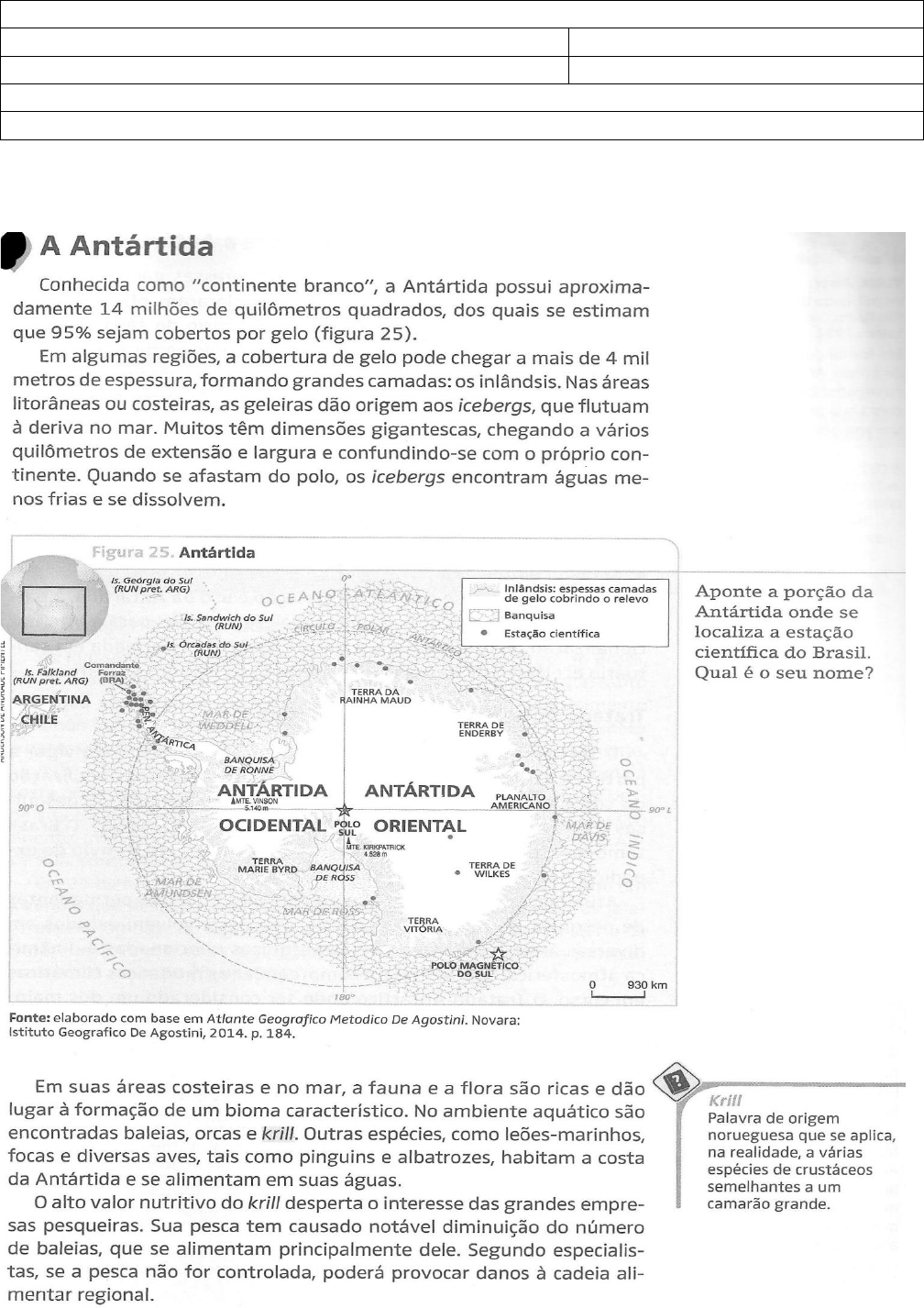 Atividades Nome: Série: 8º Ano____ Professor: Disciplina: GEOGRAFIA Orientações: Leia os textos e responda as questões. Observações: Responda a caneta. Olá Aluno!!! Bem-vindo ao tema a Antártida. Leia atentamente o texto, conjuntamente, faça associações mentais entre as imagens e os conceitos apresentados. Anote em seu caderno conceitos e dicas para uma maior fixação do que você aprendeu. Faça as atividades com atenção e se tiver dúvidas volte ao texto, certamente você encontrará a resposta. Bons estudos! EXERCÍCIOS 1 - A principal atividade econômica na Antártida é: a) Extração de petróleo b) Agricultura c) Turismo d) Pesca 2 - Analise as afirmativas sobre a Antártida e marque a alternativa verdadeira. a) Localizada no Hemisfério Meridional, a Antártida é um continente formado por uma extensa área coberta de gelo. b) Em razão das condições climáticas (temperaturas abaixo de 0 °C), a Antártida não é habitada por seres humanos. c) Com extensão territorial de 13,2 milhões de quilômetros quadrados, a Antártida é o menor continente terrestre. d) A Antártida é banhada por três oceanos: Atlântico, Pacífico e Mar Glacial Ártico. 3 – Imagine 14 milhões de km² permanentemente cobertos de gelo, como um gigantesco deserto branco e muito frio. Essa é a paisagem antártica. O continente Antártico rodeia o polo Sul e é o único lugar da Terra sem história, mitos ou lendas, pois jamais existiu população humana nativa. Atualmente, a população desse continente é formada por a) pesquisadores de todas as partes do mundo. b) pesquisadores que extraem o petróleo da região. c) ambientalistas que defendem a ocupação humana no continente. d) nativos oriundos do polo Norte na tentativa de se adequar às mesmas condições climáticas. e) refugiados de várias partes do mundo, já que na Antártica não possui leis de extradição clandestina. 4 – “Continente com litoral bastante recortado banhado pelos oceanos Atlântico, Pacífico e Índico. Está localizado no extremo austral do Planeta.” (Manual Compacto de Geografia Geral. São Paulo: Rideel, 2010. p. 321.) A citação anterior refere-se a qual continente? a) África. b) Oceania. c) Antártida. d) América do Sul. 5 – A Antártida é um continente que representa uma questão da geopolítica internacional. Em seus 14 milhões de quilômetros quadrados estão localizados importantes reservas de cobre, urânio e carvão natural, sem contar que dispõe de 90% da água doce do Planeta em suas geleiras. Uma resolução geopolítica sobre esse continente foi estabelecida pelo Tratado: a) Antártico. b) Ártico-Antártico. b) Polar do Sul. d) Continental-austral. 6 - Nos últimos 50 anos, as temperaturas de inverno na península antártica subiram quase 6°C. Ao contrário do esperado, o aquecimento tem aumentado a precipitação de neve. Isso ocorre porque o gelo marinho, que forma um manto impermeável sobre o oceano, está derretendo devido à elevação de temperatura, o que permite que mais umidade escape para a atmosfera. Essa umidade cai na forma de neve. Logo depois de chegar a essa região, certa espécie de pinguins precisa de solos nus para construir seus ninhos de pedregulhos. Se a neve não derrete a tempo, eles põem seus ovos sobre ela. Quando a neve finalmente derrete, os ovos se encharcam de água e goram. Scientific American Brasil, ano 2, n0 . 21, 2004, p.80 (com adaptações). A partir do texto, analise as seguintes afirmativas. I - O aumento da temperatura global interfere no ciclo da água na península antártica. II - O aquecimento global pode interferir no ciclo de vida de espécies típicas de região de clima polar. III - A existência de água em estado sólido constitui fator crucial para a manutenção da vida em alguns biomas. É correto o que se afirma a) apenas em I. b) apenas em II. c) apenas em I e II. d) em I, II e III. 7 - A Antártica tem um papel essencial nos sistemas naturais globais. É o principal regulador térmico do Planeta, controla as circulações atmosféricas e oceânicas, influenciando o clima e as condições de vida na Terra. Além disso, é detentora das maiores reservas de gelo (90%) e água doce (70%) do Planeta e de recursos minerais e energéticos incalculáveis. O Programa Antártico Brasileiro (PROANTAR) é um programa da Marinha do Brasil, que tem presença no continente da Antártica e coordena a pesquisa e dá apoio operacional para a pesquisa na região. A estação de pesquisa brasileira na Antártica recebe o nome de a) Santos Dumont. b) Comandante Ferraz. c) Duque de Caxias. d) Marques de Tamandaré. Bons estudos!!! Um abraço do professor.