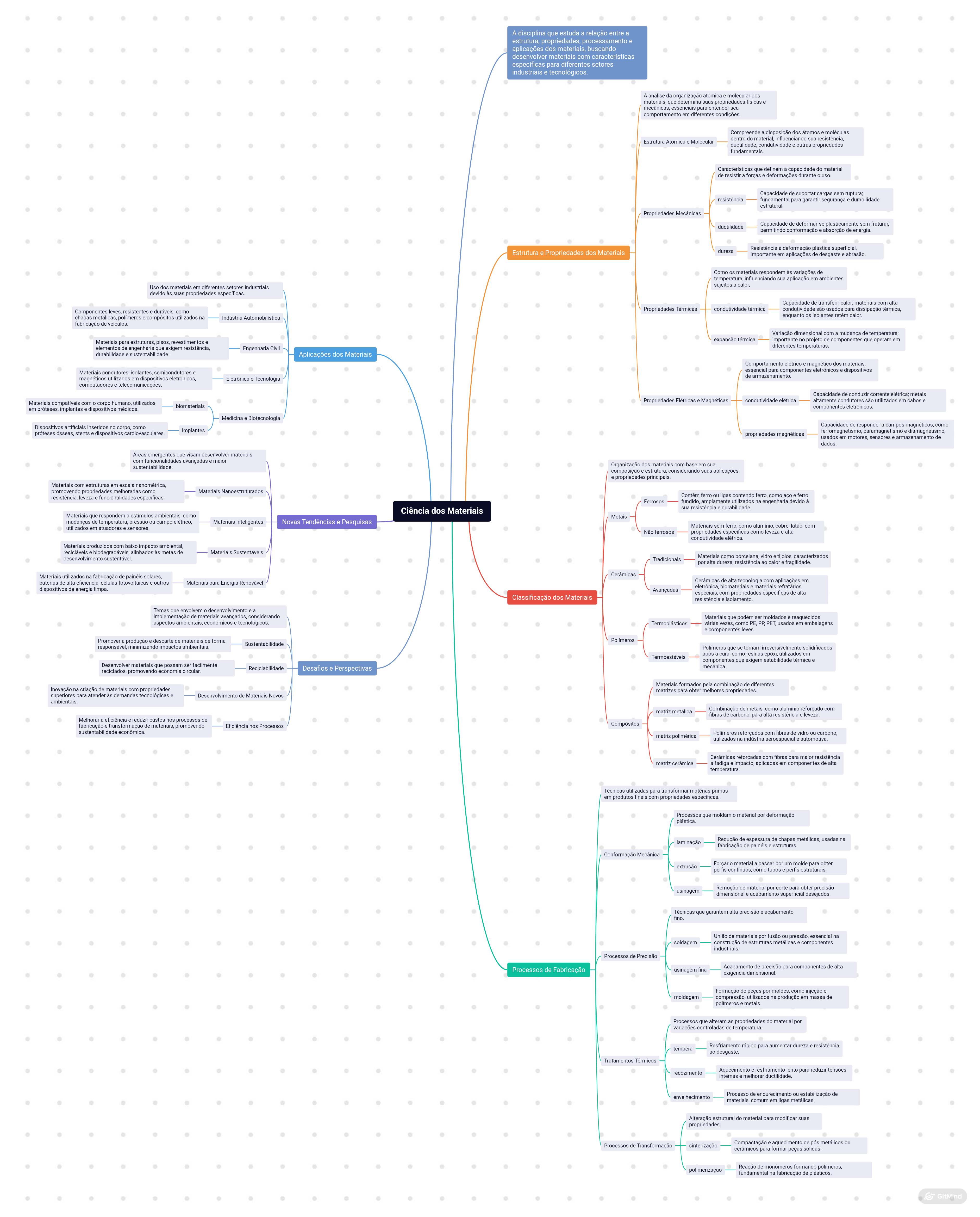 A disciplina que estuda relação entre estrutura, propriedades, processamento e aplicações dos materiais, buscando desenvolver materiais com características específicas para diferentes setores industriais tecnológicos. A análise da organização atômica molecular dos materiais, que determina suas propriedades mecânicas, essenciais para entender seu comportamento em diferentes condições. Compreende disposição dos Estrutura Atômica Molecular dentro do material, influenciando sua resistência, ductilidade, condutividade outras propriedades fundamentais. Características que definem capacidade do material de resistir forças deformações durante uso. Capacidade de suportar cargas sem ruptura; resistência fundamental para garantir segurança durabilidade estrutural. Propriedades Mecânicas ductilidade Capacidade de deformar se plasticamente sem fraturar, permitindo conformação absorção de energia. Estrutura e Propriedades dos Materiais dureza Resistência deformação plástica superficial, importante em aplicações de desgaste Como os materiais respondem às variações de temperatura, nfluenciando sua aplicação em ambientes Uso dos materiais em diferentes setores industriais sujeitos calor. devido às suas propriedades específicas. Capacidade de transferir calor; materiais com alta Componentes leves, resistentes duráveis, como Propriedades Térmicas condutividade condutividade são usados para dissipação térmica, chapas metálicas, compósitos utilizados na Indústria enquanto isolantes calor. fabricação de veículos. Variação dimensional com mudança de temperatura; Materiais para estruturas, pisos, revestimentos expansão térmica importante no projeto de componentes que operam em elementos de engenharia que exigem resistência, Engenharia Civil diferentes temperaturas. durabilidade sustentabilidade. Aplicações dos Materiais Comportamento elétrico magnético dos materiais, Materiais condutores, isolantes, semicondutores e essencial para componentes eletrônicos dispositivos magnéticos utilizados em dispositivos eletrônicos, Eletrônica Tecnologia de computadores Capacidade de conduzir corrente elétrica; metais Materiais compatíveis com corpo humano, utilizados Propriedades Elétricas Magnéticas condutividade elétrica biomateriais altamente condutores são utilizados em cabos e em proteses, implantes dispositivos médicos. componentes Medicina Biotecnologia Dispositivos artificiais inseridos no corpo, como próteses ósseas, stents dispositivos implantes Capacidade de responder a campos magnéticos, como propriedades magnéticas ferromagnetismo, paramagnetismo diamagnetismo, usados em motores, sensores armazenamento de dados. Areas emergentes que visam desenvolver materiais com funcionalidades avançadas maior Organização dos materiais com base em sua composição estrutura, considerando suas aplicações propriedades principais. Materiais com estruturas em escala nanométrica, promovendo propriedades melhoradas como Materiais Nanoestruturados resistência, leveza e funcionalidades ferro contendo ferro, como aço ferro Ferrosos fundido, amplamente utilizados na engenharia devido à Materiais que respondem estímulos ambientais, como Ciência dos Materiais sua resistência durabilidade. Metais mudanças de temperatura, pressão ou campo elétrico, Materiais Inteligentes Novas Tendências Pesquisas utilizados em atuadores sensores. Materiais sem ferro, como alumínio, cobre, latão, com Não ferrosos propriedades especificas como leveza alta condutividade Materiais produzidos com baixo impacto ambiental, recicláveis biodegradáveis, alinhados metas de Materiais Sustentáveis desenvolvimento sustentável. Tradicionais Materiais como porcelana, vidro tijolos, caracterizados por alta dureza, resistência ao calor fragilidade. Materiais utilizados na fabricação de solares, Cerâmicas baterias de alta eficiência, células fotovoltaicas outros Materiais para Energia Renovável Cerâmicas de alta tecnologia com aplicações em dispositivos de energia limpa. eletrônica, biomateriais refratários Avançadas Classificação dos Materiais especiais, com propriedades de alta resistência isolamento. Temas que envolvem desenvolvimento de materiais avançados, considerando aspectos ambientais, econômicos tecnológicos. Materiais que podem ser moldados reaquecidos Termoplásticos vezes, como PE, PP. PET, usados em embalagens componentes leves. Promover produção descarte de materiais de forma Sustentabilidade responsável, minimizando impactos ambientais. que se tornam irreversivelmente solidificados Termoestáveis cura, como resinas epoxi, utilizados em Desenvolver materiais que possam ser facilmente componentes que exigem estabilidade térmica reciclados, promovendo economia circular. Reciclabilidade Desafios Perspectivas mecânica. Inovação na criação de materiais com propriedades Materiais formados pela combinação de diferentes superiores para atender demandas tecnológicas Desenvolvimento de Materiais Novos matrizes para obter melhores propriedades. ambientais. matriz metálica Combinação de metais, como reforçado com Melhorar eficiência reduzir custos nos processos de fibras de carbono, para alta resistência leveza. fabricação transformação de materiais, promovendo Eficiência nos Processos Compósitos sustentabilidade econômica. matriz polimérica Polímeros reforçados com fibras de vidro ou carbono, utilizados na indústria aeroespacial automotiva. Cerâmicas reforcadas com fibras para maior resistência matriz ceramica a fadiga impacto, aplicadas em componentes de alta Técnicas utilizadas para transformar matérias-primas em produtos finais com propriedades Processos que moldam material por deformação plástica. laminação Redução de espessura de chapas usadas na fabricação de paineis Conformação Mecânica extrusão Forçar material passar por um molde para obter perfis como tubos perfis estruturais. usinagem Remoção de