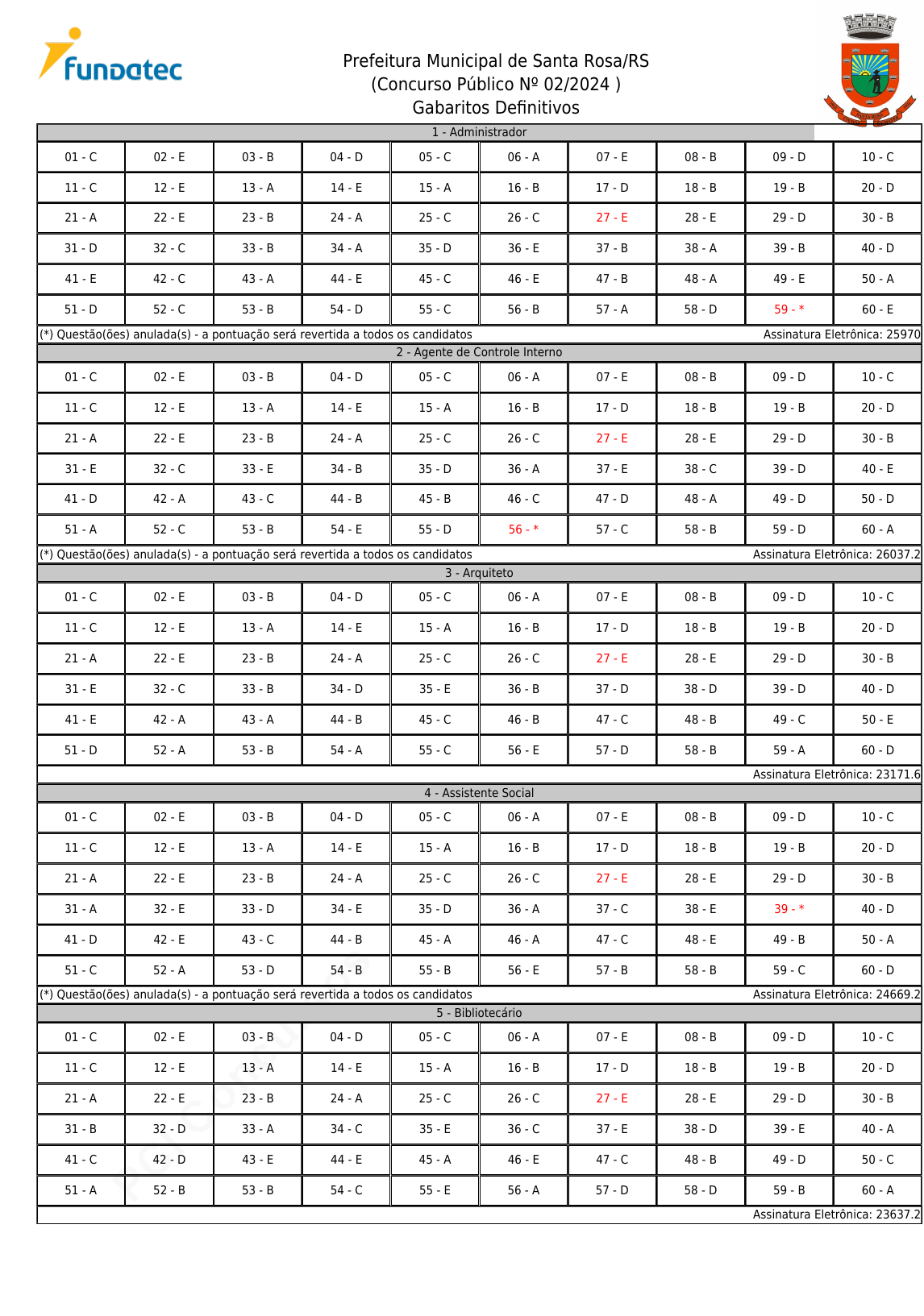 pcimarkpci MDAwMDowMDAwOjAwMDA6MDAwMDowMDAwOmZmZmY6YWFlZTpiYWE0:U3VuLCAxMyBKdWwgMjAyNSAyMDozNjo1MyAtMDMwMA== www.pciconcursos.com.br Prefeitura Municipal de Santa Rosa/RS (Concurso Público Nº 02/2024 ) Gabaritos Definitivos 1 - Administrador 01 - C 02 - E 03 - B 04 - D 05 - C 06 - A 07 - E 08 - B 09 - D 10 - C 11 - C 12 - E 13 - A 14 - E 15 - A 16 - B 17 - D 18 - B 19 - B 20 - D 21 - A 22 - E 23 - B 24 - A 25 - C 26 - C 27 - E 28 - E 29 - D 30 - B 31 - D 32 - C 33 - B 34 - A 35 - D 36 - E 37 - B 38 - A 39 - B 40 - D 41 - E 42 - C 43 - A 44 - E 45 - C 46 - E 47 - B 48 - A 49 - E 50 - A 51 - D 52 - C 53 - B 54 - D 55 - C 56 - B 57 - A 58 - D 59 - * 60 - E (*) Questão(ões) anulada(s) - a pontuação será revertida a todos os candidatos Assinatura Eletrônica: 25970 2 - Agente de Controle Interno 01 - C 02 - E 03 - B 04 - D 05 - C 06 - A 07 - E 08 - B 09 - D 10 - C 11 - C 12 - E 13 - A 14 - E 15 - A 16 - B 17 - D 18 - B 19 - B 20 - D 21 - A 22 - E 23 - B 24 - A 25 - C 26 - C 27 - E 28 - E 29 - D 30 - B 31 - E 32 - C 33 - E 34 - B 35 - D 36 - A 37 - E 38 - C 39 - D 40 - E 41 - D 42 - A 43 - C 44 - B 45 - B 46 - C 47 - D 48 - A 49 - D 50 - D 51 - A 52 - C 53 - B 54 - E 55 - D 56 - * 57 - C 58 - B 59 - D 60 - A (*) Questão(ões) anulada(s) - a pontuação será revertida a todos os candidatos Assinatura Eletrônica: 26037.2 3 - Arquiteto 01 - C 02 - E 03 - B 04 - D 05 - C 06 - A 07 - E 08 - B 09 - D 10 - C 11 - C 12 - E 13 - A 14 - E 15 - A 16 - B 17 - D 18 - B 19 - B 20 - D 21 - A 22 - E 23 - B 24 - A 25 - C 26 - C 27 - E 28 - E 29 - D 30 - B 31 - E 32 - C 33 - B 34 - D 35 - E 36 - B 37 - D 38 - D 39 - D 40 - D 41 - E 42 - A 43 - A 44 - B 45 - C 46 - B 47 - C 48 - B 49 - C 50 - E 51 - D 52 - A 53 - B 54 - A 55 - C 56 - E 57 - D 58 - B 59 - A 60 - D Assinatura Eletrônica: 23171.6 4 - Assistente Social 01 - C 02 - E 03 - B 04 - D 05 - C 06 - A 07 - E 08 - B 09 - D 10 - C 11 - C 12 - E 13 - A 14 - E 15 - A 16 - B 17 - D 18 - B 19 - B 20 - D 21 - A 22 - E 23 - B 24 - A 25 - C 26 - C 27 - E 28 - E 29 - D 30 - B 31 - A 32 - E 33 - D 34 - E 35 - D 36 - A 37 - C 38 - E 39 - * 40 - D 41 - D 42 - E 43 - C 44 - B 45 - A 46 - A 47 - C 48 - E 49 - B 50 - A 51 - C 52 - A 53 - D 54 - B 55 - B 56 - E 57 - B 58 - B 59 - C 60 - D (*) Questão(ões) anulada(s) - a pontuação será revertida a todos os candidatos Assinatura Eletrônica: 24669.2 5 - Bibliotecário 01 - C 02 - E 03 - B 04 - D 05 - C 06 - A 07 - E 08 - B 09 - D 10 - C 11 - C 12 - E 13 - A 14 - E 15 - A 16 - B 17 - D 18 - B 19 - B 20 - D 21 - A 22 - E 23 - B 24 - A 25 - C 26 - C 27 - E 28 - E 29 - D 30 - B 31 - B 32 - D 33 - A 34 - C 35 - E 36 - C 37 - E 38 - D 39 - E 40 - A 41 - C 42 - D 43 - E 44 - E 45 - A 46 - E 47 - C 48 - B 49 - D 50 - C 51 - A 52 - B 53 - B 54 - C 55 - E 56 - A 57 - D 58 - D 59 - B 60 - A Assinatura Eletrônica: 23637.2 pcimarkpci MDAwMDowMDAwOjAwMDA6MDAwMDowMDAwOmZmZmY6YWFlZTpiYWE0:U3VuLCAxMyBKdWwgMjAyNSAyMDozNjo1MyAtMDMwMA== www.pciconcursos.com.br Prefeitura Municipal de Santa Rosa/RS (Concurso Público Nº 02/2024 ) Gabaritos Definitivos 6 - Engenheiro Eletricista 01 - C 02 - E 03 - B 04 - D 05 - C 06 - A 07 - E 08 - B 09 - D 10 - C 11 - C 12 - E 13 - A 14 - E 15 - A 16 - B 17 - D 18 - B 19 - B 20 - D 21 - A 22 - E 23 - B 24 - A 25 - C 26 - C 27 - E 28 - E 29 - D 30 - B 31 - B 32 - * 33 - C 34 - B 35 - E 36 - C 37 - A 38 - B 39 - C 40 - B 41 - C 42 - A 43 - A 44 - D 45 - B 46 - A 47 - E 48 - E 49 - C 50 - C 51 - B 52 - D 53 - D 54 - D 55 - A 56 - D 57 - E 58 - C 59 - E 60 - E (*) Questão(ões) anulada(s) - a pontuação será revertida a todos os candidatos Assinatura Eletrônica: 25619.6 7 - Engenheiro Florestal 01 - C 02 - E 03 - B 04 - D 05 - C 06 - A 07 - E 08 - B 09 - D 10 - C 11 - C 12 - E 13 - A 14 - E 15 - A 16 - B 17 - D 18 - B 19 - B 20 - D 21 - A 22 - E 23 - B 24 - A 25 - C 26 - C 27 - E 28 - E 29 - D 30 - B 31 - C 32 - E 33 - D 34 - C 35 - B 36 - E 37 - * 38 - A 39 - B 40 - A 41 - A 42 - B 43 - C 44 - D 45 - A 46 - B 47 - B 48 - * 49 - C 50 - C 51 - B 52 - E 53 - A 54 - A 55 - D 56 - D 57 - B 58 - E 59 - E 60 - B (*) Questão(ões) anulada(s) - a pontuação será revertida a todos os candidatos Assinatura Eletrônica: 25782.8 8 - Engenheiro Químico 01 - C 02 - E 03 - B 04 - D 05 - C 06 - A 07 - E 08 - B 09 - D 10 - C 11 - C 12 - E 13 - A 14 - E 15 - A 16 - B 17 - D 18 - B 19 - B 20 - D 21 - A 22 - E 23 - B 24 - A 25 - C 26 - C 27 - E 28 - E 29 - D 30 - B 31 - E 32 - * 33 - A 34 - E 35 - C 36 - A 37 - D 38 - D 39 - C 40 - E 41 - B 42 - A 43 - D 44 - B 45 - B 46 - D 47 - C 48 - E 49 - B 50 - B 51 - E 52 - D 53 - B 54 - B 55 - B 56 - A 57 - C 58 - B 59 - D 60 - A (*) Questão(ões) anulada(s) - a pontuação será revertida a todos os candidatos Assinatura Eletrônica: 23670.8 9 - Geólogo 01 - C 02 - E 03 - B 04 - D 05 - C 06 - A 07 - E 08 - B 09 - D 10 - C 11 - C 12 - E 13 - A 14 - E 15 - A 16 - B 17 - D 18 - B 19 - B 20 - D 21 - A 22 - E 23 - B 24 - A 25 - C 26 - C 27 - E 28 - E 29 - D 30 - B 31 - B 32 - C 33 - C 34 - C 35 - E 36 - B 37 - D 38 - B 39 - B 40 - D 41 - A 42 - D 43 - * 44 - B 45 - A 46 - C 47 - C 48 - A 49 - E 50 - A 51 - A 52 - D 53 - D 54 - A 55 - B 56 - E 57 - E 58 - E 59 - C 60 - D (*) Questão(ões) anulada(s) - a pontuação será revertida a todos os candidatos Assinatura Eletrônica: 25072.4 pcimarkpci MDAwMDowMDAwOjAwMDA6MDAwMDowMDAwOmZmZmY6YWFlZTpiYWE0:U3VuLCAxMyBKdWwgMjAyNSAyMDozNjo1MyAtMDMwMA== www.pciconcursos.com.br PREFEITURA MUNICIPAL DE SANTA ROSA/RS CONCURSO PÚBLICO Nº 02/2024 EDITAL Nº 02/2025 – RETIFICA O GABARITO DEFINITIVO E TORNA SEM EFEITO O EDITAL Nº 01/2025 A Sra. Margueidi Cunegatto, Diretora do Departamento de Recursos Humanos, torna pública a presente divulgação para informar o que segue: 1. Torna-se sem efeito o Edital nº 01/2025, publicado no site da Fundatec em 27/01/2025. 2. Retifica-se o gabarito definitivo e a Justificativa para Manutenção ou Alteração dos Gabaritos Preliminares da matéria Legislação Municipal, conforme segue: MATÉRIA: