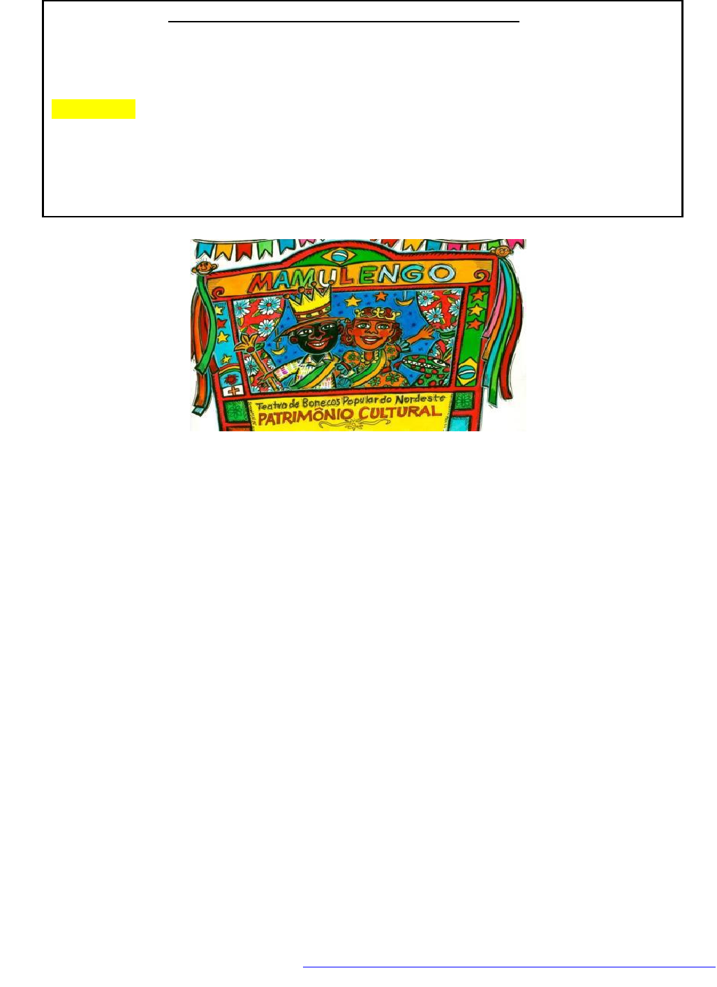 Atividades Pedagógicas Complementares (APCs) De acordo com o cronograma, atividades enviadas semanalmente, postada no dia 14/08 relacionado a duas (02) aulas da disciplina de Arte. Professora: Dagmar Herculano da Silva 6º ANO *Conteúdo: Teatro de boneco Mamulengo Orientações: 1° Leia com atenção o texto e responda as questões; 2º Assista ao vídeo sobre o tema proposto; 3º Faça as atividades com capricho; 4º Envie fotos pelo whatsApp das atividades concluídas até dia 20/08/2020. “A necessidade de narrar fatos e representar por meio da ação dramática está presente em rituais de diversas culturas e tempos, e provavelmente diz respeito à necessidade humana de recriar a realidade em que vive e de transcender seus limites.” (Parâmetros Curriculares Nacionais: Arte – Teatro. 1998) O Mamulengo é a forma popular e tradicional do teatro de bonecos no Brasil, nasceu nos interiores do Nordeste e de lá, migrou para grandes centros e outras regiões. É chamado de Mamulengo, em Pernambuco e no Distrito Federal, mas também recebe diversos nomes pelo Brasil. É Babau, na Paraíba; João Redondo ou Calunga, no Rio Grande do Norte; e Cassimiro Coco, no Ceará, Piauí e Maranhão. A brincadeira, como é chamada a apresentação de Mamulengo, é um ofício repassado oralmente, por convívio familiar ou de mestre para aprendiz. Em 2015, foi reconhecido como patrimônio cultural imaterial brasileiro, pelo Instituto do Patrimônio Histórico e Artístico Nacional (Iphan), sendo batizado de forma unificada como Teatro de Bonecos Popular do Nordeste. Histórias registradas em livros dizem que os bonecos chegaram ao Brasil com os portugueses jesuítas, no intuito de catequizar. Dentre várias versões sobre a origem desse folguedo, acreditamos na memória popular, que nos fala sobre as raízes afro-brasileiras. O saudoso Mestre Ginu, bonequeiro pernambucano, contava que o Mamulengo surgiu nas senzalas, onde o povo negro escravizado se reinventava para contar histórias de libertação, a partir de bonecos esculpidos em madeira, era a dor transformada em alegria. Com situações cotidianas de superação e irreverência, as brincadeiras de Mamulengo percorrem o tempo, falando sobre luta, fé, amor, guerra e liberdade. Até hoje, a tolda (armação de tecido de onde o ator manipula os bonecos) se abre e as figuras ganham vida para dar voz aos sentimentos e expressões da nossa gente brasileira, trabalhadora e brincante. É o povo contando sua própria história. Fonte: http://letraecultura.blogspot.com/2013/10/teatro-de-mamulengos.html http://portal.iphan.gov.br/pagina/detalhes/508 http://letraecultura.blogspot.com/2013/10/teatro-de-mamulengos.html LEIA O TEXTO E RESPONDA: 01. Onde nasceu o tradicional do teatro de bonecos no Brasil? 02. Em que localidade do Brasil o teatro dos Mamulengos recebe esse nome? 03. Como é chamado o teatro dos Mamulengos em outras localidades do Brasil? ATIVIDADE DE EXPERIMENTAÇÃO 01. Agora que você já conheceu um pouco sobre a origem e história dos teatros de Mamulengos vamos criar um? Para isso assista ao vídeo do passo a passo e logo após de um nome a seu boneco e ao terminar não esqueça de enviar a foto de seu boneco. Vídeo como fazer um boneco Mamulengo: https://youtu.be/XKp2djwfRDA. https://youtu.be/XKp2djwfRDA