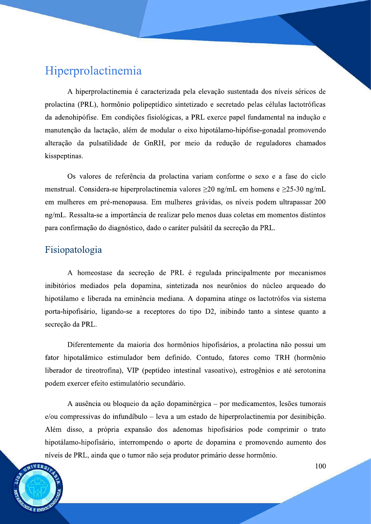 Hiperprolactinemia A hiperprolactinemia é caracterizada pela elevação sustentada dos níveis séricos de prolactina (PRL), hormônio polipeptídico sintetizado e secretado pelas células lactotróficas da adenohipófise. Em condições fisiológicas, a PRL exerce papel fundamental na indução e manutenção da lactação, além de modular o eixo promovendo alteração da pulsatilidade de GnRH, por meio da redução de reguladores chamados kisspeptinas. Os valores de referência da prolactina variam conforme o sexo e a fase do ciclo menstrual. Considera-se hiperprolactinemia valores >20 ng/mL em homens e ≥25-30 ng/mL em mulheres em pré-menopausa. Em mulheres grávidas, os níveis podem ultrapassar 200 ng/mL. Ressalta-se a importância de realizar pelo menos duas coletas em momentos distintos para confirmação do diagnóstico, dado o caráter pulsátil da secreção da PRL. Fisiopatologia A homeostase da secreção de PRL é regulada principalmente por mecanismos inibitórios mediados pela dopamina, sintetizada nos neurônios do núcleo arqueado do hipotálamo e liberada na eminência mediana. A dopamina atinge os lactotrófos via sistema porta-hipofisário, ligando-se a receptores do tipo D2, inibindo tanto a síntese quanto a secreção da PRL. Diferentemente da maioria dos hormônios hipofisários, a prolactina não possui um fator hipotalâmico estimulador bem definido. Contudo, fatores como TRH (hormônio liberador de tireotrofina), VIP (peptídeo intestinal vasoativo), estrogênios e até serotonina podem exercer efeito estimulatório secundário. A ausência ou bloqueio da ação dopaminérgica por medicamentos, lesões tumorais e/ou compressivas do infundíbulo leva a um estado de hiperprolactinemia por desinibição. Além disso, a própria expansão dos adenomas hipofisários pode comprimir o trato hipotálamo-hipofisário, interrompendo o aporte de dopamina e promovendo aumento dos níveis de PRL, ainda que o tumor não seja produtor primário desse hormônio. 100 EEtiologias A hiperprolactinemia pode ser classificada com base em sua origem. Causas fisiológicas Gravidez e lactação (aumento sustentado da PRL como preparação e manutenção da lactogênese). Estímulo mamilar persistente. Estresse físico ou emocional. Atividade física intensa. Sono, especialmente durante a fase REM. Causas farmacológicas Diversos fármacos interferem com o eixo dopaminérgico, aumentando os níveis séricos de PRL. Esses incluem: Antipsicóticos: Antipsicóticos de primeira geração são normalmente associados a hiperprolactinemia mais intensa (acima de 2 a 3 vezes o limite superior da normalidade). Como exemplo, tem-se risperidona, haloperidol e olanzapina. Antieméticos: Antieméticos bloqueadores do D2R estão entre as medicações mais comumente associadas à exemplo, tem-se metoclopramida, domperidona. Antidepressivos: Diferentes classes de antidepressivos podem induzir elevação de prolactina. Dentre a classe mais comum, os antidepressivos tricíclicos, tem-se a clorimipramina. Causas patológicas Prolactinomas: adenomas hipofisários secretores de PRL, representam a causa patológica mais comum. 101 EMacroadenomas hipofisários não-funcionantes: causam hiperprolactinemia por efeito de massa sobre a haste ou infundíbulo hipofisário, ao interromper o fluxo dopaminérgico, quando tradicionalmente denominados pseudo-prolactinomas. Hipotireoidismo primário: hiperprolactinemia foi encontrada em até 40% dos pacientes com hipotireoidismo primário e em até 22% daqueles com hipotireoidismo subclínico em alguns estudos. Doença renal crônica: comum em pacientes com DRC (23%-78%) e reconhecida como causa de hipogonadismo e disfunção sexual nesses pacientes, onde há redução da depuração, mas também aumento da secreção da PRL. Níveis de prolactina A magnitude da elevação da PRL pode ser útil para determinar a etiologia da hiperprolactinemia, pois valores mais altos são observados em pacientes com prolactinomas. Níveis de PRL > 150-250 ng/ml indicam a presença de um tumor secretor de prolactina (prolactinoma). Por outro lado, a maioria dos pacientes com hiperprolactinemia por compressão da haste hipofisária, induzida por fármacos ou doenças sistêmicas apresenta níveis de PRL 200-250 ng/ml, podendo alcançar 20.000 ng/ml ou mais. É também importante ressaltar que macroprolactinomas volumosos podem cursar com níveis de PRLManifestações Clínicas As manifestações clínicas resultam, principalmente, do hipogonadismo hipogonadotrófico induzido pela inibição da liberação de GnRH (hormônio liberador de gonadotrofinas), bem como dos efeitos diretos da PRL elevada nos tecidos-alvo e da massa tumoral, quando presente. Em mulheres Amenorreia secundária ou oligomenorreia. Infertilidade. Galactorreia (presente em 30-80% dos casos). Diminuição da libido. Secura vaginal, dispareunia. Osteopenia ou osteoporose. Em homens Redução da libido. Disfunção erétil. Infertilidade (devido à oligozoospermia). Ginecomastia (eventualmente com galactorreia). Massa muscular reduzida, diminuição da densidade mineral óssea. Efeito de massa tumoral (predomina no sexo masculino): cefaleia, comprometimento visual, dentre outros sintomas. Dosagem Laboratorial A dosagem sérica da prolactina é realizada, mais comumente, por imunoensaios quimioluminescentes ou eletroquimioluminescentes Para precisão diagnóstica, recomenda-se que a coleta seja realizada: Em jejum de pelo menos 8 horas. Após repouso de 30 minutos. 103 EPreferencialmente pela manhã, devido ao ritmo circadiano da secreção. Em casos de hiperprolactinemia moderada (valores 3 cm), deve-se considerar o efeito gancho ("hook effect"). Esse fenômeno é causado pelas altas concentrações de PRL com valores acima de 2.000 ng/mL, saturando os anticorpos em ensaio do "tipo sanduíche". Trata-se de um artefato laboratorial observado com alguns métodos laboratoriais ensaios imunorradiométricos e quimioluminesc