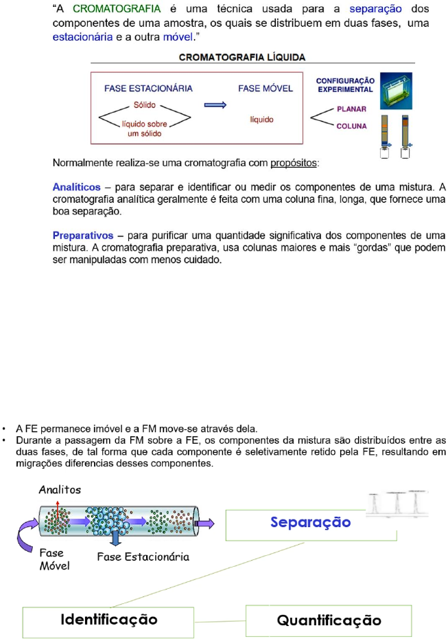 1 Análises Farmacêuticas MÓDULO 3 Felipe Carvalho, Julia Santos e Rodrigo Sales Aula 7: CLAE Introdução A cromatografia é uma técnica usada para a separação dos componentes de uma amostra, os quais se distribuem em duas fases, uma estacionária (FE) e outra móvel (FM). A fase estacionária é composta por um sólido ou um líquido sobre um sólido. Permanece imóvel. Já a fase móvel é constituída por um líquido. Move-se através da FE. A configuração do CLAE pode ser planar ou coluna. Normalmente, a CLAE é empregada com dois propósitos: • Analíticos: separar, identificar ou medir os componentes de uma mistura; geralmente, é feita com uma coluna fina, longa e que fornece uma boa separação com uma boa resolução sob alta pressão. • Preparativos: purificar uma quantidade significativa de componentes de uma mistura; usa colunas maiores (diâmetro mais elevado) e mais “gordas” que podem ser manipuladas com menos cuidado. Durante a passagem da FM sobre a FE, os componentes da mistura são distribuídos entre as duas fases de tal forma que cada componente é seletivamente re- tido pela FE, resultando em mi- grações diferenciais desses com- ponentes e obtendo a separação cromatográfica dos analitos pre- sentes. Com isso, é possível fazer a identificação (utiliza um pa- drão) e quantificação da amostra (informações relativas à área do pico cromatográfico). 2 A cromatografia de coluna simples ainda encontra conside- rável uso com propósitos prepa- rativos, principalmente na sín- tese de compostos orgânicos, onde é possível separá-los de acordo com a afinidade com a FM e destiná-los a outros méto- dos analíticos, como espectro- metria de massas, RMN e etc. A alta eficiência surgiu com o uso de colunas metálicas, onde a FM é deslocada por pres- sões elevadas, obtidas com auxí- lio de uma bomba de alta pres- são. Não é uma técnica de análise absoluta, pois necessita de calibração, ou seja, da utilização de pa- drões de substâncias químicas de referência que possam ser comparadas com as amostras com intuito de identificar e também quantificar essas amostras. Classificação da Cromatografia A cromatografia tem uma ampla classificação, considerando a técnica, FM, FE e o tipo de croma- tografia. Na cromatografia em coluna, é classificado em líquido-líquido, líquido-sólido, líquido-fase 3 ligada. Desse modo, a cromatografia é dividida em categorias com base no tipo de FM e FE ou no mecanismo de interação/separação do soluto entre a FE e a FM. Subdivisões da CLAE Tipo de FE e mecanismo de separação: • CLS: líquido-sólido; FE → sólida; mecanismo de adsorção; • CLL: líquido-líquido; FE → líquido que recobre um sólido; mecanismo de partição; • CLFL: líquida em fase ligada; FE → líquido ligado quimicamente a um suporte sólido; mecanismo de parti- ção; • CE: por exclusão; FE → gel que re- cobre um sólido com porosidade controlada; • CTI: troca-iônica; FE → sólida contém grupos ionizáveis - troca aniônica ou catiônica; • CA: cromatografia por afinidade; FE → sólida com moléculas ligantes para interação seletiva; • CLQ: cromatografia quiral; FE → sólida possui compostos carbonos assimétricos (C*) para interagir seletivamente com compostos quirais. Tipo de FE e de FM: • Na fase normal: composta por sílica gel e possui características extrema- mente polares e os solventes com ca- racterísticas opostas (apolares) • Na fase reversa: composta por sílica ligada quimicamente a grupos de baixa polaridade (ex: C18, C8, C4 e C2), ou seja, a FE é apolar e a FM é polar. Água, metanol e acetonitrila fre- quentemente usados nesse tipo de cro- matografia 4 Mecanismos de separação em CLAE 1) Cromatografia por adsorção • Forma clássica de cromatografia inicialmente introduzida • Utiliza uma FE sólida e uma FM líquida. • O soluto é adsorvido na superfície da partícula sólida da FE devido a interações químicas ou físicas através de processos de sorção-dessorção. • FE: a sílica-gel e alumina (Al2O3) são as únicas usadas. → O grau de retenção depende da polarização de cada molécula ou grupo funcional; → A medida que a polaridade do analito aumenta, maior é o tempo de retenção. • FM é não polar (hexano, heptano) com adição de solvente moderadamente polar (EtOAc, álcool) 2) Cromatografia por partição (absorção) • Mais aplicada em CLAE! • FE: suporte sólido de sílica rígida ou composições baseadas em sílica contendo na sua superfície uma fase líquida na forma de um filme fino com partículas de 1,5 à 10 μm. Essa cromatografia também é defi- nida como FE quimicamente ligada e uma das principais funções é fornecer diferentes polaridades a FE e também recheios estáveis e insolúveis na FM. Quando há forte adsorção ou retenção do soluto na coluna, deve-se aumentar a polaridade da FM para aumentar sua solubilidade na mesma e conseguir deslocar os solutos da FE. 5 • Regra geral: → Iguala-se a polaridade do soluto com a da FE → Usa-se uma FM com polaridade diferente da FE - Soluto e FM com polaridades muito semelhantes → gera rápida eluição → detecção ocorre no volume morto da coluna - Soluto e FE com polaridades muito semelhantes → gera alta retenção. O soluto e a FE devem apresentar polaridades semelhantes, enquanto a FM e a FE devem apresentar polaridades diferenciadas. O processo de interação entre “soluto x FE/FM” é devido ao equilíbrio de partição (solubilidade do soluto) entre as duas fases líquidas. Portanto, a volta de cada componente para a FM depende de sua solubilidade/polaridade ( o retorno do soluto que está interagindo com a FE para a FM é dependente da polaridade do mesmo, ou seja, da solubilidade dele na FM). A: mais polar C: menos polar É importante ob- servar que se a FM não for escolhida de forma correta (pola- ridade adequada), pode ocorrer a não 