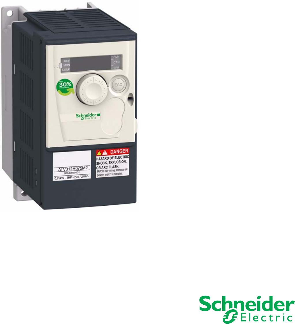 2354235 11/2008 BB V4 63 85 www.schneider-electric.com Altivar 312 Variable speed drives for asynchronous motors Programming manual 06/2010 BBV46385 06/2010 1 Contents Important information _______________________________________________________________________________________ 4 Before you begin______________________________________________________________________________________________ 5 Documentation structure________________________________________________________________________________________ 7 Software enhancements________________________________________________________________________________________ 8 Steps for setting up the drive ____________________________________________________________________________________ 9 Setup - Preliminary Recommendations ___________________________________________________________________________ 10 Factory configuration _________________________________________________________________________________________ 11 Basic functions ______________________________________________________________________________________________ 12 Remote display terminal option, ATV31 ___________________________________________________________________________ 14 Remote graphic display terminal option, ATV61/ATV71_______________________________________________________________ 15 Remote display terminal option, ATV12 ___________________________________________________________________________ 19 Structure of the parameter tables ________________________________________________________________________________ 20 Compatibility of functions ______________________________________________________________________________________ 21 List of functions that can be assigned to inputs/outputs _______________________________________________________________ 23 List of functions that can be assigned to the Network and Modbus control word bits ________________________________________ 25 Checklist ___________________________________________________________________________________________________ 26 Programming _______________________________________________________________________________________________ 27 [SPEED REFERENCE] (rEF-) menu _____________________________________________________________________________ 31 [SETTINGS] (SEt-) menu ______________________________________________________________________________________ 32 [MOTOR CONTROL] (drC-) menu _______________________________________________________________________________ 41 [INPUTS / OUTPUTS CFG] (I-O-) menu __________________________________________________________________________ 47 [COMMAND] (CtL-) menu______________________________________________________________________________________ 50 [COMMAND] (CtL-) menu______________________________________________________________________________________ 61 [APPLICATION FUNCT.] (FUn-) menu ___________________________________________________________________________ 62 [FAULT MANAGEMENT] (FLt-) menu ____________________________________________________________________________ 91 [COMMUNICATION] (COM-) menu ______________________________________________________________________________ 98 [MONITORING] (SUP-) menu _________________________________________________________________________________ 100 Migration ATV31 - ATV312____________________________________________________________________________________ 105 Diagnostics and troubleshooting________________________________________________________________________________ 106 Index of functions ___________________________________________________________________________________________ 111 Index of parameter codes and customer settings___________________________________________________________________ 112 Important information NOTICE Read these instructions carefully, and look at the equipment to become familiar with the device before trying to install, operate, or maintain it. The following special messages may appear throughout this documentation or on the equipment to warn of potential hazards or to call attention to information that clarifies or simplifies a procedure. PLEASE NOTE The word "drive" as used in this manual refers to the "controller portion" of the adjustable speed drive as defined by NEC. Electrical equipment should be installed, operated, serviced, and maintained only by qualified personnel. No responsibility is assumed by Schneider Electric for any consequences arising out of the use of this documentation. © 2009 Schneider Electric. All rights reserved. DANGER DANGER indicates an imminently hazardous situation which, if not avoided, will result in death, serious injury or equipment damage. WARNING WARNING indicates a potentially hazardous situation which, if not avoided, can result in death, serious injury or equipment damage. CAUTION CAUTION indicates a potentially hazardous situation which, if not avoided, can result in injury or equipment damage. CAUTION CAUTION, used without the safety alert symbol, indicates a potentially hazardous situation which, if not avoided, can result in equipment damage. The addition of this symbol to a Danger or Warning safety label indicates that an electrical hazard exists, which will result in personal injury if the instructions are not followed. This is the safety alert symbol. It is used to alert you to potential personal injury hazards. Obey all safety messages that follow this symbol to avoid possible injury or death. 4 BBV46385 06/2010 Before you begin Read and understand these instructions before performing any procedure with this drive. DANGER HAZARD OF ELECTRIC SHOCK, EXPLOSION, OR ARC FLASH • Read and understand this manual before installing or operating the Altivar 312 drive. Installation, adjustment, repair, and maintenance must be performed by qualified personnel. • The user is responsible for compliance with all international and national electrical code requirements with respect to grounding of all equipment. • Many parts of this drive, including the printed circuit bo