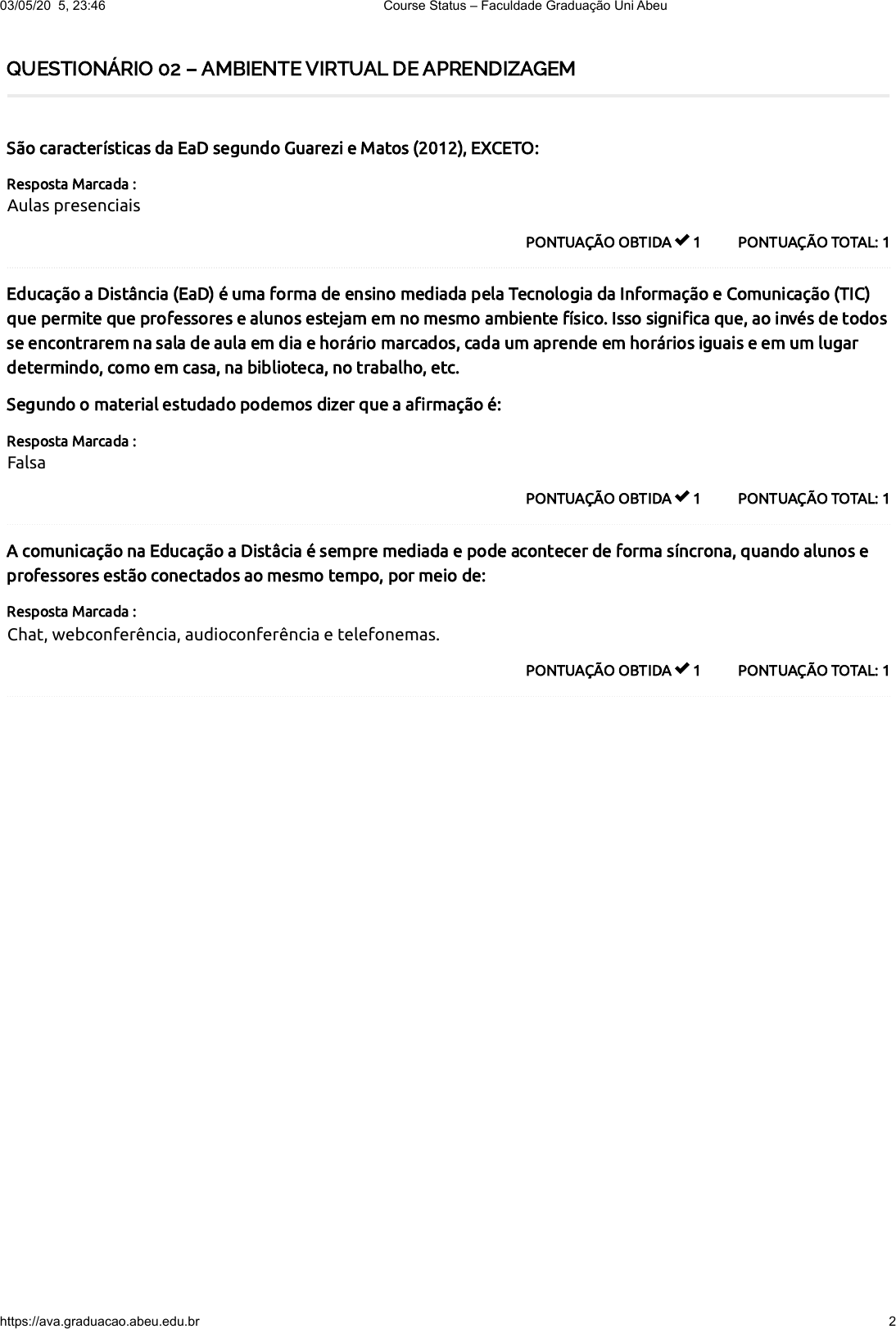 QUESTIONÁRIO 02 – AMBIENTE VIRTUAL DE APRENDIZAGEM PONTUAÇÃO TOTAL: 1PONTUAÇÃO OBTIDA 1 São características da EaD segundo Guarezi e Matos (2012), EXCETO: Resposta Marcada : Aulas presenciais PONTUAÇÃO TOTAL: 1PONTUAÇÃO OBTIDA 1 Educação a Distância (EaD) é uma forma de ensino mediada pela Tecnologia da Informação e Comunicação (TIC) que permite que professores e alunos estejam em no mesmo ambiente físico. Isso significa que, ao invés de todos se encontrarem na sala de aula em dia e horário marcados, cada um aprende em horários iguais e em um lugar determindo, como em casa, na biblioteca, no trabalho, etc. Segundo o material estudado podemos dizer que a afirmação é: Resposta Marcada : Falsa PONTUAÇÃO TOTAL: 1PONTUAÇÃO OBTIDA 1 A comunicação na Educação a Distâcia é sempre mediada e pode acontecer de forma síncrona, quando alunos e professores estão conectados ao mesmo tempo, por meio de: Resposta Marcada : Chat, webconferência, audioconferência e telefonemas. 03/05/2025, 23:46 Course Status – Faculdade Graduação Uni Abeu https://ava.graduacao.abeu.edu.br/course-status/ 1/2 3 / 5 PONTUAÇÃO TOTAL: 1PONTUAÇÃO OBTIDA 0 Sobre a modalidade de Educação a Distância no Brasil, julgue as afirmações a seguir. I- O surgimento da EaD no Brasil tem uma trajetória histórica ampla, mas a definição da origem é um tema polêmico, pois nem sempre os estudiosos concordam em todos os pontos. II- No Brasil, a base legal do modelo de Educação a Distância é determinada pela Lei 9.394/1996, Lei de Diretrizes e Bases da Educação Nacional – LDB, cujo nome já indica que são estabelecidas as diretrizes e fundamentos da educação nacional.. III- Segundo Maia e Matar (2007), a EaD é um modelo de educação em que professores e alunos são unidos, planejados pela instituição, e utilizam limitados tecnologias de comunicação. IV- A EaD pressupõe uma combinação de tecnologias tradicionais e modernas que permitem que o aprendizado individual ou em grupo seja combinado com atividades presenciais específicas, como sessões de aprendizado em grupo e avaliações, seja no local de trabalho ou externamente por meio de ensino a distância e métodos de treinamento Resposta Marcada : I e II estão corretas PONTUAÇÃO TOTAL: 1PONTUAÇÃO OBTIDA 0 Segundo Moore e Kearsley (2007), a EaD evoluiu ao longo da história e pode ser dividida em cinco gerações distintas. Sobre essas gerações enumere a 2ª coluna de acordo com a 1ª coluna. 1- Primeira geração 2- Segunda geração 3- Terceira geração 4- Quarta geração 5- Quinta geração ( ) Ensino via televisão aberta. ( ) Caracterizada pela interação remota em tempo real, em cursos de áudio e videoconferência. ( ) Envolvendo aulas online, virtuais e ensino e aprendizagem em universidades com base no estudo de tecnologias da Internet. ( ) Caracterizada pela comunicação textual via correspondência. ( ) Caracterizada principalmente pela invenção da a Universidade Aberta. Assinale a sequência CORRETA: Resposta Marcada : 4-3-1-2-5 Total de Pontos 03/05/2025, 23:46 Course Status – Faculdade Graduação Uni Abeu https://ava.graduacao.abeu.edu.br/course-status/ 2/2