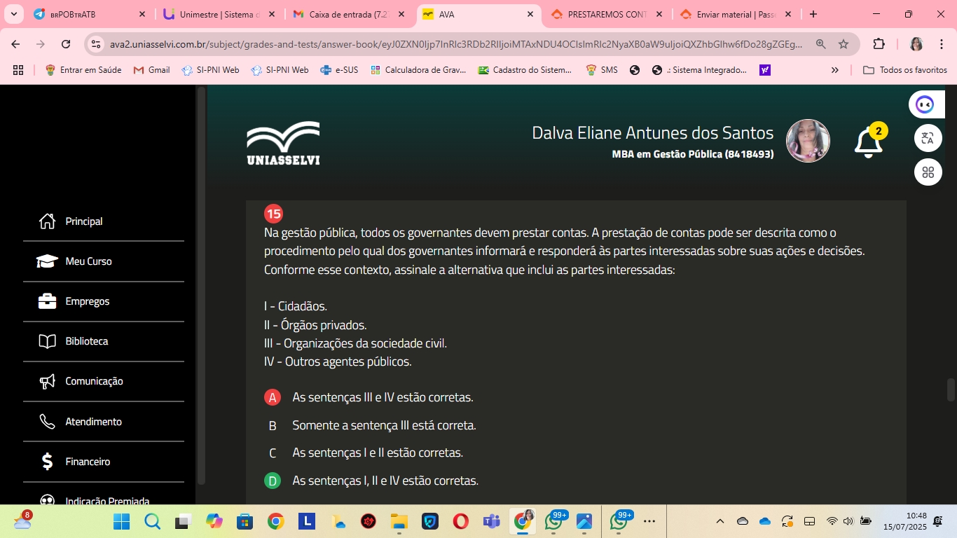 BRPOBTRATB Unimestre Sistema Caixa de entrada (7.2 AVA PRESTAREMOS CONT Enviar material Pass + X : Entrar em Saúde Gmail SI-PNI Web SI-PNI Web e-SUS Calculadora de Grav... Cadastro do Sistem... SMS Sistema Integrado... » Todos os favoritos Dalva Eliane Antunes dos Santos 2 MBA em Gestão Pública (8418493) UNIASSELVI 15 Principal Na gestão pública, todos governantes devem prestar contas. A prestação de contas pode ser descrita como 0 procedimento pelo qual dos governantes informará e responderá às partes interessadas sobre suas ações e decisões. Meu Curso Conforme esse contexto, assinale a alternativa que inclui as partes interessadas: Empregos Cidadãos. II - Órgãos privados. Biblioteca III - Organizações da sociedade civil. IV Outros agentes públicos. Comunicação A As sentenças III e IV estão corretas. Atendimento Somente a sentença III está correta. $ As sentenças e II estão corretas. Financeiro D As sentenças I, e IV estão corretas. Indicação Premiada 8 99- 99- 10:48 L 15/07/2025