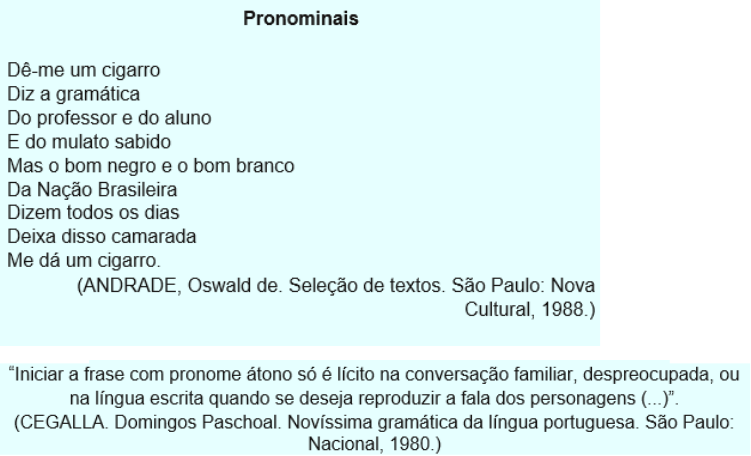 Questão 01 (ENEM) O uso do pronome átono no início das frases é destacado por um poeta e por um gramático nos textos abaixo. Comparando a explicação dada pelos autores sobre essa regra, pode-se afirmar que ambos: Clique na sua resposta abaixo · Relativizam essa regra gramatical. · Afirmam que não há regras para uso de pronomes. · Condenam essa regra gramatical. · Criticam a presença de regras na gramática. · Acreditam que apenas os esclarecidos sabem essa regra. Questão 02 O mundo da ¬____________________________é particular e múltiplo concomitantemente. Ele é singular quando revela o Ser na sua forma única de existir e é múltiplo quando é fruto da experiência de mundo vivida. Portanto, a poesia é a maneira do homem reconhecer o mundo, mas ela só se revela quando o homem é aceito pelo mundo. Por isso, ao entregar-se ao mundo, de ser parte dele, o homem se percebe dentro da cultura em que está inserido. (FERREIRA, 2011). Marque a opção que completa corretamente a frase. Clique na sua resposta abaixo · Narrativa. · Poesia. · Narrativa épica. · Narrativa mítica. · Lírica. Questão 03 Mello (2002) ainda explica que a poesia fala através das imagens _________________. Marque a opção que completa corretamente a frase. Clique na sua resposta abaixo · irreal. · do fantástico. · narrativas · de mundo. · líricas Questão 04 (PREFEITURA DE ROSEIRA/SP - ADAPTADA) Sobre o barroco: I.A literatura barroca no Brasil foi introduzida pelos portugueses, quando não havia uma produção cultural significante no país. II.A produção literária nesse período não é reconhecida como genuinamente nacional, mas um estilo absorvido e resultante do período colonial. III.Sua linguagem é rebuscada e ambígua. Caracteriza-se por utilizar largamente figuras linguagem: metáfora; antítese; o paradoxo; e a sinestesia. IV.Neste período tem destaque: Gregório de Matos, por suas poesias, e o padre Antônio Vieira, por seus sermões. Além deles, temos Bento Teixeira (1561-1600), autor do poema Prosopopéia, de 1601, que costuma ser considerado o marco inicial do Barroco brasileiro. Assinale a alternativa correta. Clique na sua resposta abaixo · I, II, III e IV. · II, III e IV. · I e II. · Nenhuma das anteriores. · I, II e III. Questão 05 UFSC As aparências revelam Afirma uma Firma que o Brasil confirma: “Vamos substituir o Café pelo Aço”. Vai ser duríssimo descondicionar o paladar Não há na violência que a linguagem imita algo da violência propriamente dita? CACASO. As aparências revelam. In: WEINTRAUB, Fabio (Org). Poesia marginal. São Paulo: Ática, 2004. p. 61. Para gostar de ler 39. Com base na leitura do poema, assinale a(s) proposição (ões) correta (s) acerca da Poesia Marginal: I. Entre as temáticas das quais se ocupou a poesia marginal da década de 1970, havia espaço para painéis sociais, para a memória afetiva e a pesquisa poética e para o registro literário da intimidade. Sem grandes exageros, a única regra era atender aos princípios da norma padrão da língua. II. Os versos “Vai ser duríssimo descondicionar / o paladar” podem ser entendidos metaforicamente como uma referência a sacrifícios impostos à população, obrigada a acomodar-se a uma nova ordem econômica. III. Nos poemas reunidos em Poesia marginal, os autores enfocam a denúncia e a crítica social de uma maneira sisuda, sem apelar para o humor, pois visam conferir credibilidade ao que é dito. IV. A frase “Vamos substituir o Café pelo Aço” pode ser interpretada como uma referência à abertura do país para a exportação de minérios, defendida por empresários e pelo Governo à época da Ditadura Militar. V. No primeiro e segundo versos, no jogo de palavras “Afirma”, “Firma” e “confirma”, repete-se o segmento firma; isso pode ser interpretado como uma referência à influência das grandes empresas nas políticas estatais. VI. Na estrofe final, observa-se como Cacaso procura desvincular a linguagem das práticas sociais, ao propor que não há violência nas palavras em si, mas apenas na realidade a que elas se referem. Clique na sua resposta abaixo · II, V e VI. · I, II e IV. · II, IV e V. · I, III e V. · Apenas VI. Questão 06 Leia o trecho abaixo: A ______________________ é uma ciência que prioriza o estudo das manifestações literárias, dessa maneira, considerá-la como ciência significa afirmar que corresponde a uma área do conhecimento que requer pessoas especializadas – peritos (técnicos) detentores de competências especializadas para exercê-la. Assinale a opção que completa corretamente o trecho acima. Clique na sua resposta abaixo · teoria literária · critica jornalística · historiografia · literatura comparada · crítica literária Questão 07 (ENEM) A poesia que floresceu nos anos 70 do século XX é inquieta, anárquica, contestadora. A “poesia marginal”, como ficou conhecida, não se filia a nenhuma estética literária em particular, embora seja possível ver nela traços de algumas vanguardas que a precederam, como no poema a seguir. S.O.S Chacal (...) nós que não somos médicos psiquiatras nem ao menos bons cristãos nos dedicamos a salvar pessoas que como nós sofrem de um mal misterioso: o sufoco CAMPEDELLI, Samira Y. Poesia Marginal dos Anos 70. São Paulo: Scipione, 1995 (adaptado). Da leitura do poema e do texto crítico acima, infere-se que a poesia dos anos 70: Clique na sua resposta abaixo · valorizou a linguagem poética das formas consagradas. · atribuiu ao espaço poético um lugar de fuga e escapismo. · utilizou com frequência versos metrificados e temas românticos. · eliminou o diálogo com as artes visuais e as artes plásticas. · recuperou traços da produção de vanguarda modernista. Questão 08 (ENEM/2019) Essa lua enlutada, esse desassossego A convulsão de dentro, ilharga Dentro da solidão, corpo morrendo Tudo isso te devo. E eram tão vastas As coisas planeja