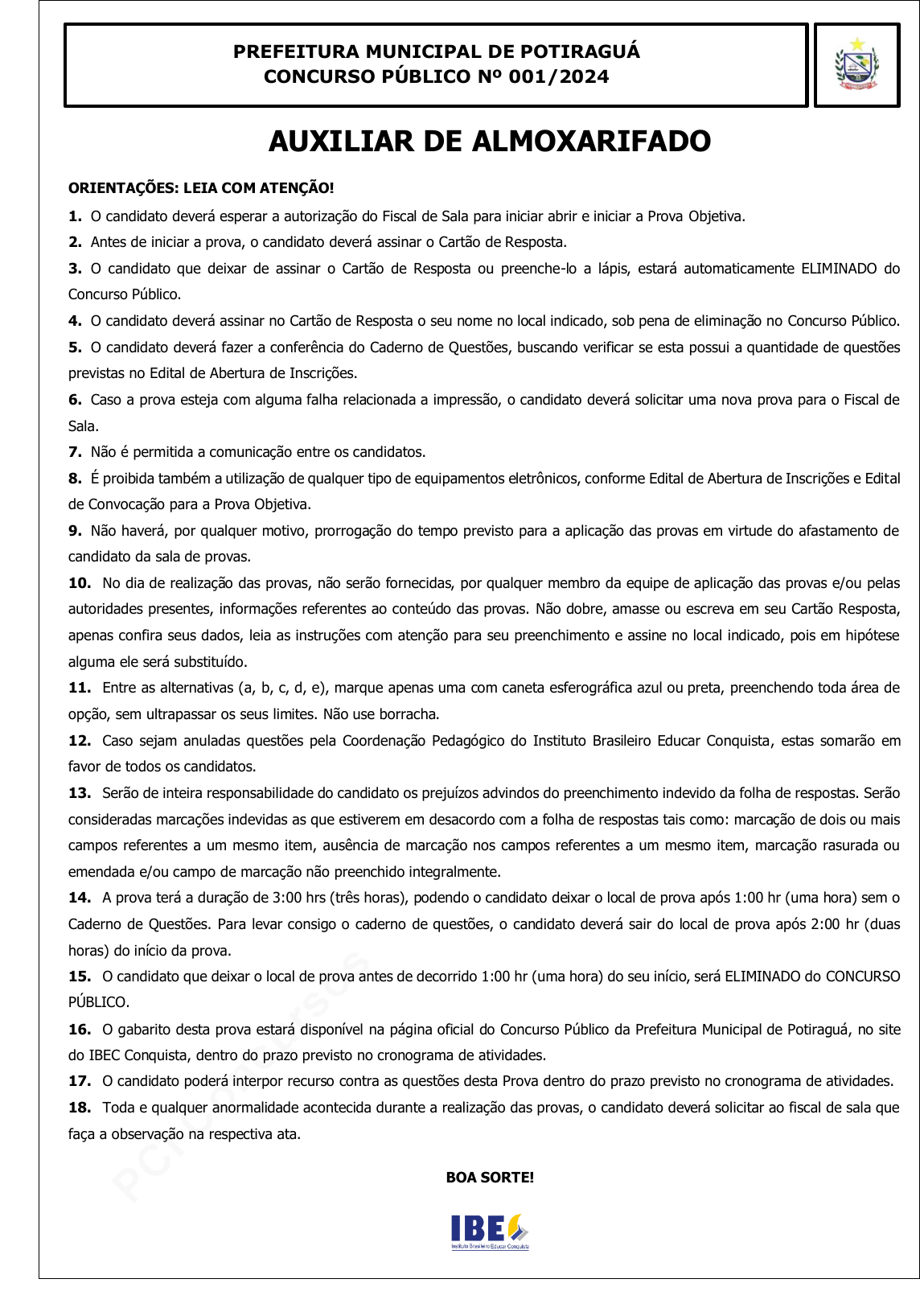 pcimarkpci MDAwMDowMDAwOjAwMDA6MDAwMDowMDAwOmZmZmY6YWE1NToxMmMy:VHVlLCAxNSBKdWwgMjAyNSAxODoyNDoxNiAtMDMwMA== www.pciconcursos.com.br AUXILIAR DE ALMOXARIFADO ORIENTAÇÕES: LEIA COM ATENÇÃO! 1. O candidato deverá esperar a autorização do Fiscal de Sala para iniciar abrir e iniciar a Prova Objetiva. 2. Antes de iniciar a prova, o candidato deverá assinar o Cartão de Resposta. 3. O candidato que deixar de assinar o Cartão de Resposta ou preenche-lo a lápis, estará automaticamente ELIMINADO do Concurso Público. 4. O candidato deverá assinar no Cartão de Resposta o seu nome no local indicado, sob pena de eliminação no Concurso Público. 5. O candidato deverá fazer a conferência do Caderno de Questões, buscando verificar se esta possui a quantidade de questões previstas no Edital de Abertura de Inscrições. 6. Caso a prova esteja com alguma falha relacionada a impressão, o candidato deverá solicitar uma nova prova para o Fiscal de Sala. 7. Não é permitida a comunicação entre os candidatos. 8. É proibida também a utilização de qualquer tipo de equipamentos eletrônicos, conforme Edital de Abertura de Inscrições e Edital de Convocação para a Prova Objetiva. 9. Não haverá, por qualquer motivo, prorrogação do tempo previsto para a aplicação das provas em virtude do afastamento de candidato da sala de provas. 10. No dia de realização das provas, não serão fornecidas, por qualquer membro da equipe de aplicação das provas e/ou pelas autoridades presentes, informações referentes ao conteúdo das provas. Não dobre, amasse ou escreva em seu Cartão Resposta, apenas confira seus dados, leia as instruções com atenção para seu preenchimento e assine no local indicado, pois em hipótese alguma ele será substituído. 11. Entre as alternativas (a, b, c, d, e), marque apenas uma com caneta esferográfica azul ou preta, preenchendo toda área de opção, sem ultrapassar os seus limites. Não use borracha. 12. Caso sejam anuladas questões pela Coordenação Pedagógico do Instituto Brasileiro Educar Conquista, estas somarão em favor de todos os candidatos. 13. Serão de inteira responsabilidade do candidato os prejuízos advindos do preenchimento indevido da folha de respostas. Serão consideradas marcações indevidas as que estiverem em desacordo com a folha de respostas tais como: marcação de dois ou mais campos referentes a um mesmo item, ausência de marcação nos campos referentes a um mesmo item, marcação rasurada ou emendada e/ou campo de marcação não preenchido integralmente. 14. A prova terá a duração de 3:00 hrs (três horas), podendo o candidato deixar o local de prova após 1:00 hr (uma hora) sem o Caderno de Questões. Para levar consigo o caderno de questões, o candidato deverá sair do local de prova após 2:00 hr (duas horas) do início da prova. 15. O candidato que deixar o local de prova antes de decorrido 1:00 hr (uma hora) do seu início, será ELIMINADO do CONCURSO PÚBLICO. 16. O gabarito desta prova estará disponível na página oficial do Concurso Público da Prefeitura Municipal de Potiraguá, no site do IBEC Conquista, dentro do prazo previsto no cronograma de atividades. 17. O candidato poderá interpor recurso contra as questões desta Prova dentro do prazo previsto no cronograma de atividades. 18. Toda e qualquer anormalidade acontecida durante a realização das provas, o candidato deverá solicitar ao fiscal de sala que faça a observação na respectiva ata. BOA SORTE! PREFEITURA MUNICIPAL DE POTIRAGUÁ CONCURSO PÚBLICO Nº 001/2024 pcimarkpci MDAwMDowMDAwOjAwMDA6MDAwMDowMDAwOmZmZmY6YWE1NToxMmMy:VHVlLCAxNSBKdWwgMjAyNSAxODoyNDoxNiAtMDMwMA== www.pciconcursos.com.br Concurso Público da Prefeitura Municipal de Potiraguá | I N S T I T U T O B R A S I L E I R O E D U C A R C O N Q U I S T A 2 | P á g i n a LÍNGUA PORTUGUESA QUESTÕES DE 01 A 10 FRASEADOR Hoje eu completei oitenta e cinco anos. O poeta nasceu de treze. Naquela ocasião escrevi uma carta aos meus pais, que moravam na fazenda, contando que eu já decidira o que queria ser no meu futuro. Que eu não queria ser doutor. Nem doutor de curar nem doutor de fazer casa nem doutor de medir terras. Que eu queria era ser fraseador. Meu pai ficou meio vago depois de ler a carta. Minha mãe inclinou a cabeça. Eu queria ser fraseador e não doutor. Então, o meu irmão mais velho perguntou: Mas esse tal de fraseador bota mantimento em casa? Eu não queria ser doutor, eu só queria ser fraseador. Meu irmão insistiu: Mas se fraseador não bota mantimento em casa, nós temos que botar uma enxada na mão desse menino pra ele deixar de variar. A mãe baixou a cabeça um pouco mais. O pai continuou meio vago. Mas não botou enxada. (Memórias inventadas – A infância. São Paulo. Planeta 2003.) 01. Os tempos verbais predominantes no texto sugerem que tipo de relato? a) De fatos do presente. b) Que faz projeções para o futuro. c) De fatos do passado d) Atemporal e) Nenhuma das alternativas. 02. Em: “Que eu não queria ser doutor. Nem doutor de curar nem doutor de fazer casa nem doutor de medir terras.” Em conformidade com o trecho apresentado, percebe-se claramente que o narrador não queria ser, nessa ordem: a) Arquiteto, médico, agrônomo. b) Escritor, médico, arquiteto. c) Médico, engenheiro, agrônomo. d) Médico, engenheiro, arquiteto. e) Médico engenheiro escritor. 03. De acordo com o texto, em que o narrador explicita que queria ser fraseador, na carta escrita aos pais, pode-se inferir: a) O desejo do narrador de ser fraseador nasceu na maturidade e provocou preconceito na família. b) O desejo do narrador de ser escritor nasceu na adolescência e provocou preconceito no seu irmão mais velho. c) O narrador queria ser cantador na adolescência e teve apoio de toda a família. d) O narrador queria ser orador na maturidade e teve todo apoio familiar. e) O narrador só queria assustar a família. 04. Analise o trecho apresentado abaixo. “Meu irmão 