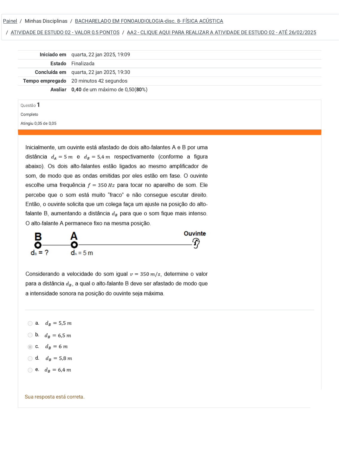 Iniciado em quarta, 22 jan 2025, 19:09 Estado Finalizada Concluída em quarta, 22 jan 2025, 19:30 Tempo empregado 20 minutos 42 segundos Avaliar 0,40 de um máximo de 0,50(80%) Questão 1 Completo Atingiu 0,05 de 0,05 a. b. c. d. e. Sua resposta está correta. Painel / Minhas Disciplinas / BACHARELADO EM FONOAUDIOLOGIA-disc. 8- FÍSICA ACÚSTICA / ATIVIDADE DE ESTUDO 02 - VALOR 0,5 PONTOS / AA2 - CLIQUE AQUI PARA REALIZAR A ATIVIDADE DE ESTUDO 02 - ATÉ 26/02/2025 https://www.eadunifatecie.com.br/course/view.php?id=59384 https://www.eadunifatecie.com.br/course/view.php?id=59384 https://www.eadunifatecie.com.br/my/ https://www.eadunifatecie.com.br/course/view.php?id=59384 https://www.eadunifatecie.com.br/course/view.php?id=59384#section-9 https://www.eadunifatecie.com.br/mod/quiz/view.php?id=2104854 Questão 2 Completo Atingiu 0,05 de 0,05 a. b. c. d. e. Sua resposta está correta. Questão 3 Completo Atingiu 0,05 de 0,05 a. b. c. d. e. Sua resposta está correta. Questão 4 Completo Atingiu 0,05 de 0,05 a. b. c. d. e. Sua resposta está correta. Questão 5 Completo Atingiu 0,05 de 0,05 a. b. c. d. e. Sua resposta está correta. Questão 6 Completo Atingiu 0,05 de 0,05 a. b. c. d. e. Sua resposta está correta. Questão 7 Completo Atingiu 0,05 de 0,05 a. b. c. d. e. Sua resposta está correta. Questão 8 Completo Atingiu 0,00 de 0,05 a. b. c. d. e. Sua resposta está incorreta. Questão 9 Completo Atingiu 0,00 de 0,05 a. b. c. d. e. Sua resposta está incorreta. Questão 10 Completo Atingiu 0,05 de 0,05 a. b. c. d. e. Sua resposta está correta. ← CLIQUE AQUI PARA REALIZAR O FÓRUM DE DISCUSSÃO Seguir para... ENQUETE DE SATISFAÇÃO - EAD UNIFATECIE → https://www.eadunifatecie.com.br/mod/forum/view.php?id=2104853&forceview=1 https://www.eadunifatecie.com.br/mod/feedback/view.php?id=2104855&forceview=1