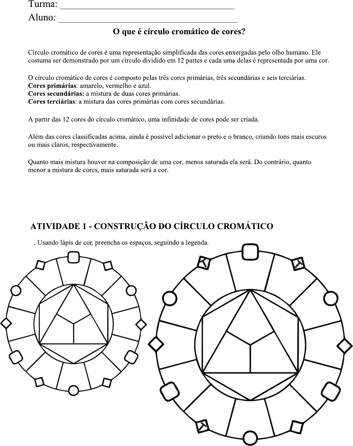 E.M.E.F. PROFESSOR CESAR YASIGI PROFESSORA CHRISTIANE MARTINS ARTES AZUL CIANO VERMELHO AMARELO V E R D E L A R A N JA VIOLETA L A R A N JA AMARELO V E R D E A Z U L C IA N O V E R M E L H O VIOLETA AMARELO VERDE AZUL VIOLETA AMARELO LARANJA V E R M E L H O L A R A N J AA Z U L V E R D E VERMELHO VIOLETA P PP S S S T TT T T T LEGENDA P = PRIMÁRIA \ S = SECUNDÁRIA \ T = TERCIÁRIA 1 - AMARELO 2- AMARELO LARANJA 3- LARANJA 4- VERMELHO LARANJA 5- VERMELHO 6- VERMELHO VIOLETA 7 - VIOLETA 8- AZUL VIOLETA 9- AZUL CIANO 10- AZUL VERDE 11- VERDE 12- AMARELO VERDE P PP S S S T TT T T T 1 1 2 3 4 5 678 9 10 11 12 11 3 59 7 AZUL CIANO VERMELHO AMARELO V E R D E L A R A N JA VIOLETA L A R A N JA AMARELO V E R D E A Z U L C IA N O V E R M E L H O VIOLETA AMARELO VERDE AZUL VIOLETA AMARELO LARANJA V E R M E L H O L A R A N J AA Z U L V E R D E VERMELHO VIOLETA P PP S S S T TT T T T Além, do círculo cromático existe as cores frias e cores quentes. Cores frias: violeta, azul violeta, azul ciano, azul verde, verde, amarelo verde. Cores quentes: amarelo, amarelo laranja, vermelho laranja, vermelho, vermelho violeta CÍRCULO CROMÁTICO LEGENDA P = PRIMÁRIA \ S = SECUNDÁRIA \ T = TERCIÁRIA 1 - AMARELO 2- AMARELO LARANJA 3- LARANJA 4- VERMELHO LARANJA 5- VERMELHO 6- VERMELHO VIOLETA 7 - VIOLETA 8- AZUL VIOLETA 9- AZUL CIANO 10- AZUL VERDE 11- VERDE 12- AMARELO VERDE Professora Christiane Martins P PP S S S T TT T T T 1 2 3 4 5 67 8 9 10 11 12 1 9 5 11 3 7 CÍRCULO CROMÁTICO LEGENDA P = PRIMÁRIA \ S = SECUNDÁRIA \ T = TERCIÁRIA 1 - AMARELO 2- AMARELO LARANJA 3- LARANJA 4- VERMELHO LARANJA 5- VERMELHO 6- VERMELHO VIOLETA 7 - VIOLETA 8- AZUL VIOLETA 9- AZUL CIANO 10- AZUL VERDE 11- VERDE 12- AMARELO VERDE Professora Christiane Martins P PP S S S T TT T T T 1 2 3 4 5 67 8 9 10 11 12 1 9 5 11 3 7 Página 1 Página 2