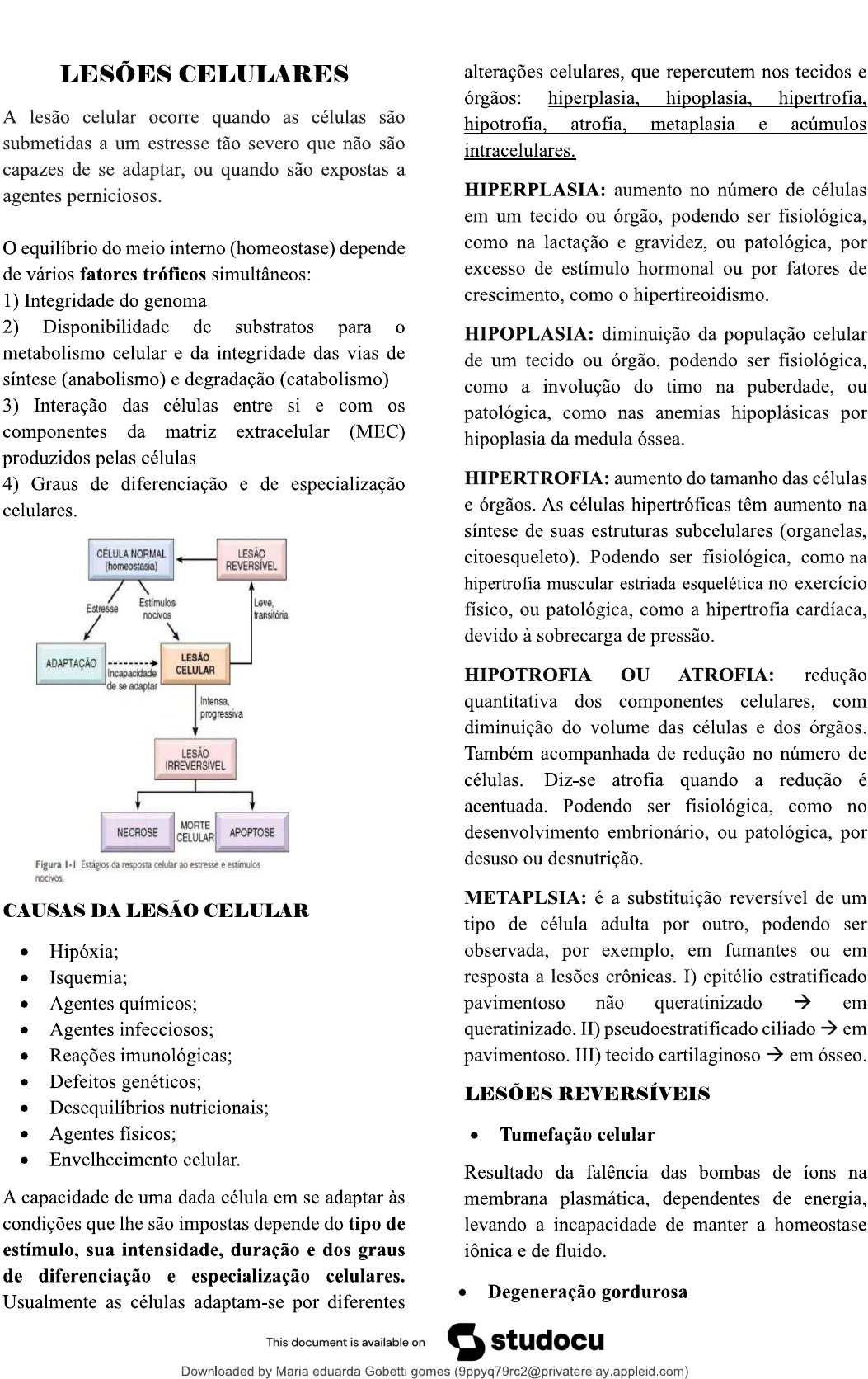 LESÕES CELULARES alterações celulares, que repercutem nos tecidos e órgãos: hiperplasia, hipoplasia, hipertrofia, A lesão celular ocorre quando as células são hipotrofia, atrofia, metaplasia e acúmulos submetidas a um estresse tão severo que não são intracelulares. capazes de se adaptar, ou quando são expostas a agentes perniciosos. HIPERPLASIA: aumento no número de células em um tecido ou órgão, podendo ser fisiológica, O equilíbrio do meio interno (homeostase) depende como na lactação e gravidez, ou patológica, por de vários fatores tróficos simultâneos: excesso de estímulo hormonal ou por fatores de 1) Integridade do genoma crescimento, como o hipertireoidismo. 2) Disponibilidade de substratos para o HIPOPLASIA: diminuição da população celular metabolismo celular e da integridade das vias de de um tecido ou órgão, podendo ser fisiológica, síntese (anabolismo) e degradação (catabolismo) como a involução do timo na puberdade, ou 3) Interação das células entre si e com os patológica, como nas anemias hipoplásicas por componentes da matriz extracelular (MEC) hipoplasia da medula óssea. produzidos pelas células 4) Graus de diferenciação e de especialização HIPERTROFIA: aumento do tamanho das células celulares. e órgãos. As células hipertróficas têm aumento na síntese de suas estruturas subcelulares (organelas, CÉLULA NORMAL LESÃO (homeostasia) REVERSÍVEL citoesqueleto). Podendo ser fisiológica, como na hipertrofia muscular estriada esquelética no exercício Estímulos Estresse Leve, nocivos transitória físico, ou patológica, como a hipertrofia cardíaca, devido à sobrecarga de pressão. LESÃO ADAPTAÇÃO Incapacidade CELULAR HIPOTROFIA OU ATROFIA: redução de se adaptar Intensa, quantitativa dos componentes celulares, com progressiva diminuição do volume das células e dos órgãos. LESÃO Também acompanhada de redução no número de IRREVERSÍVEL células. Diz-se atrofia quando a redução é acentuada. Podendo ser fisiológica, como no MORTE NECROSE CELULAR APOPTOSE desenvolvimento embrionário, ou patológica, por Figura Estágios da resposta celular ao estresse e estímulos desuso ou desnutrição. nocivos. CAUSAS DA LESÃO CELULAR METAPLSIA: é a substituição reversível de um tipo de célula adulta por outro, podendo ser Hipóxia; observada, por exemplo, em fumantes ou em Isquemia; resposta a lesões crônicas. I) epitélio estratificado Agentes químicos; pavimentoso não queratinizado em Agentes infecciosos; queratinizado. II) pseudoestratificado ciliado em Reações imunológicas; pavimentoso. III) tecido cartilaginoso em ósseo. Defeitos genéticos; LESÕES REVERSÍVEIS Desequilíbrios nutricionais; Agentes físicos; Tumefação celular Envelhecimento celular. Resultado da falência das bombas de íons na A capacidade de uma dada célula em se adaptar às membrana plasmática, dependentes de energia, condições que lhe são impostas depende do tipo de levando a incapacidade de manter a homeostase estímulo, sua intensidade, duração e dos graus iônica e de fluido. de diferenciação e especialização celulares. Usualmente as células adaptam-se por diferentes Degeneração gordurosa This document is available on studocu Downloaded by Maria eduarda Gobetti gomes (9ppyq79rc2@privaterelay.appleid.com)Surgimento de vacúolos lipídicos, grandes ou Involução celular hormônio-dependente pequenos, no citoplasma. (mama após lactação); Controle da proliferação celular epitelial e linfocitária; CÉLULA CÉLULA NORMAL NORMAL Morte celular tumoral; Mortes linfocitárias T e ou induzida por Lesão Recuperação linfócitos T citotóxicos; Condensação da Tumefação Morte de neutrófilos na reação inflamatória; do Bolhas Figura na membrana de mielina 0 Atrofia parenquimal, após obstrução ductal; Bolhas no membrana Fragmentação celular Lesão Secundária às infecções virais [Corpúsculo de progressiva Rompimento Figuras das membranas Corpo Councilman no figado]; APOPTOSE de mielina do das organelas extravasamento Induzida por radiação, hipoxia, drogas, etc dos Inflamação NECROSE (dano no DNA); Fagocitose Fagócito das celulas dos fragmentos Densidades na Acúmulo de proteínas mal-dobradas (estresse Figura celulares da necrose (esquerda) da apoptose do Retículo Endoplasmático) MECANISMOS DE LESÃO CELULAR Envelhecimento e perda de ancoragem com a matriz extracelular ou com outras células. Redução da síntese de ATP; VIA MITOCONDRIAL (INTRÍNSECA) Lesão mitocondrial; Influxo de cálcio e perda de K+; Lesão de DNA e mal dobramento de proteínas; Acúmulo de espécies reativas do oxigênio e de Sinais bioquímicos de permeabilidade da radicais livres; mitocôndria; Aumento da permeabilidade das membranas Mecanismos sinalizadores inibem proteínas Bcl2 celulares e das organelas- necrose; do tipo Bh3 e ativam as proteínas Bax e Bak; Acúmulo de DNA danificado e proteínas mal Criação de canais na membrana mitocondrial; dobradas apoptose. - Passagem do citocromo C para o citosol; APOPTOSE Citocromo C + Apafl atua na catálise procaspase 9 em caspase 9; A apoptose é um tipo de morte celular programada, A caspase 9 catalise a procaspase 3 em caspase ativada por diversas causas fisiológicas e 3. patológicas, envolvendo a ativação de enzimas VIA EXTRÍNSECA (RECEPTOR DE intracelulares, especialmente as caspases. Isso leva MORTE) à redução do volume celular, fragmentação e Receptores TNF I (fator de necrose tumoral) e Fas condensação de seus constituintes, formando (CD95); corpos apoptóticos. Esses corpos são liberados como vesículas extracelulares e fagocitados por NECROSE células próximas ou macrófagos. Não há autólise A necrose é um conjunto de alterações nem reação inflamatória associada. A apoptose morfológicas que ocorrem no organismo vivo após pode ocorrer em células isoladas ou pequenos a morte celular em grande número de células, grupos, e por vezes as c